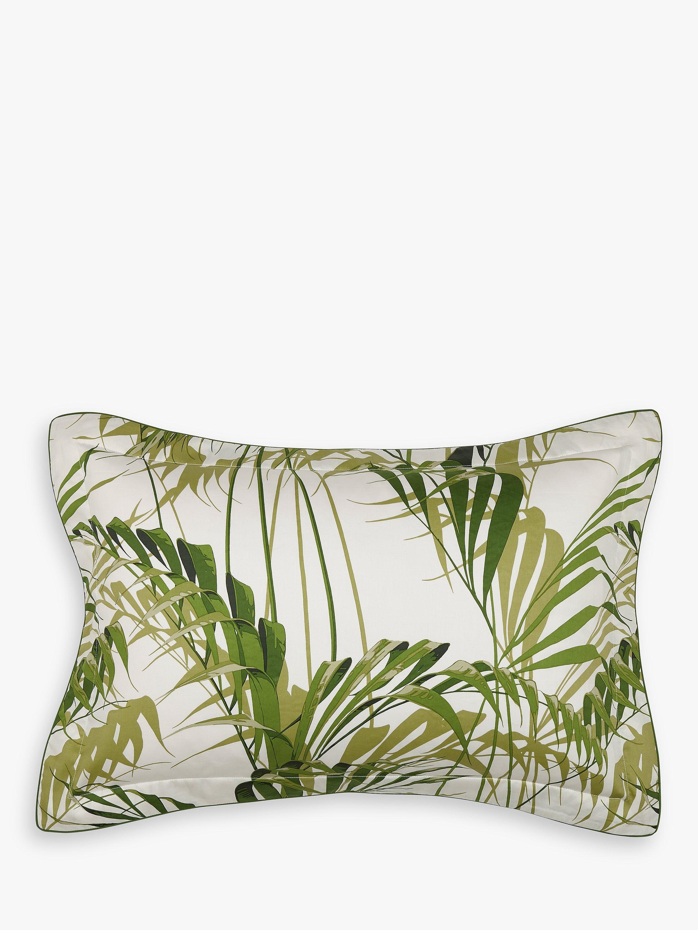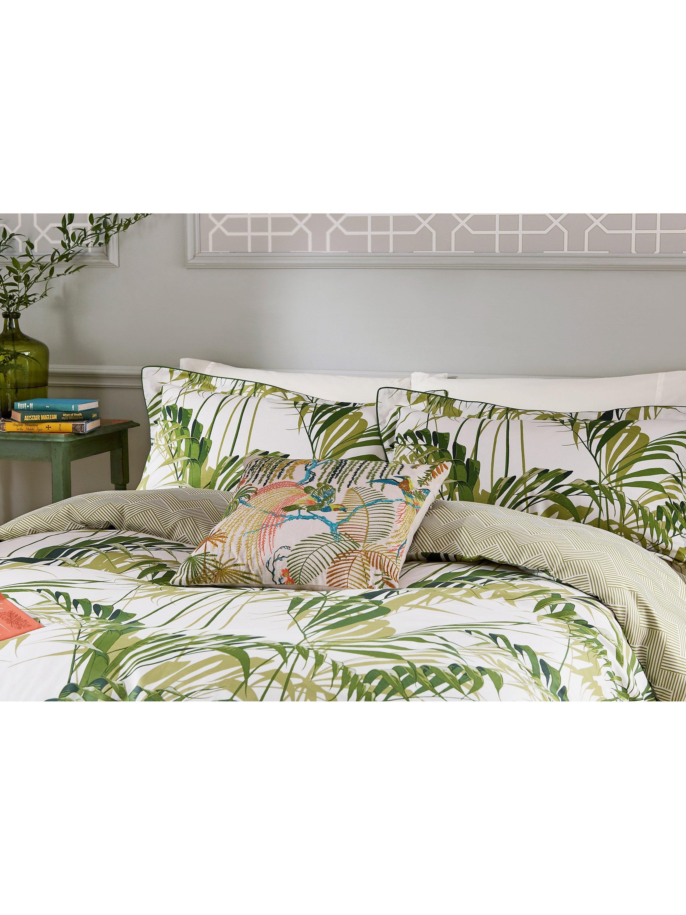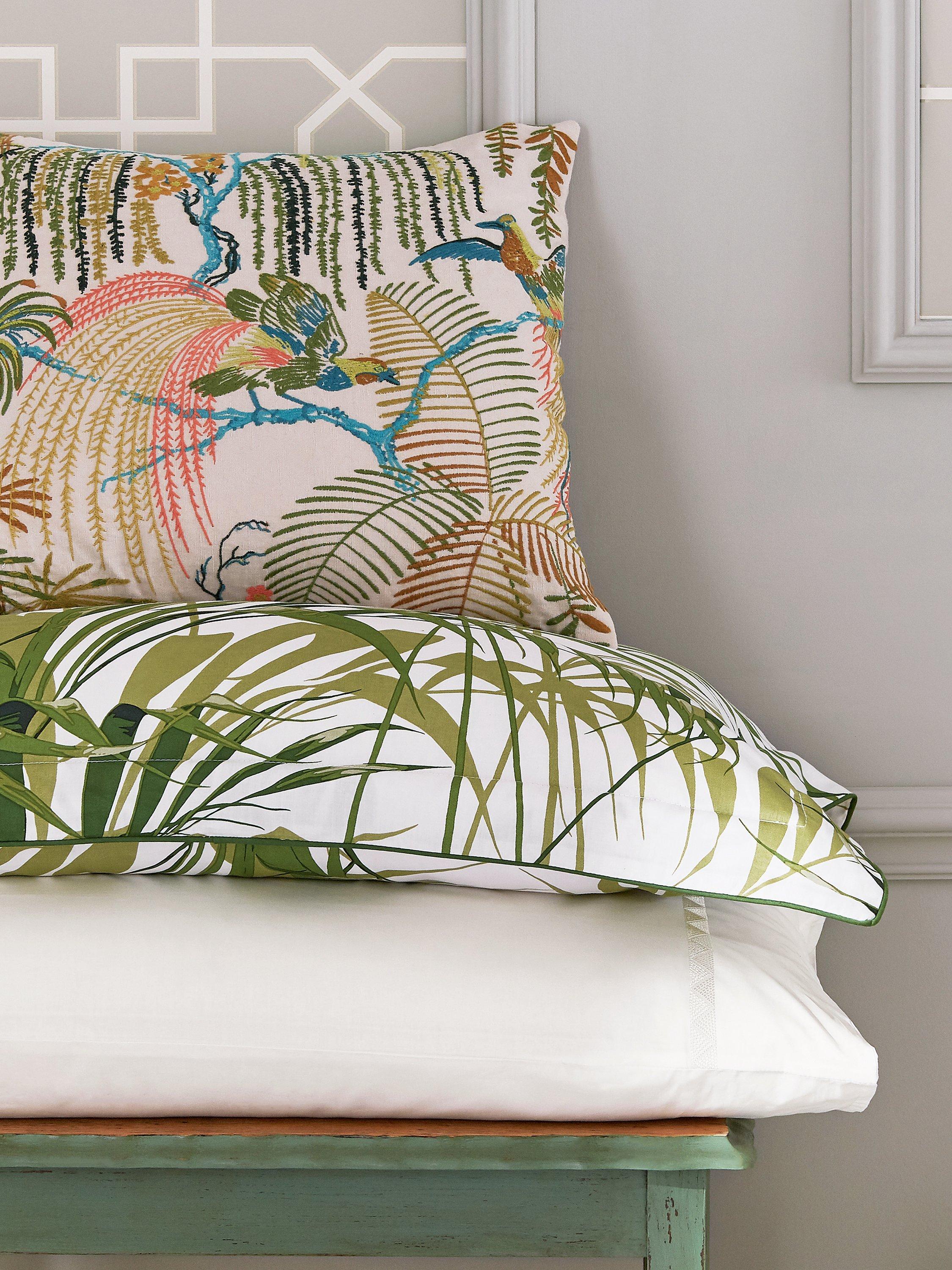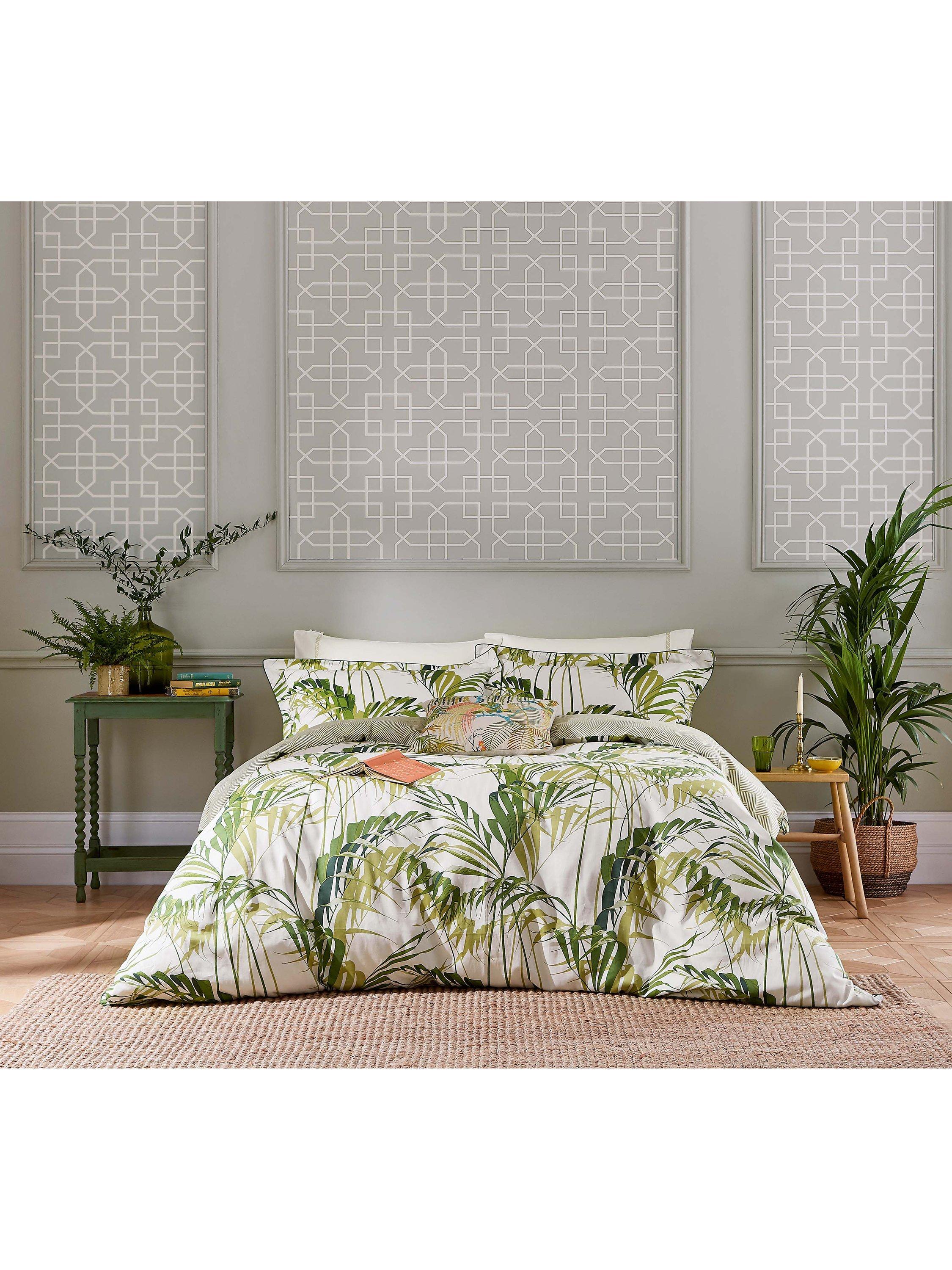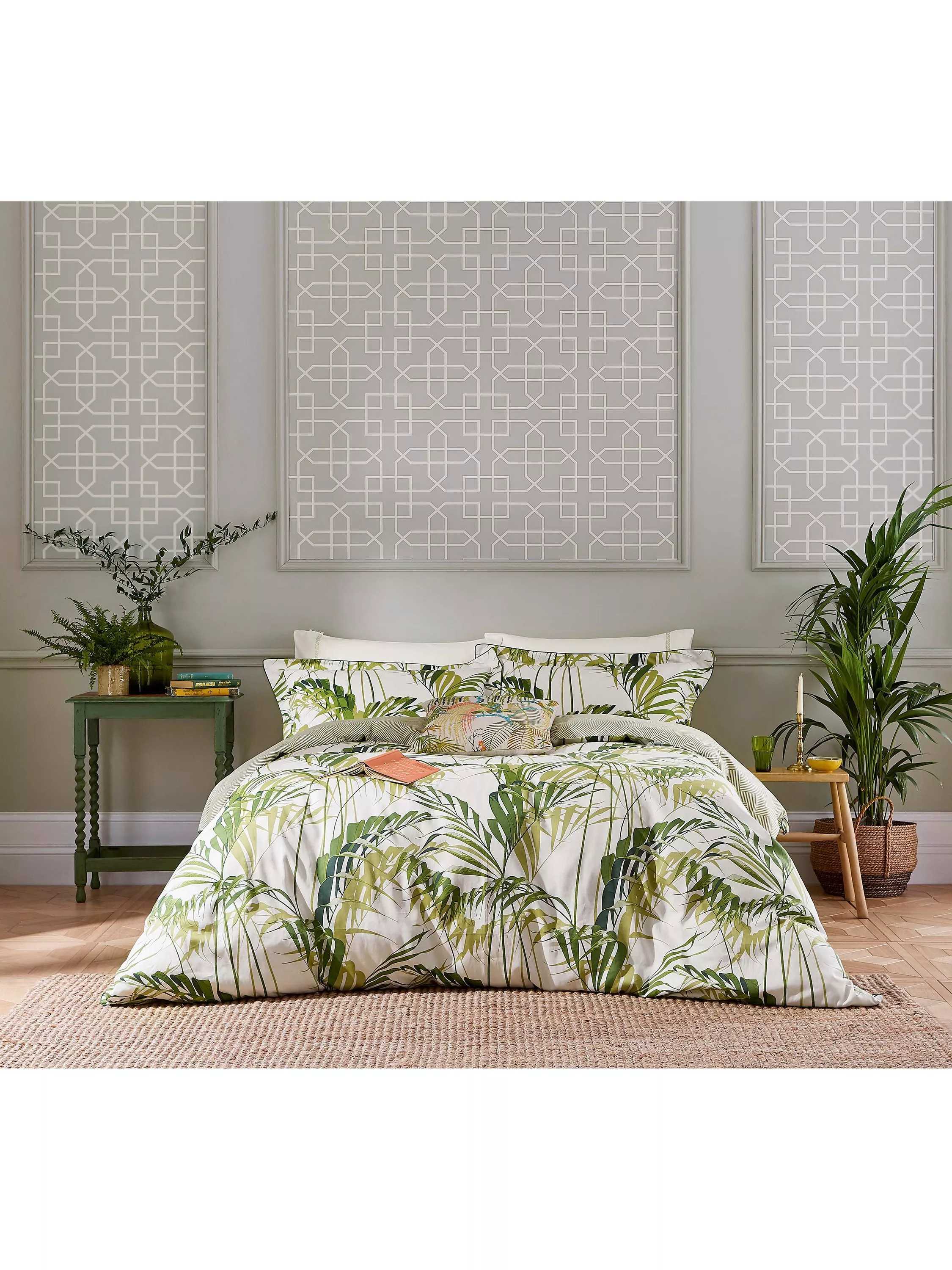 This design's curving foliage makes for a bedroom oasis, with its elegant arrangement of palm leaves and silhouetted shadows in tranquil shades of botanical green.