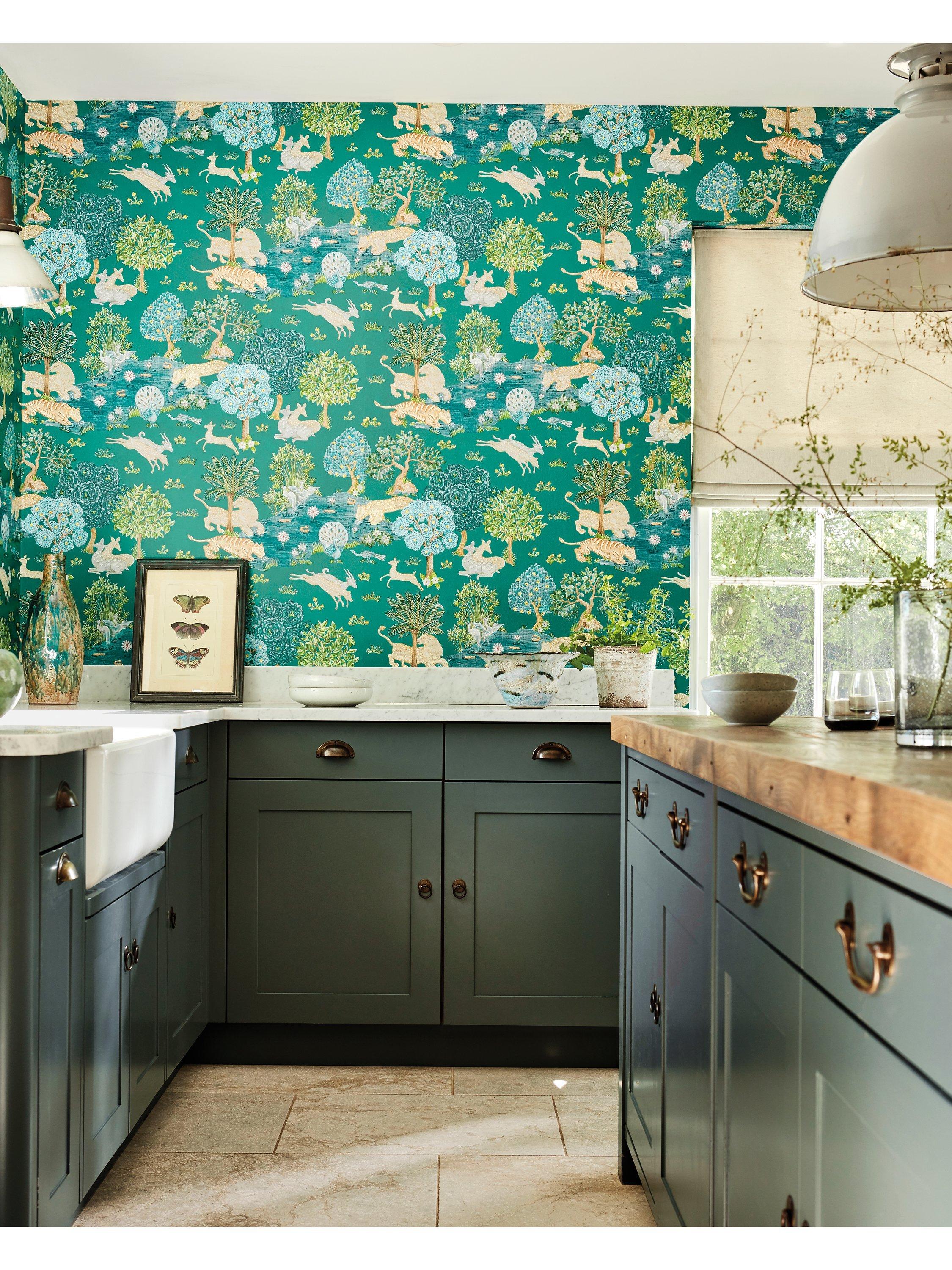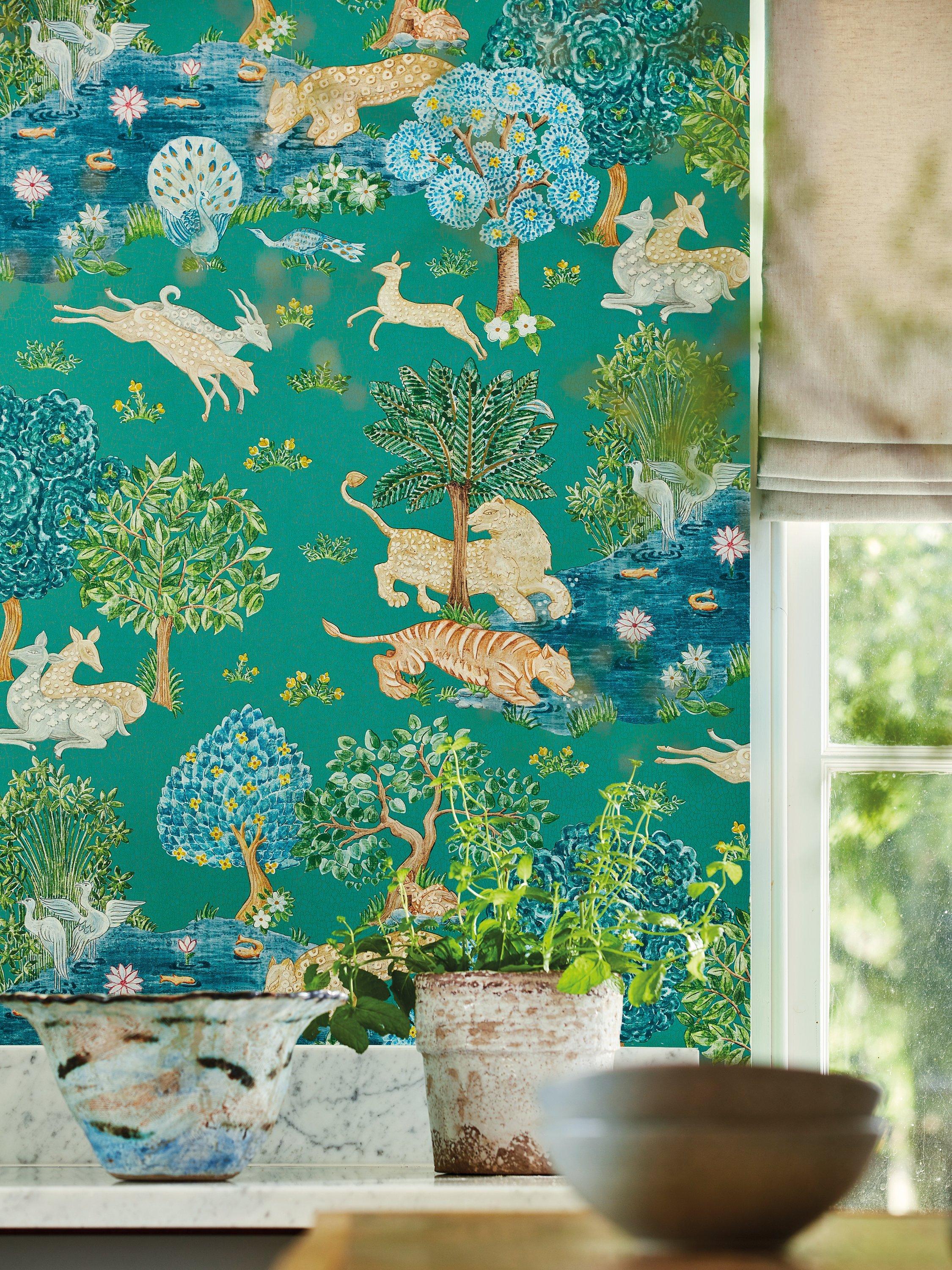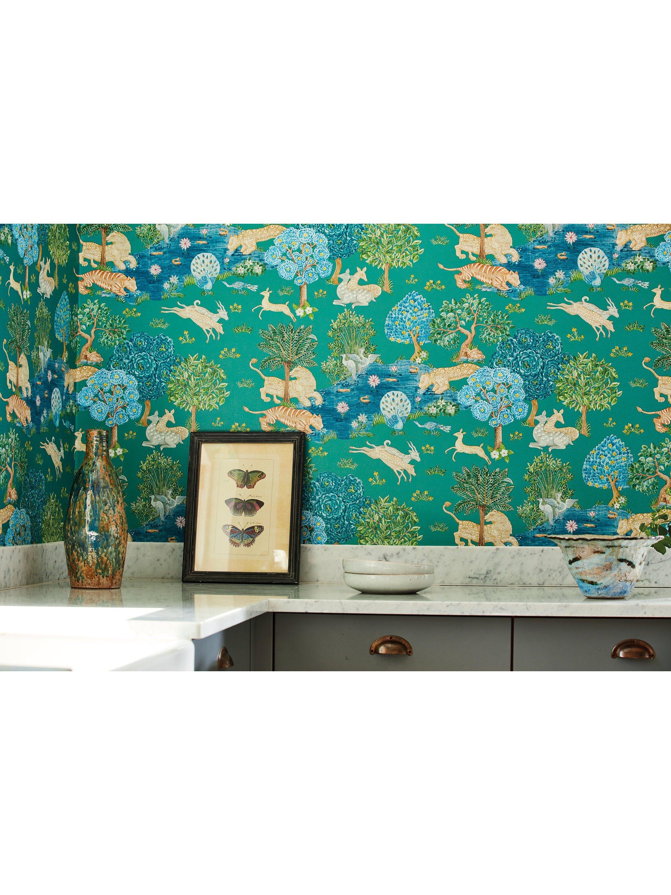 Insprired by a document in the Sanderson archive, Pamir Garden is a fantastical wallpaper that reflects the 1970s fashion for exotic patterns and global cultures. Representative of a Persian garden, this oasis scene of floral sprigs, stylised trees, tigers and antelopes has been repainted in a fresco style with a crackle glaze effect in the ground to give a time-worn look.