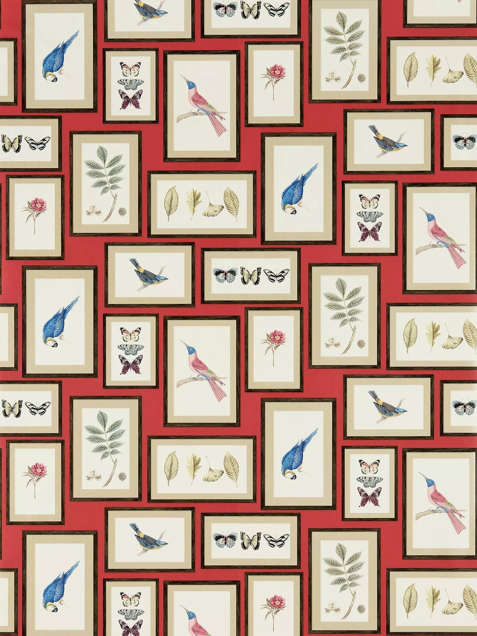 Botanically drawn organic forms of corals, shells, birds and feathers are presented as framed souvenirs in this striking wallcovering. The realistic quality of the specimens is achieved by using an almost photographic print process.
