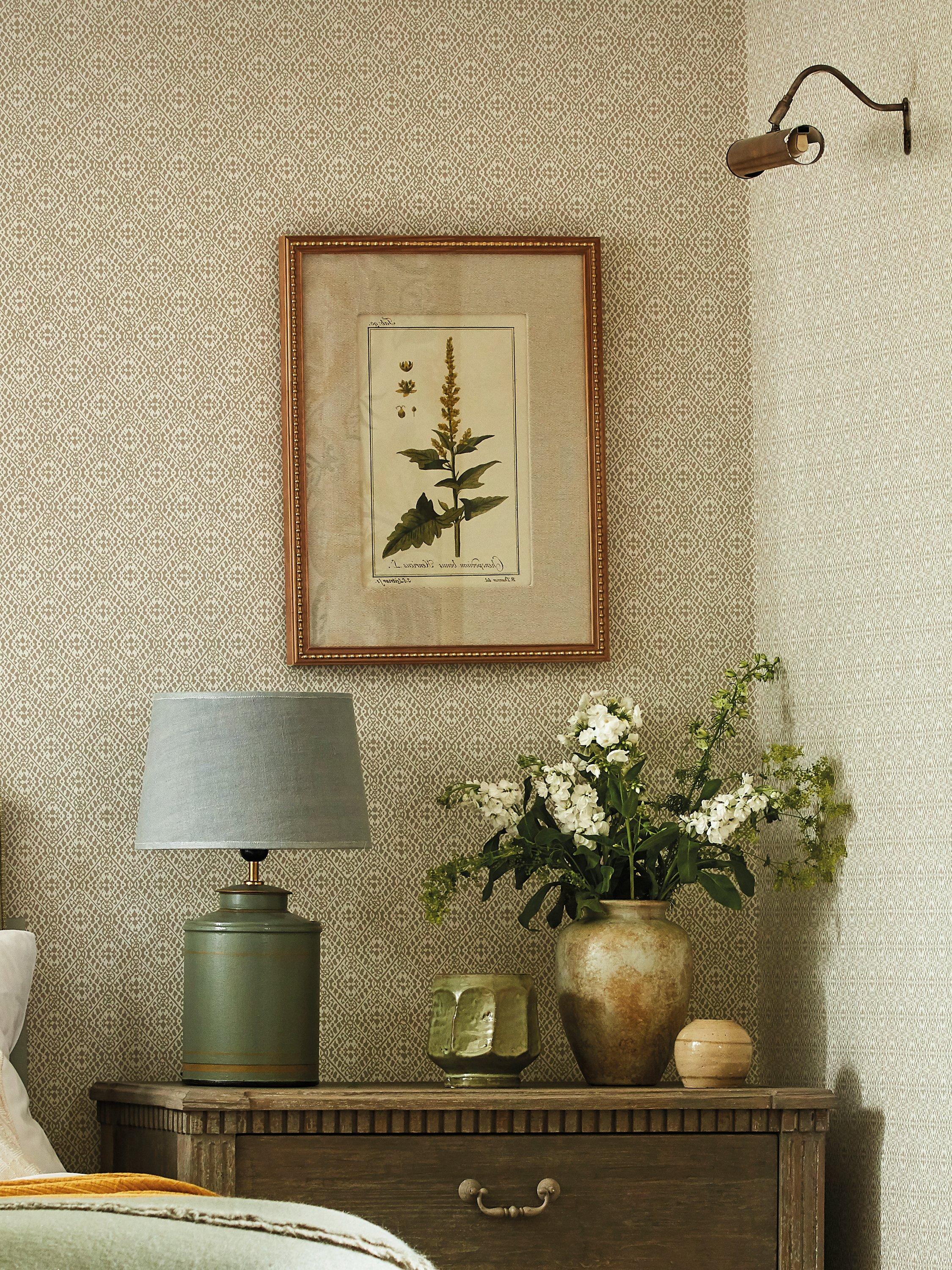 Inspired by the interlocking, repeating geometric patterns found on traditional cloths of Polynesia and Central Africa, Pinjara Trellis is a wonderfully adaptable semi-plain wallpaper with an organic tile effect.