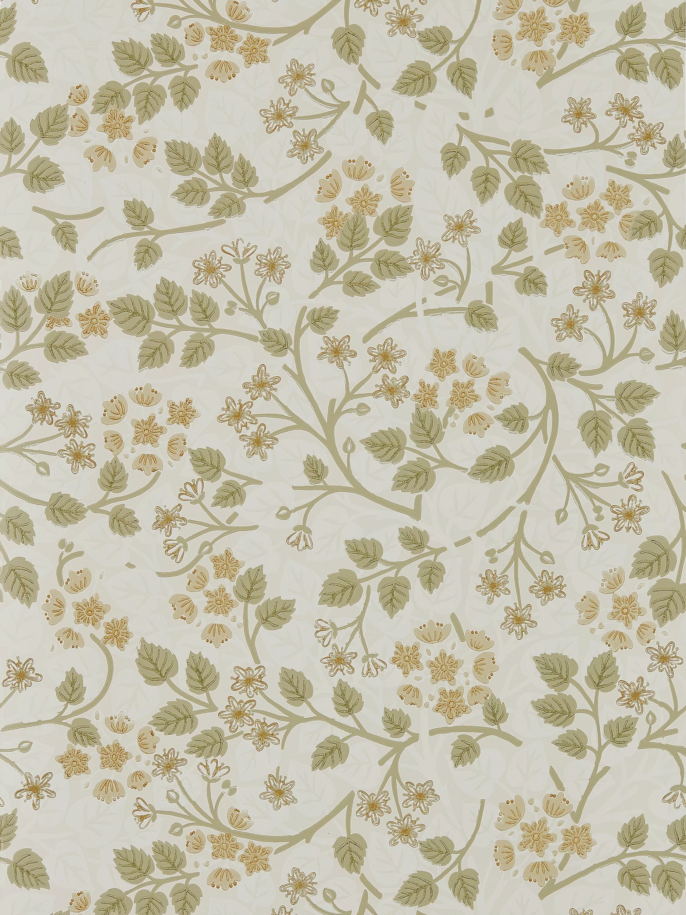 Pungent and intoxicating lime trees are prominent in Highgrove. Flowering in June and July they bring an unmistakable freshness to the garden. Silver Lime is inspired by an Arts & Crafts wallpaper document; this trailing design depicts heart-shaped leaves and stylised blossoms that have been surface printed to echo the finish of hand-block printing.