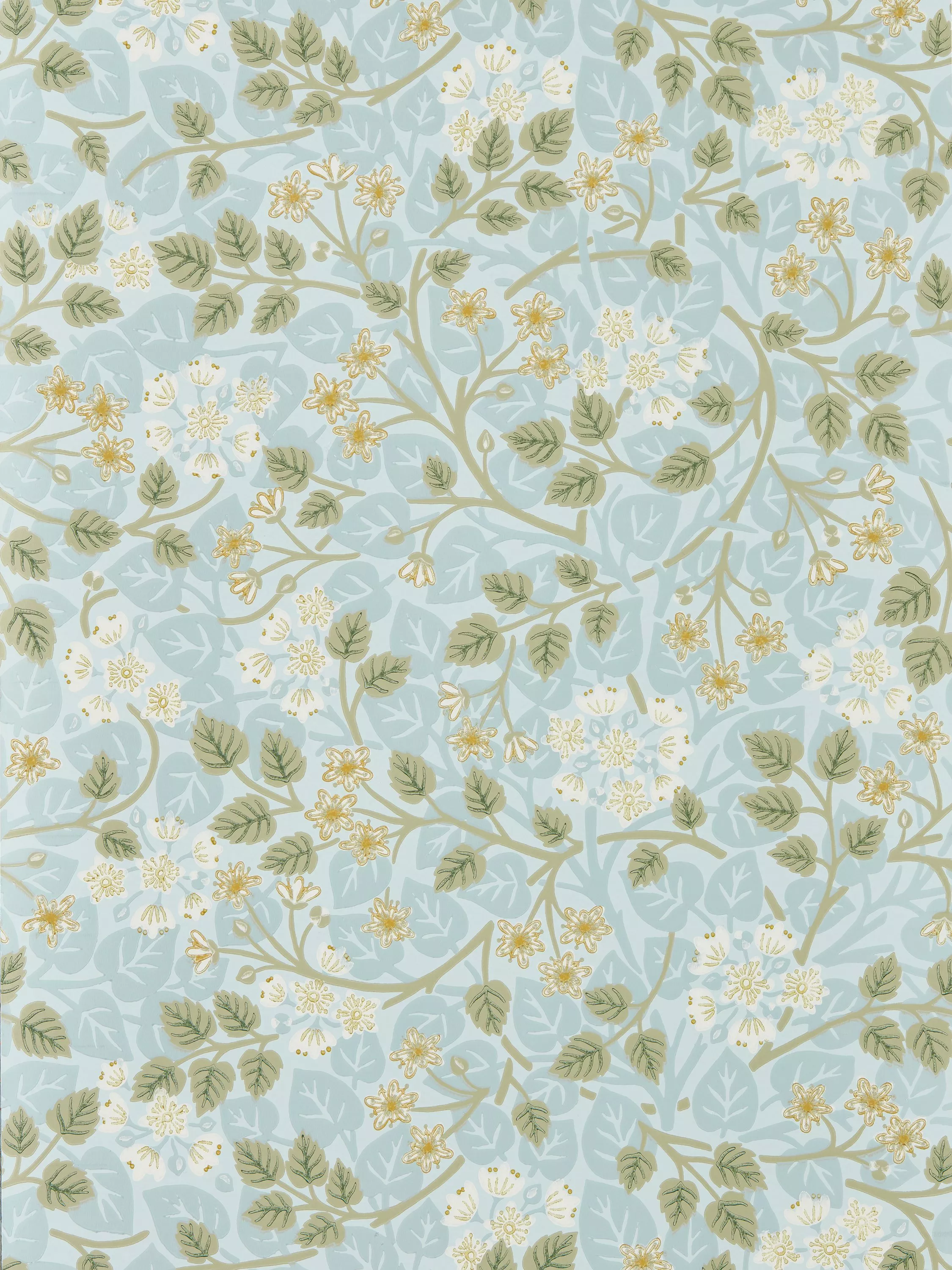 Pungent and intoxicating lime trees are prominent in Highgrove. Flowering in June and July they bring an unmistakable freshness to the garden. Silver Lime is inspired by an Arts & Crafts wallpaper document; this trailing design depicts heart-shaped leaves and stylised blossoms that have been surface printed to echo the finish of hand-block printing.