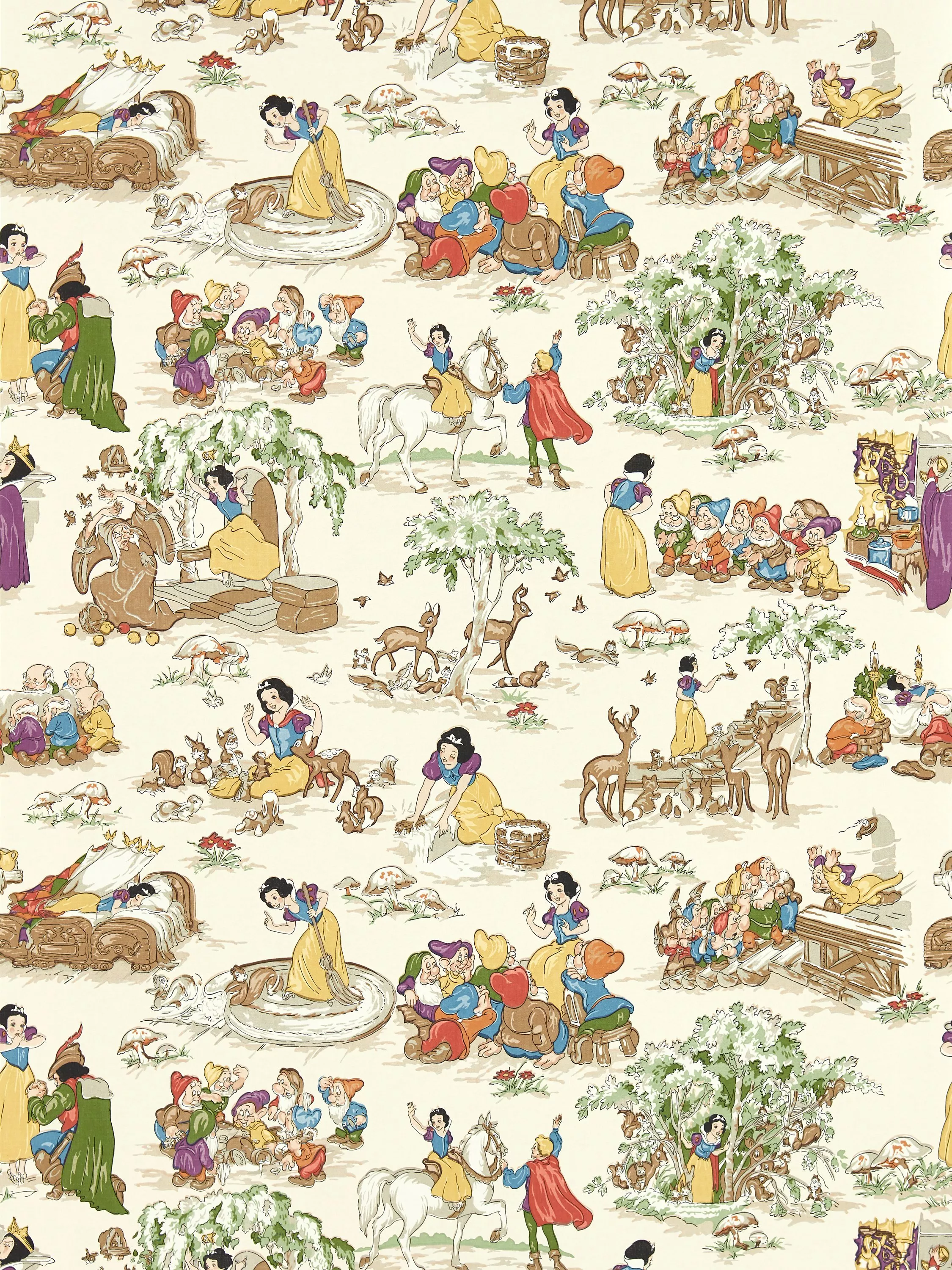 Launched in celebration of Snow White Disney`s first full-length feature film, this enchanting 1938 design combines a range of endearing scenes taken directly from the original movie. Retaining the exact proportions and block print detail of the archive document, "Snow White" has been reproduced in two 1930s-inspired colourways.