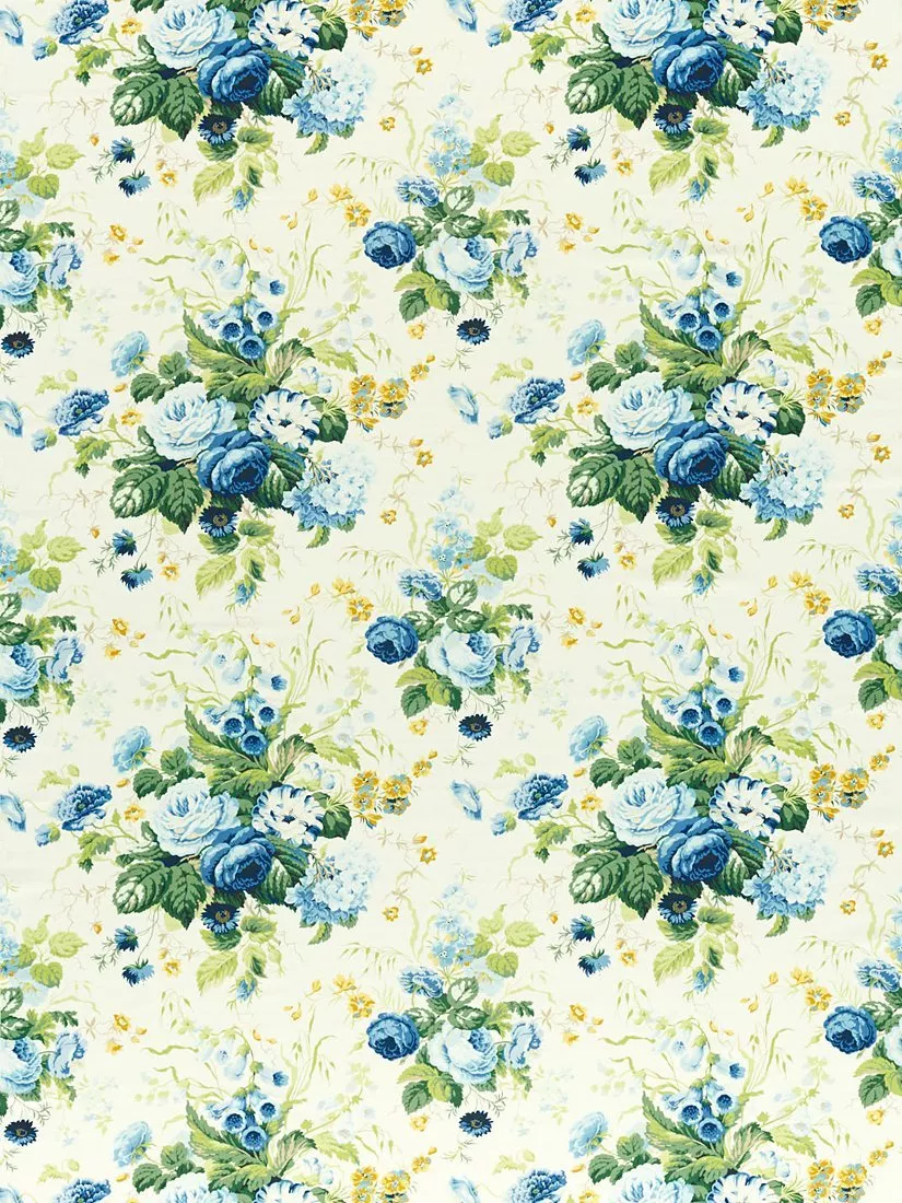 Designed by Pat Etheridge and first launched in 1990 as part of the Sanderson Carlysle Collection, this large scale floral bouquet in a typically English style combines roses, cornflowers, foxgloves and hydrangeas with trailing stems and foliage.
