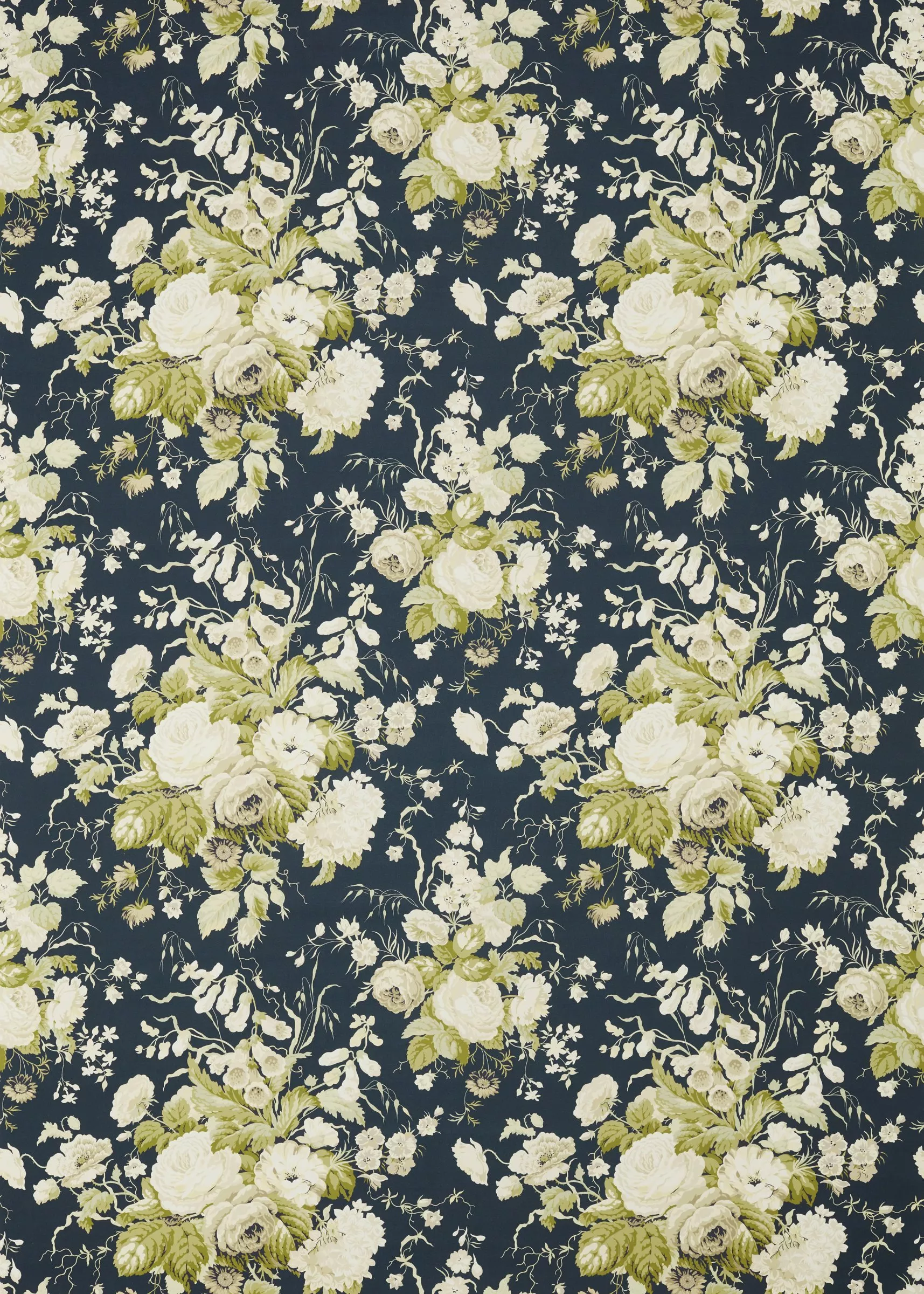 Designed by Pat Etheridge and first launched in 1990 as part of the Sanderson Carlysle Collection, this large scale floral bouquet in a typically English style combines roses, cornflowers, foxgloves and hydrangeas with trailing stems and foliage.
