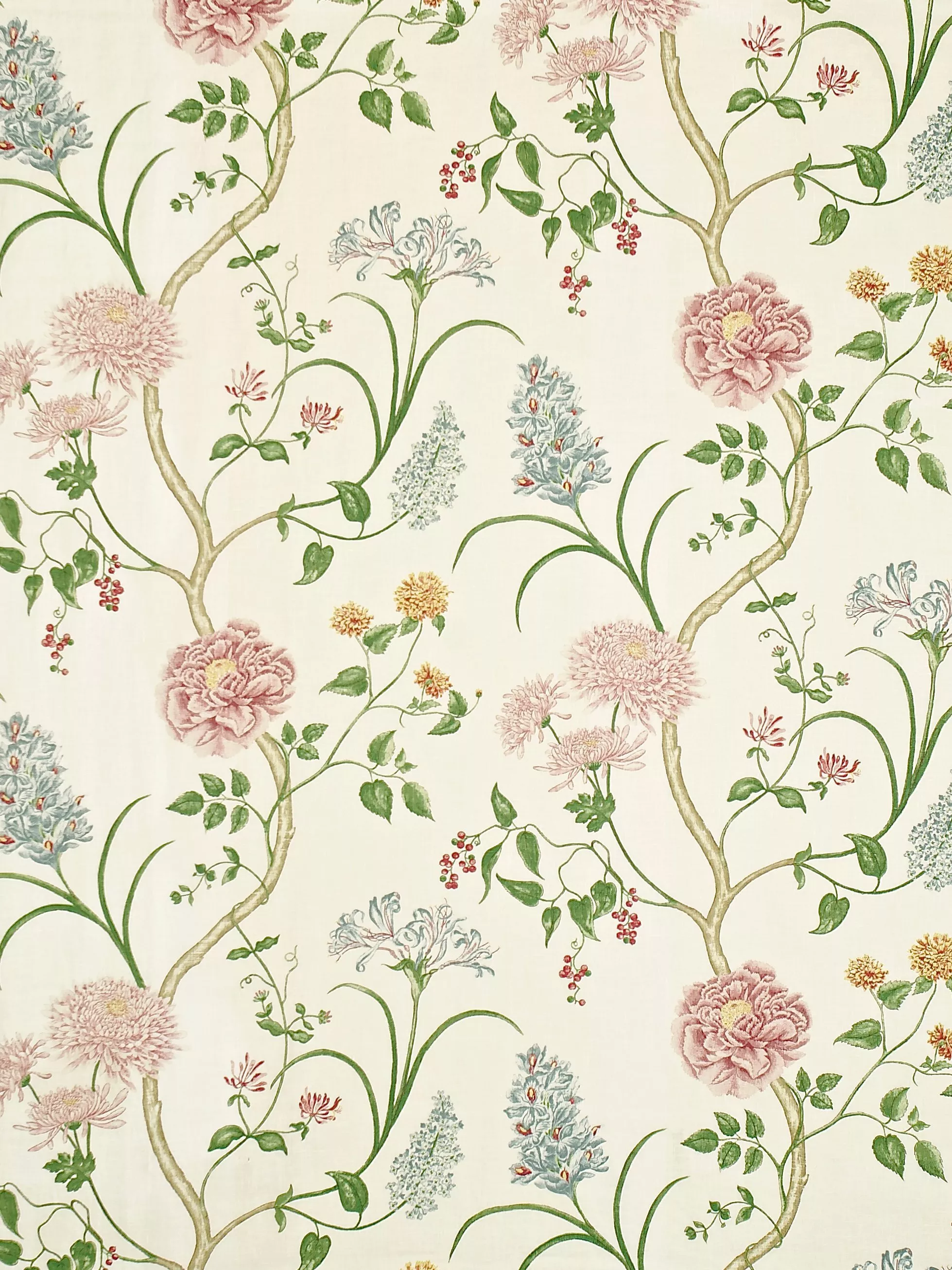 A myriad of flowers bloom from a single branch on this soft linen design featuring chrysanthemums, peonies, honeysuckle and berries. The distressed textures of the Indian Palampores from the 18th Century are conveyed through the printing technique and beguiling colourways.