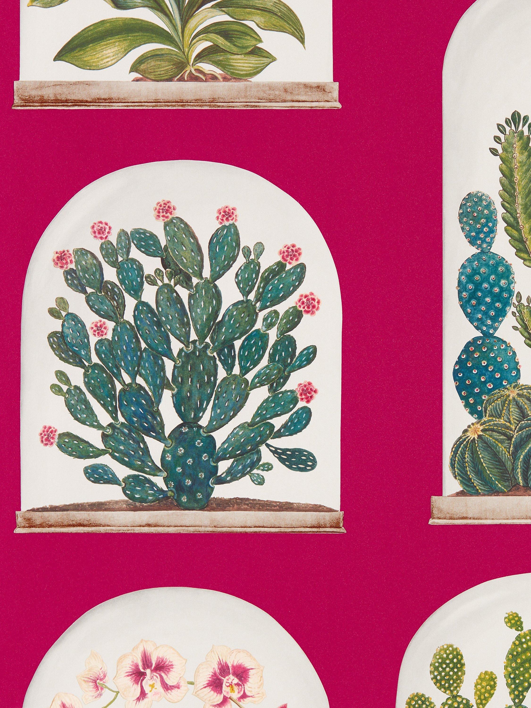 A fabulous and unique design, depicting exquisitely observed cactus plants and orchid flowers, encapsulated in a glass-domed terrarium.