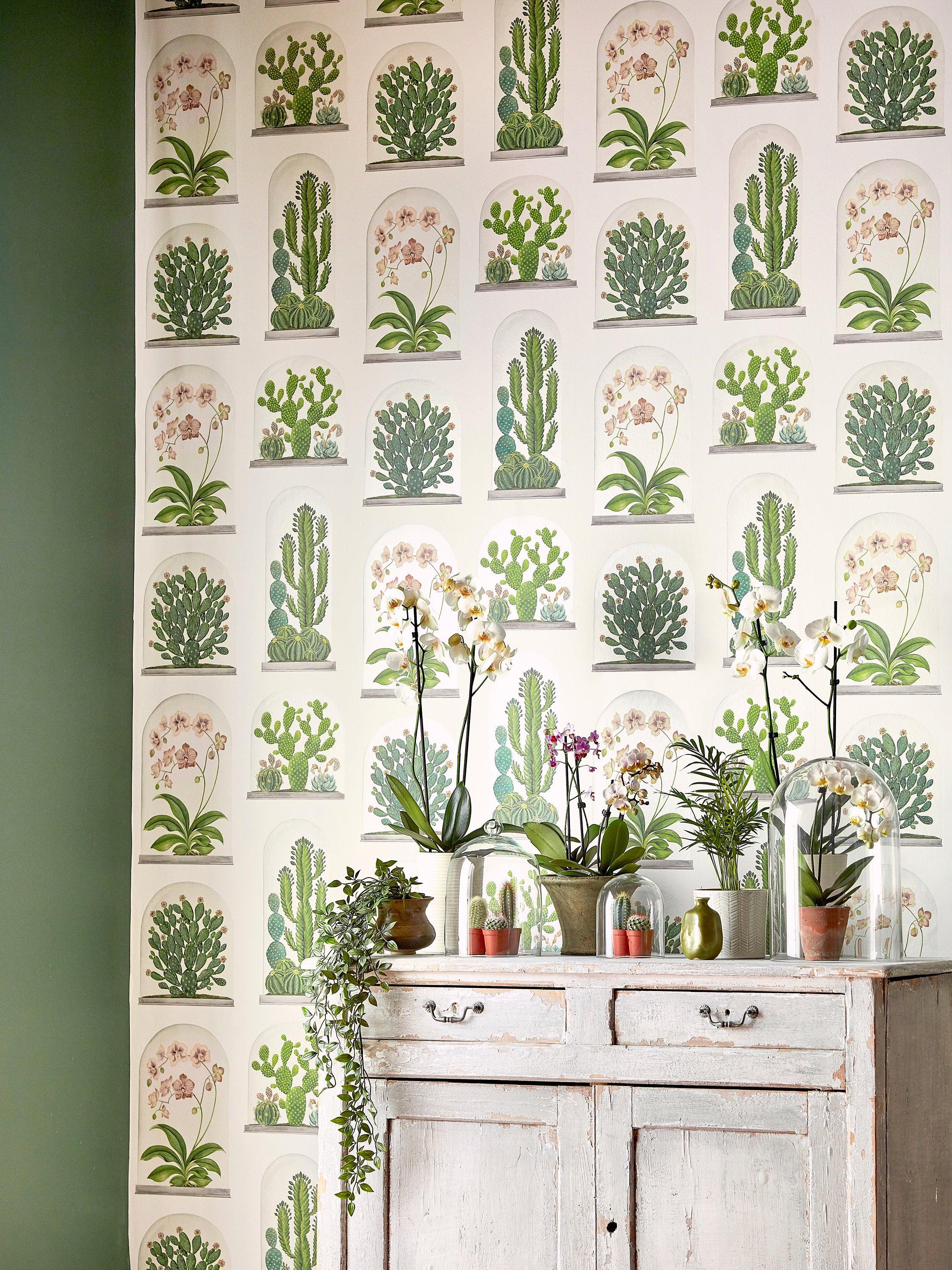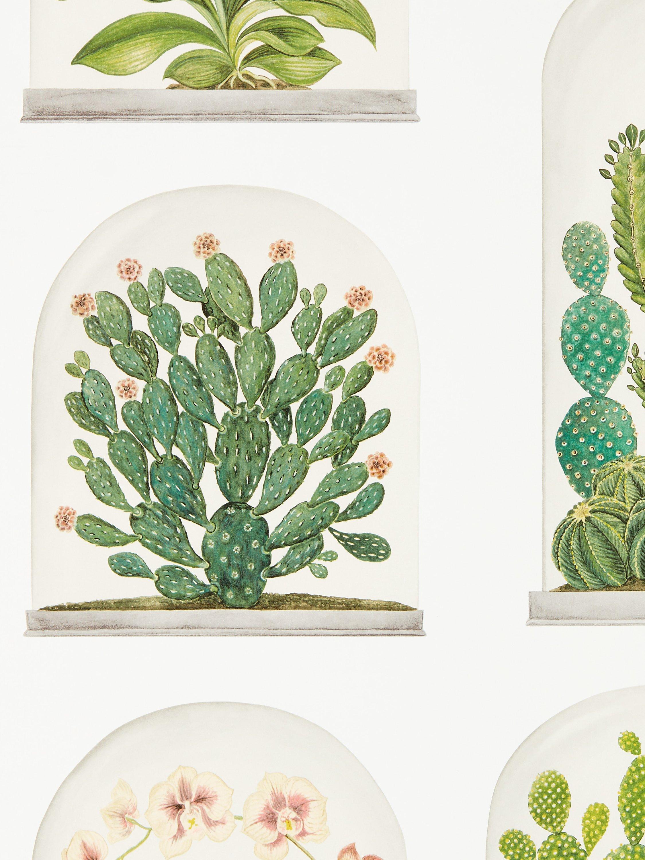 A fabulous and unique design, depicting exquisitely observed cactus plants and orchid flowers, encapsulated in a glass-domed terrarium.