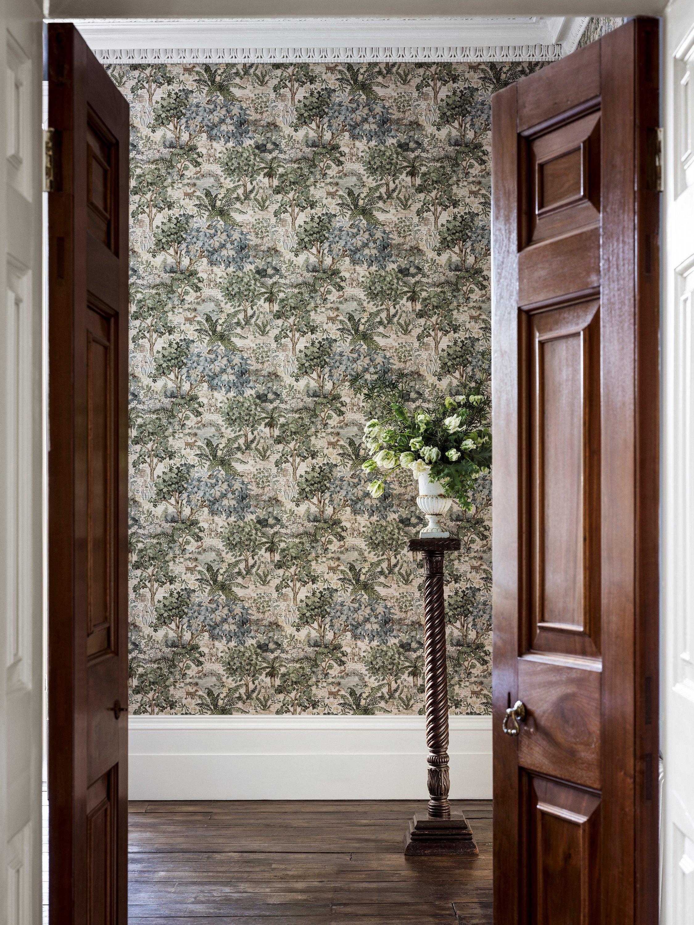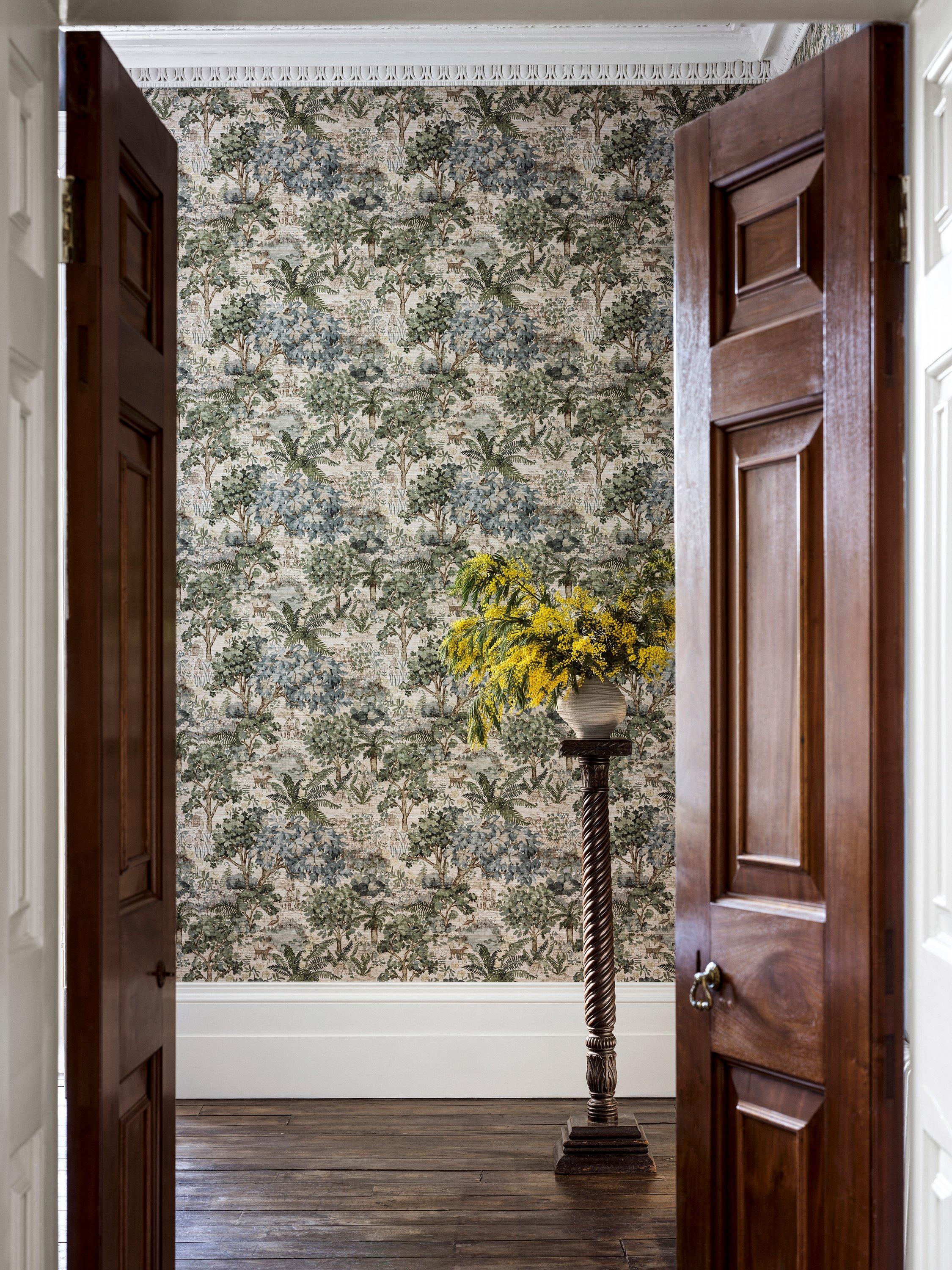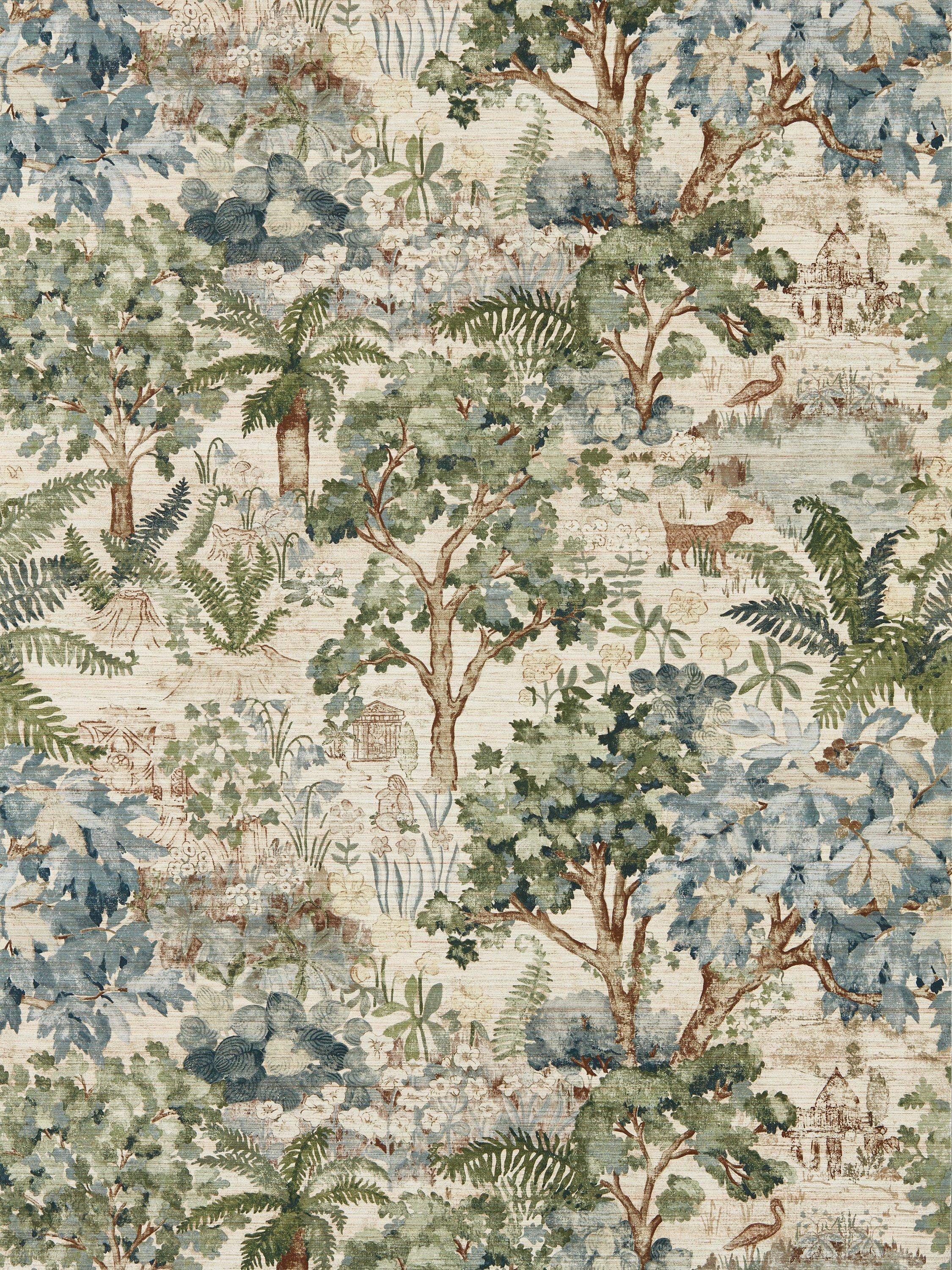 A home to mysterious figures and sculptures The Stumpery design includes a classic temple built from green oak, a thatched treehouse, a wall of gifts made from gifted stones to His Majesty and the Wood Nymph "Goddess of the Wood". The mural showcases the design with a grass-cloth texture at full scale to give the feel of an all-encompassing scenic tapestry when hung.