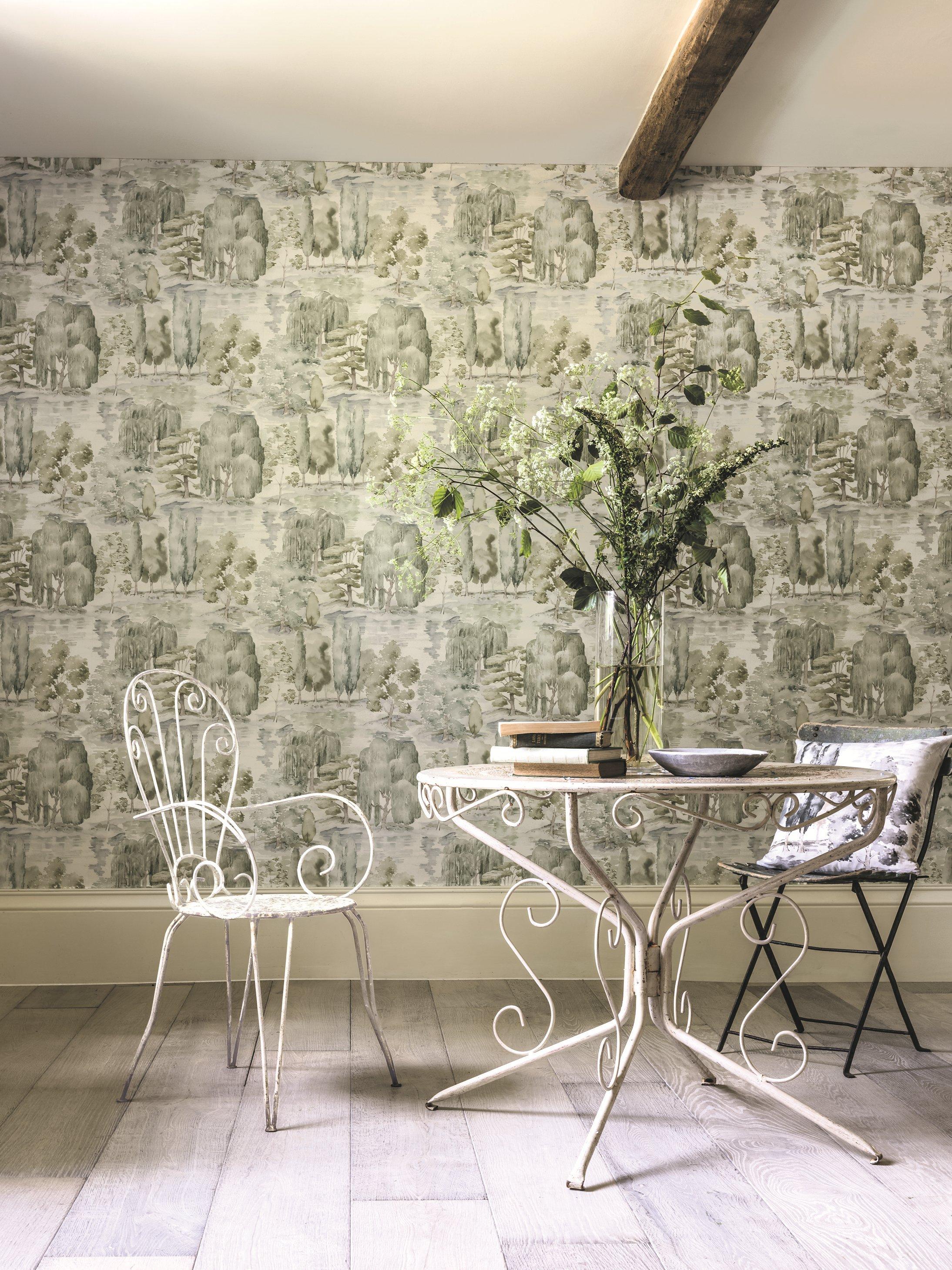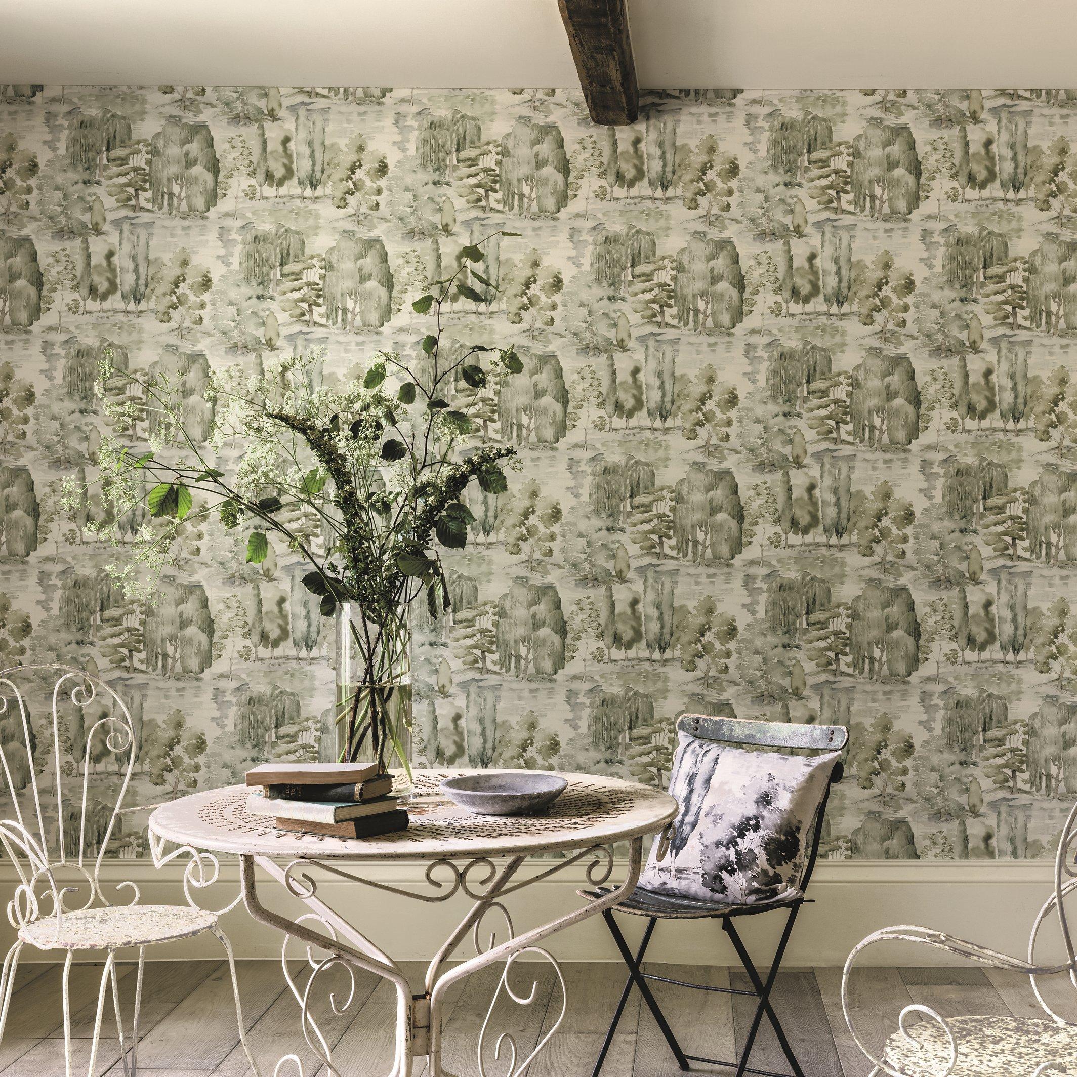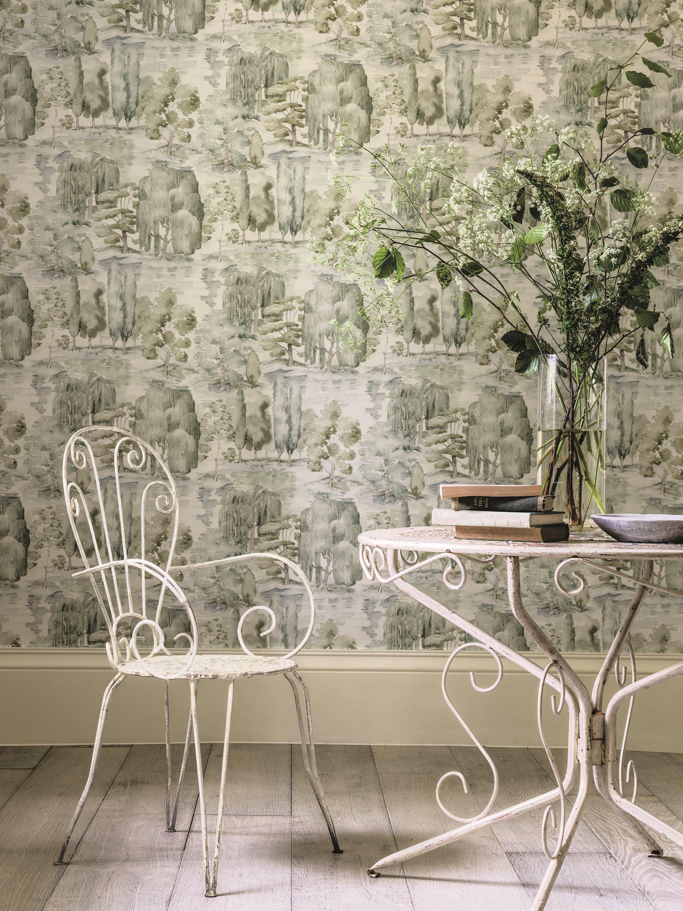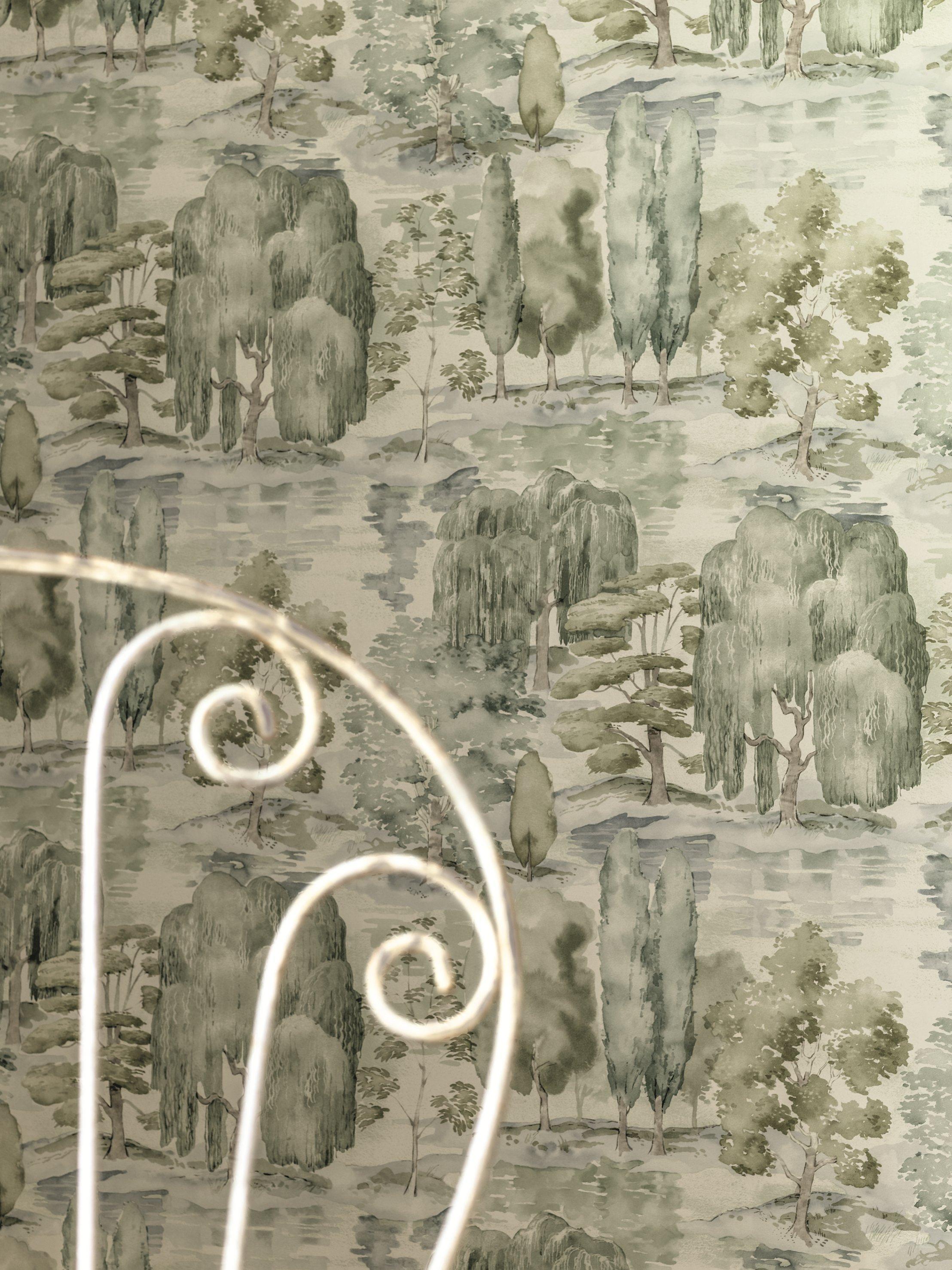 Celebrating the open, flowing landscapes of English country estates (created in the 18th century by Capability Brown), "Waterperry" features a plethora of great British tree varieties. Watercolour brush strokes symbolise natural, undulating landscapes and gentle water sources. Painted with a diffused light effect, this design creates a tranquil aesthetic.