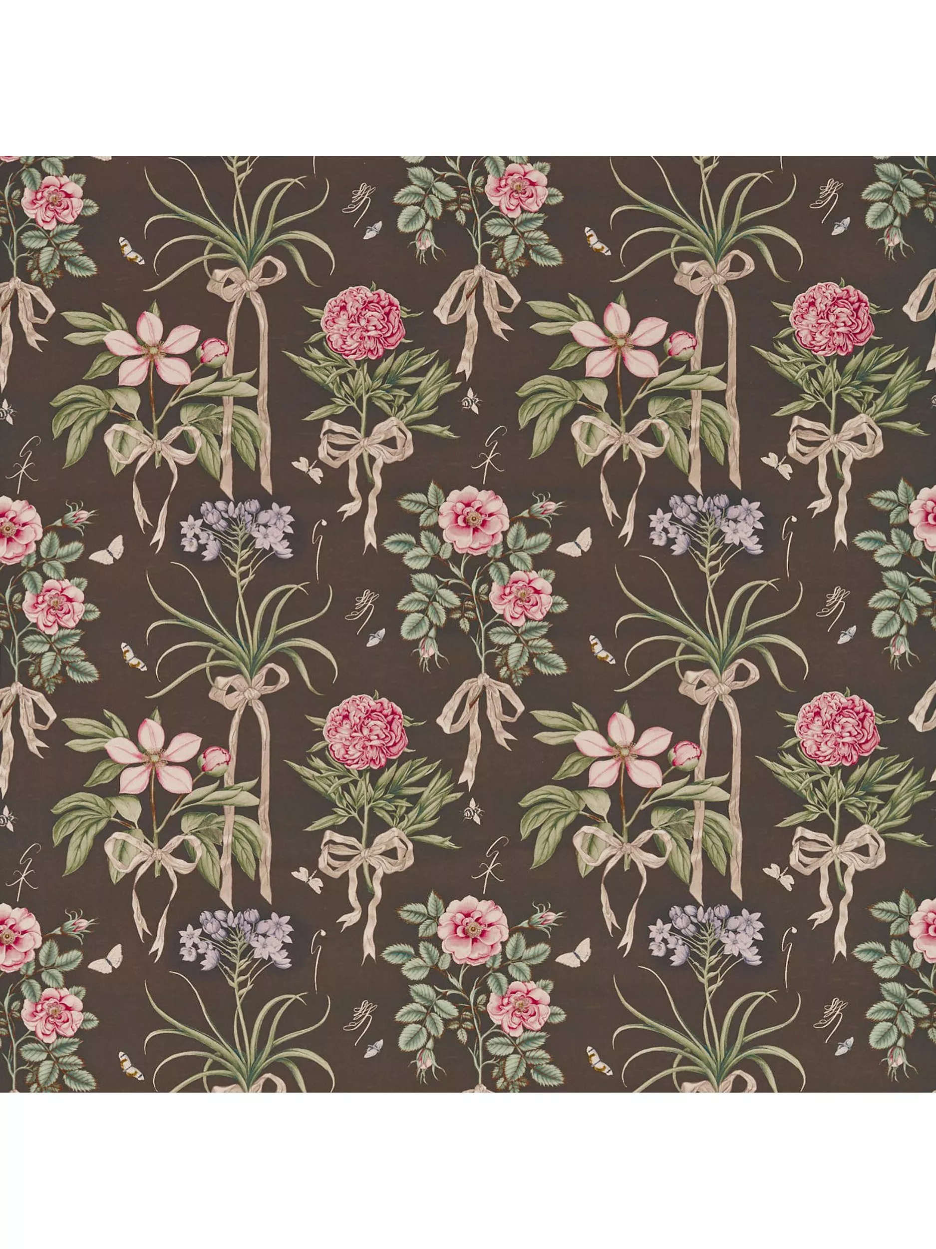 An original design, Etchings & Roses, has been elegantly repainted and coloured in a botanical illustration style. Featuring rare and beautifully engraved prints from Mulhouse, faithfully reproduced and including miniature insects scattered throughout the design, Cupid`s Beau is elevated to the next level of contemporary design with Giles`s illustrative bows and calligraphy, including his signature "G". Each colourway creates an enchanting contrast between botanical and background, the antique origins of the print are maintained while also made sublimely new. Printed on a linen union for upholstery use.
