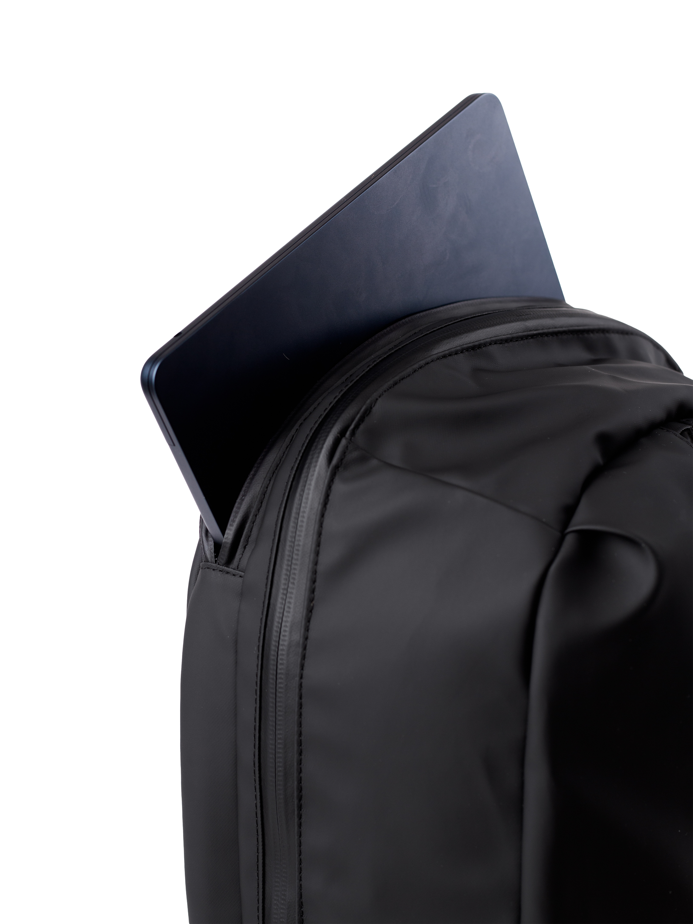 A water-resistant backpack with a quilted back plate for airflow and padded, adjustable shoulder straps. It fits a 16" laptop and also has one zip internal pocket and external slit pockets on each side. Also features loops for attaching water bottles or lamps etc. Opens with a waterproof zip and secures with a 15cm high gusset to prevent belongings from falling out.
