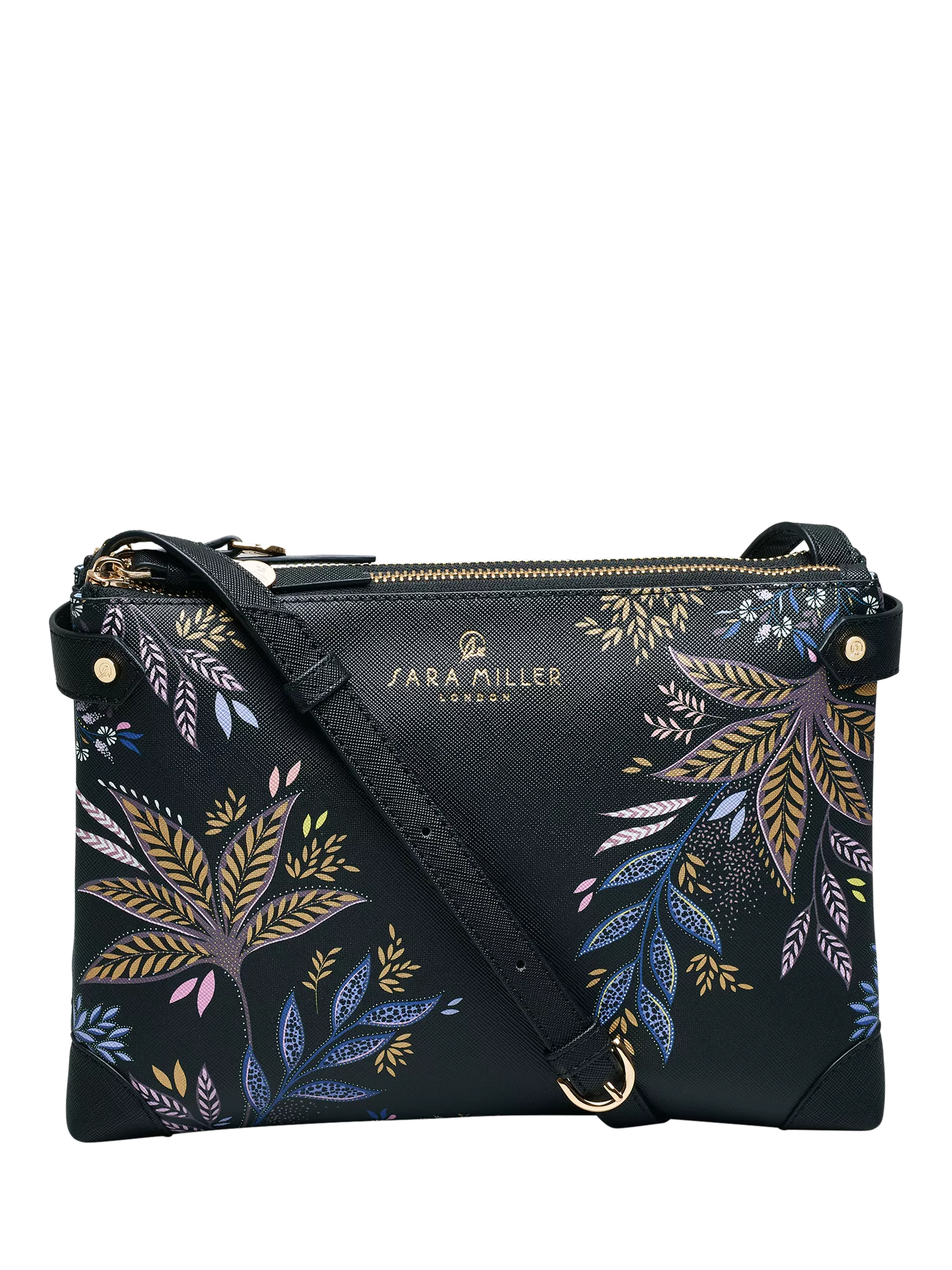 The Sara Miller zip-close crossbody bag is an ideal day-to-evening accessory. The long shoulder strap and multiple compartments make it a great shopping companion or it can also be used as a shoulder bag in the evening. The Black Botanic colourway makes it easy to wear with the added luxury of the decorative gold foil print.