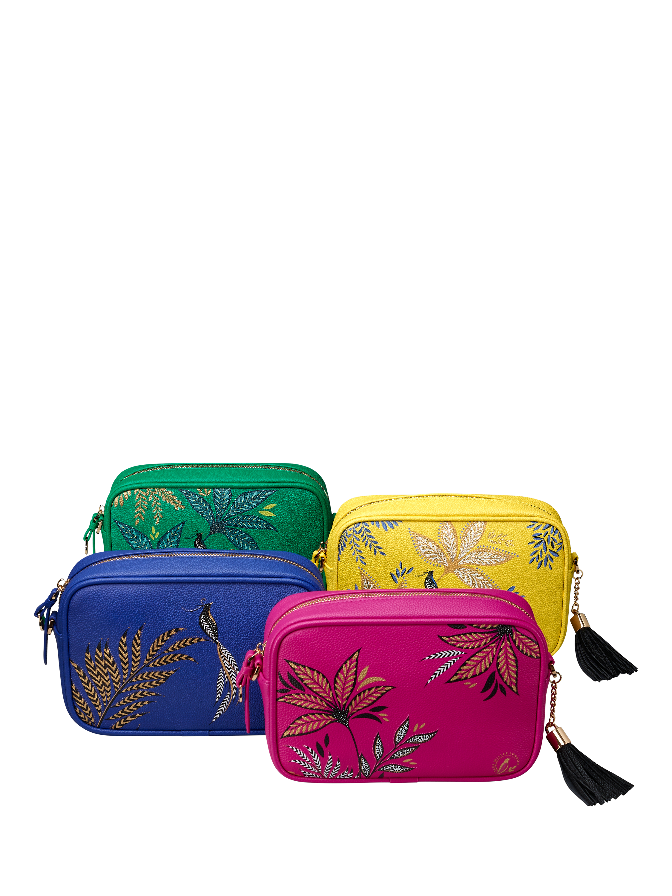 This camera bag makes the perfect day-to-evening accessory. The chevron webbing shoulder strap and compact size is a great shopping companion. The bright fun prints add a pop of colour to your outfit, with the added lustre of decorative gold foil details. Embellished with a delicate gold logo, and etched Sara Miller London zip pulls. The intricate gold detailing is beautifully set against the durable yet luxurious natural grain fabric.