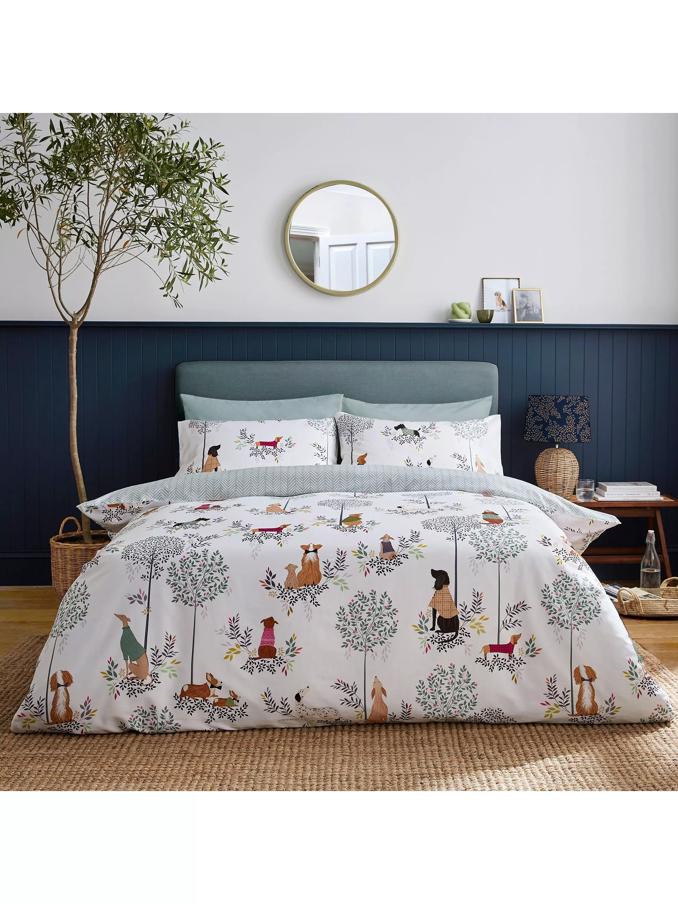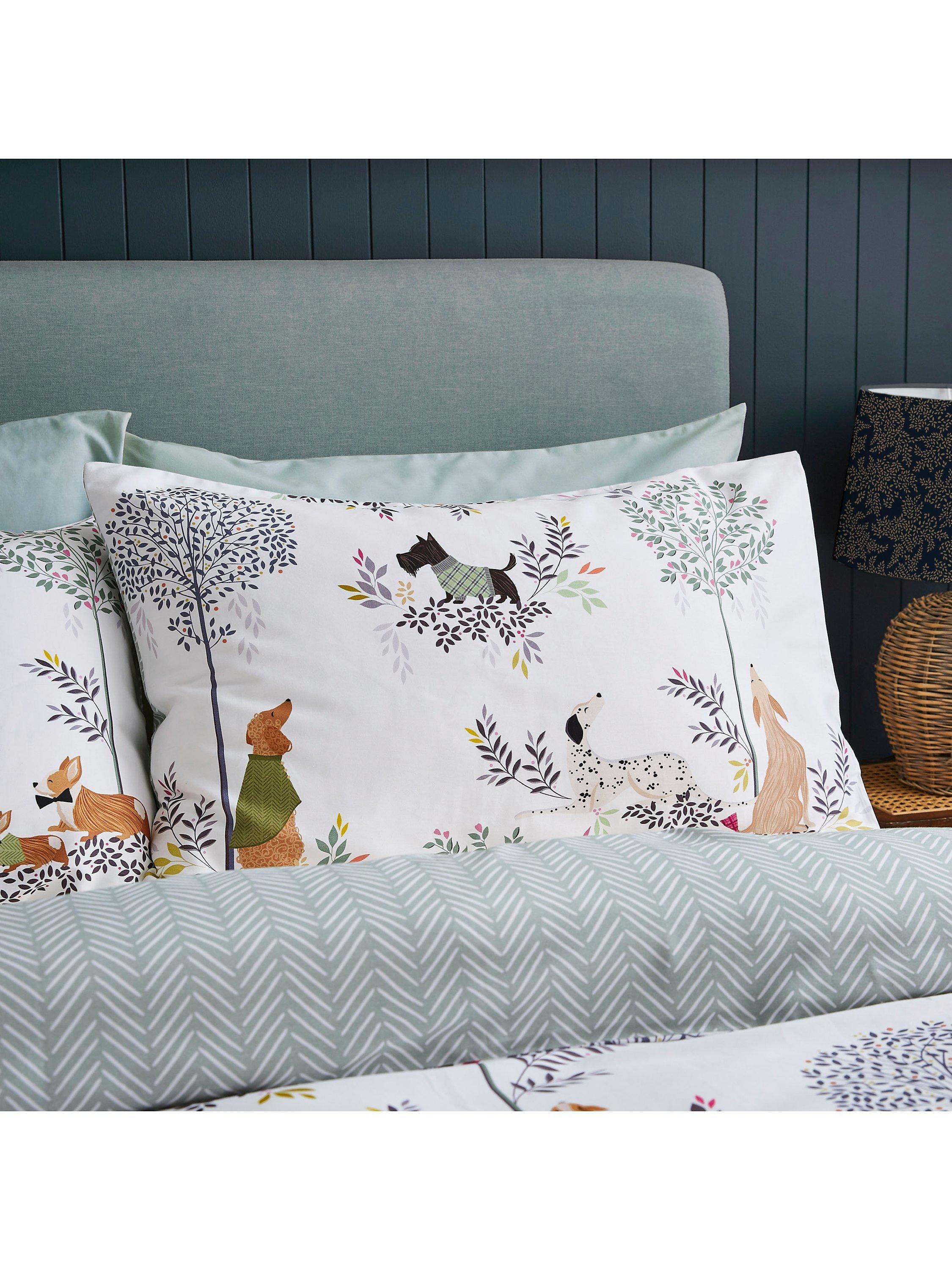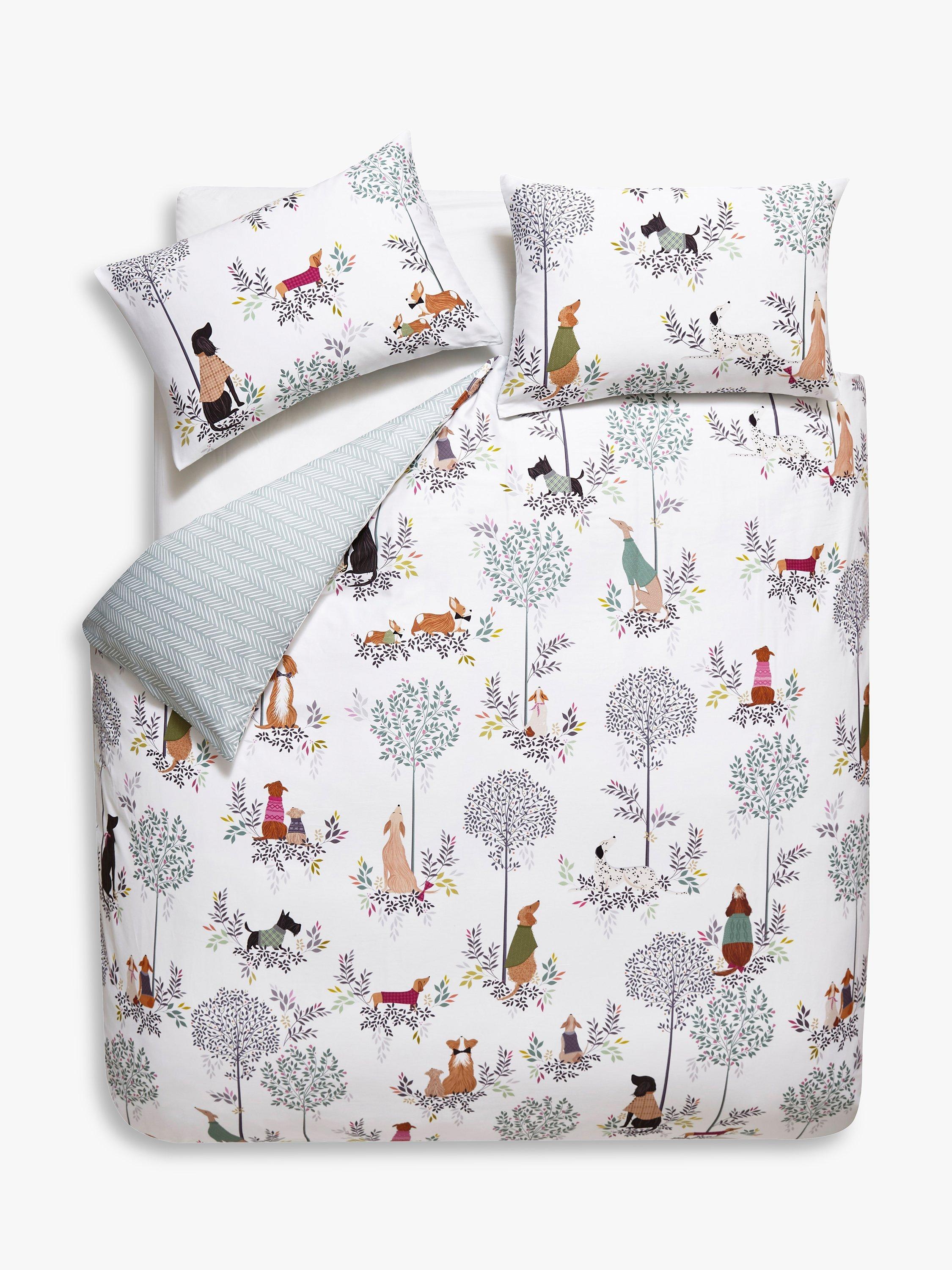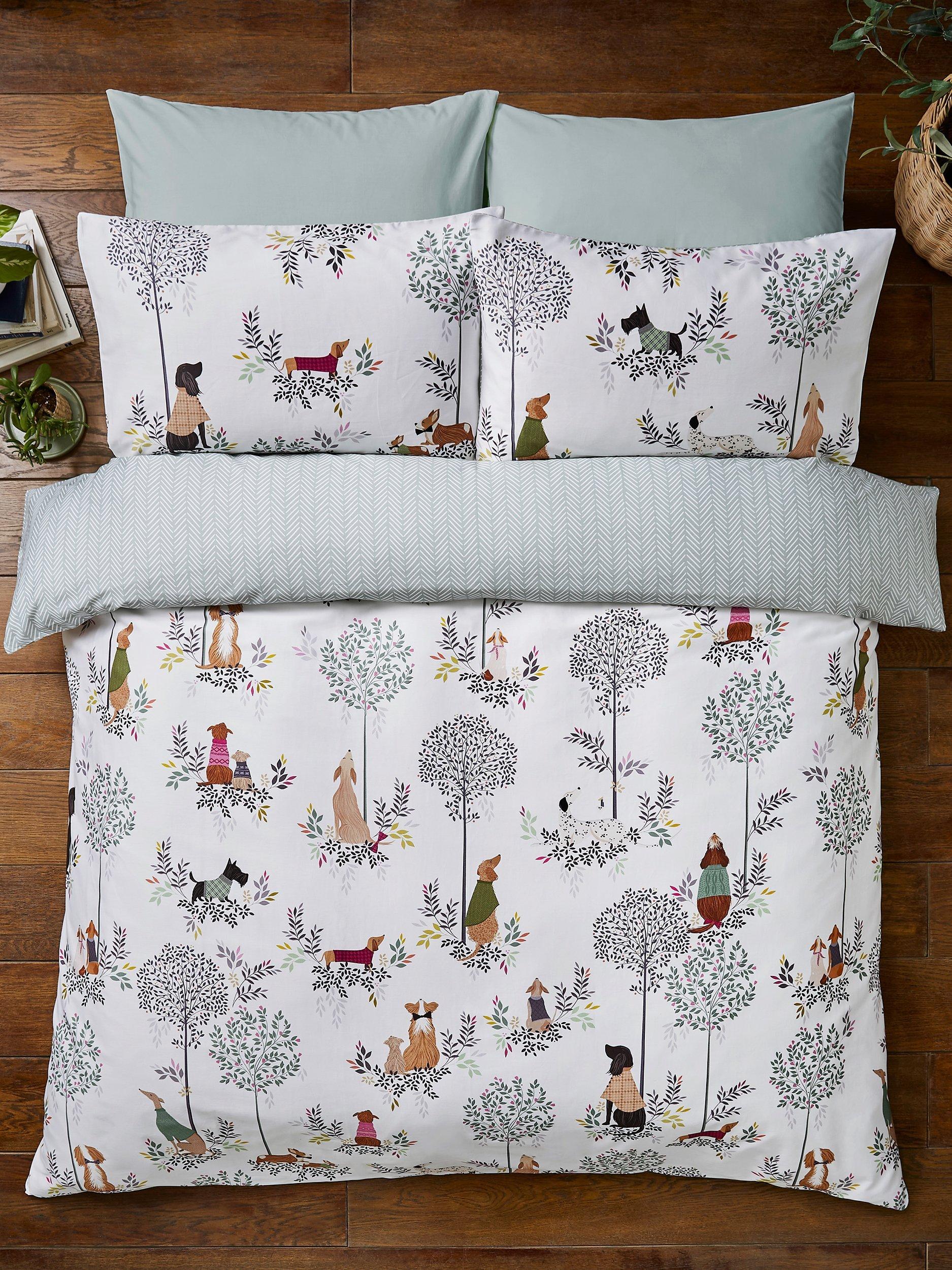 This charming Dapper Dogs duvet cover set from Sara Miller London features array of well-dressed dogs amid amongst beautiful woodland. Printed on plush 220 thread count 100% cotton sateen on crisp white with coordinating soft green herringbone print underside, this playful print will add character to any room.