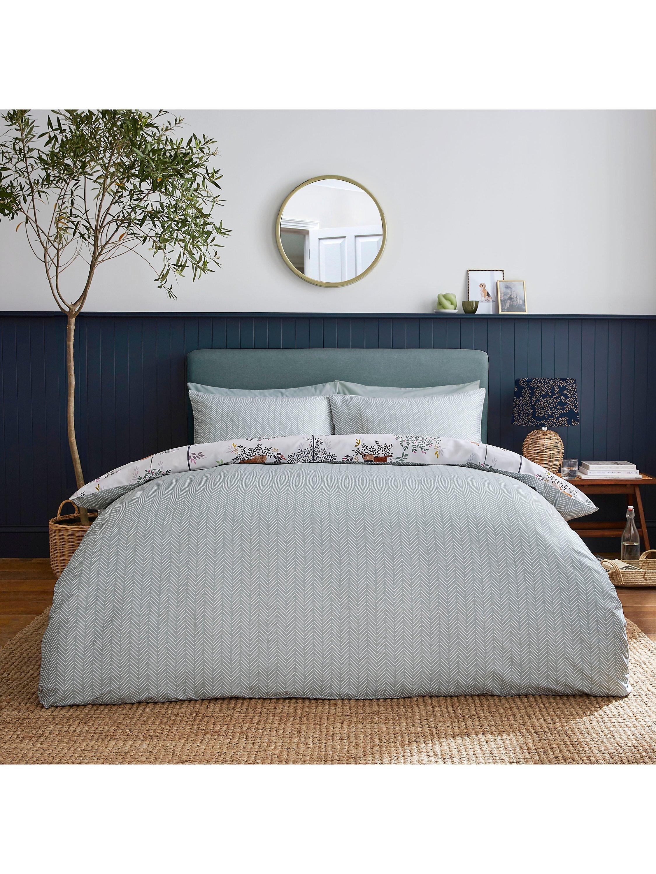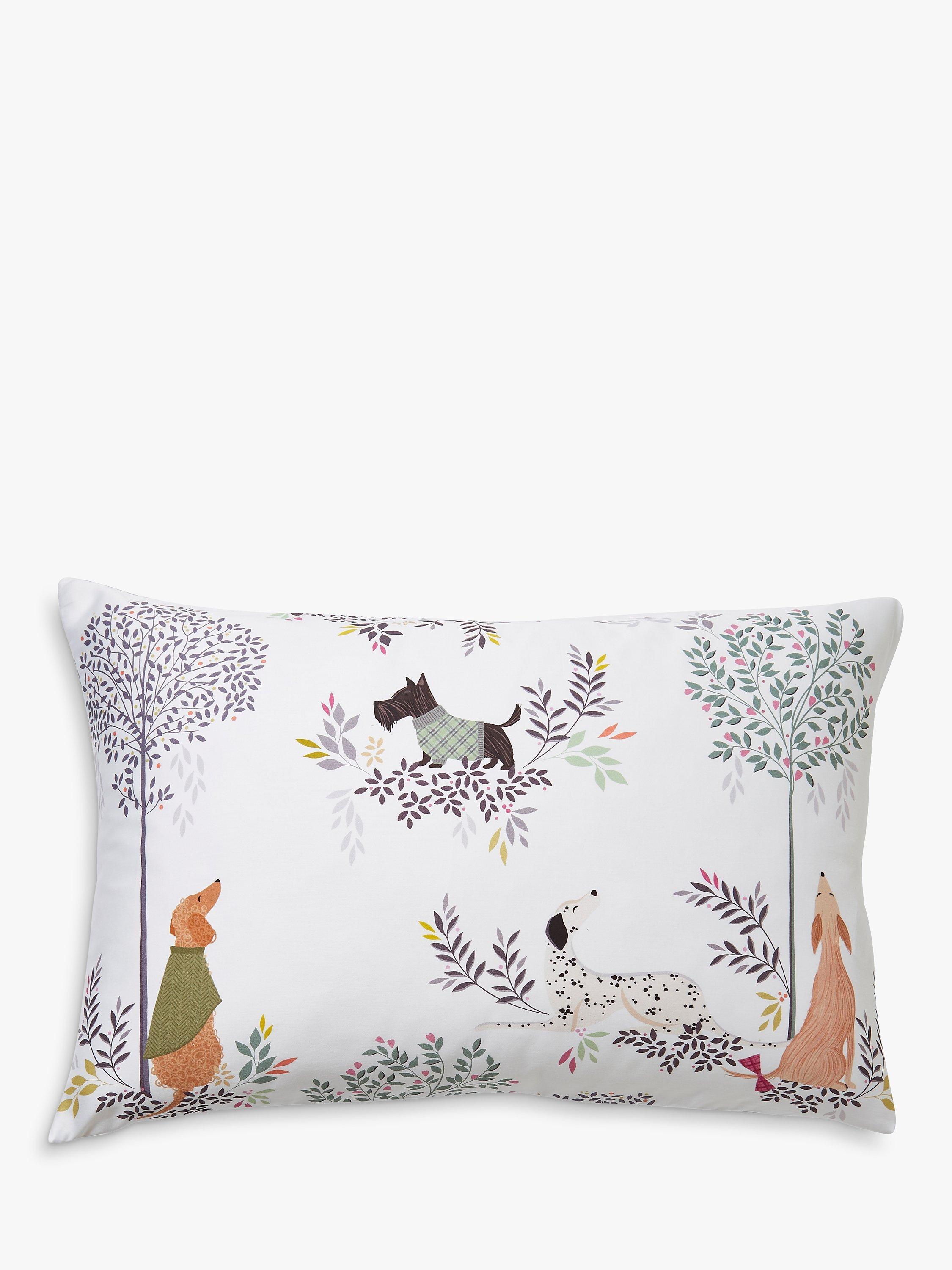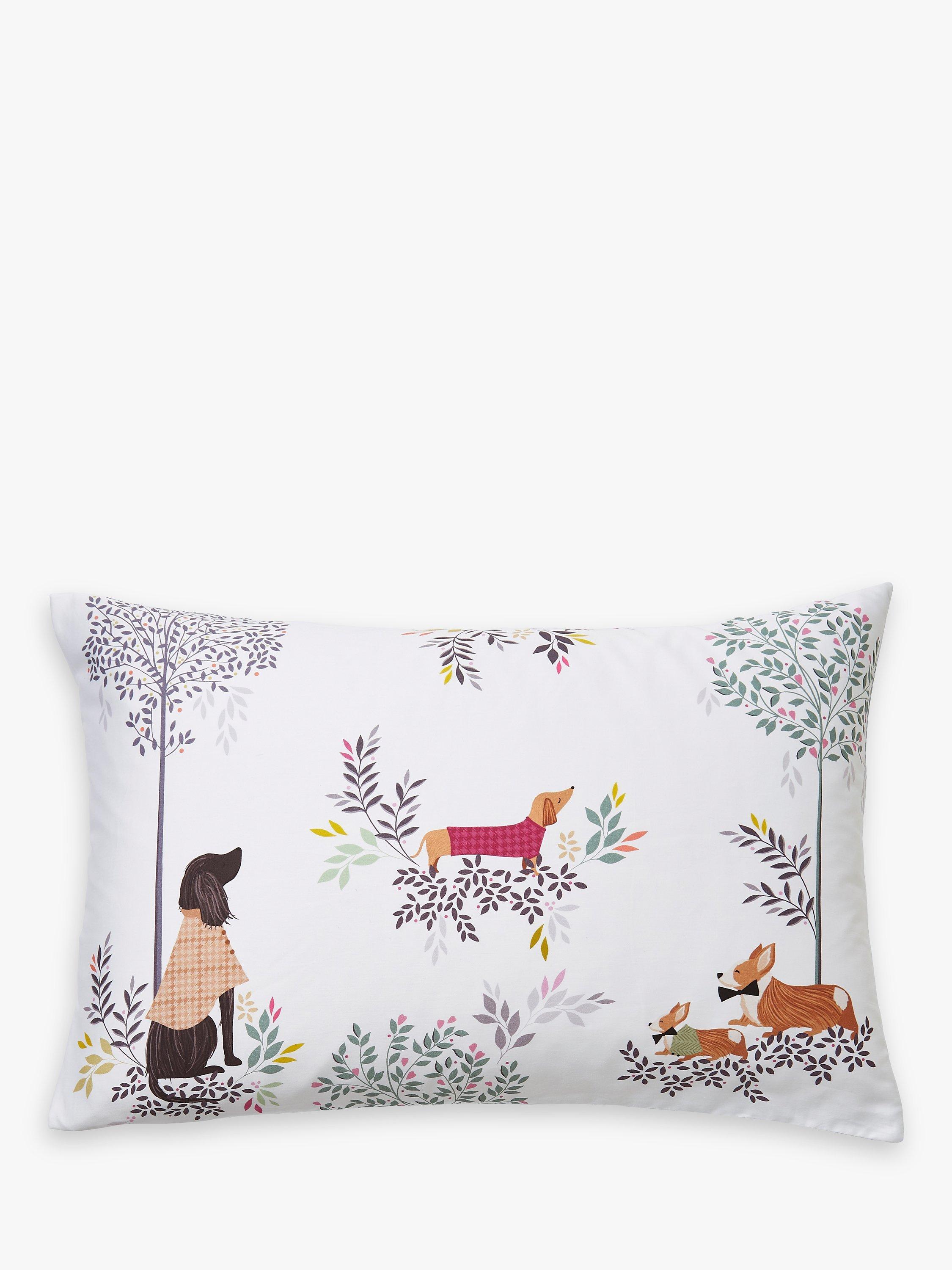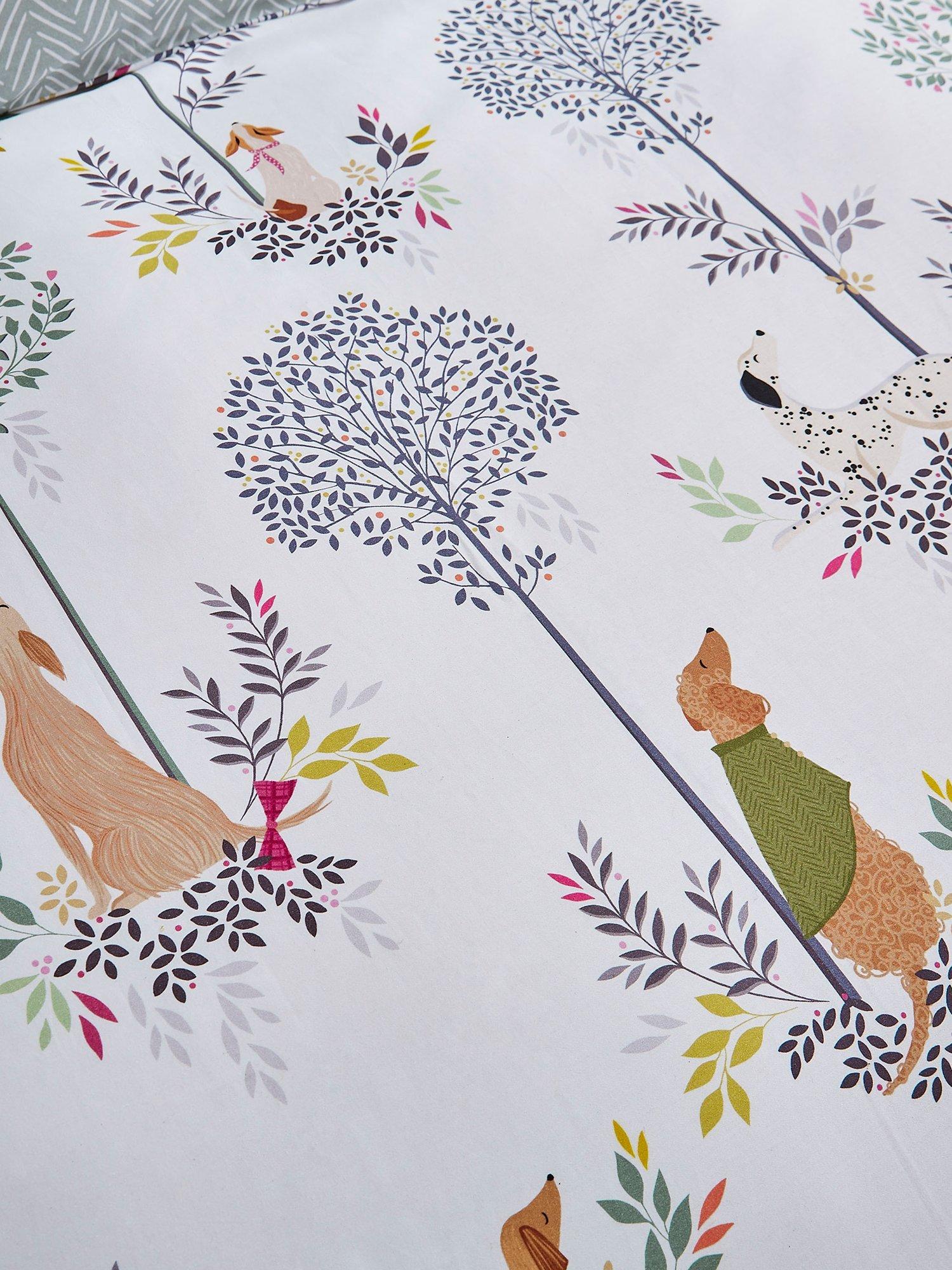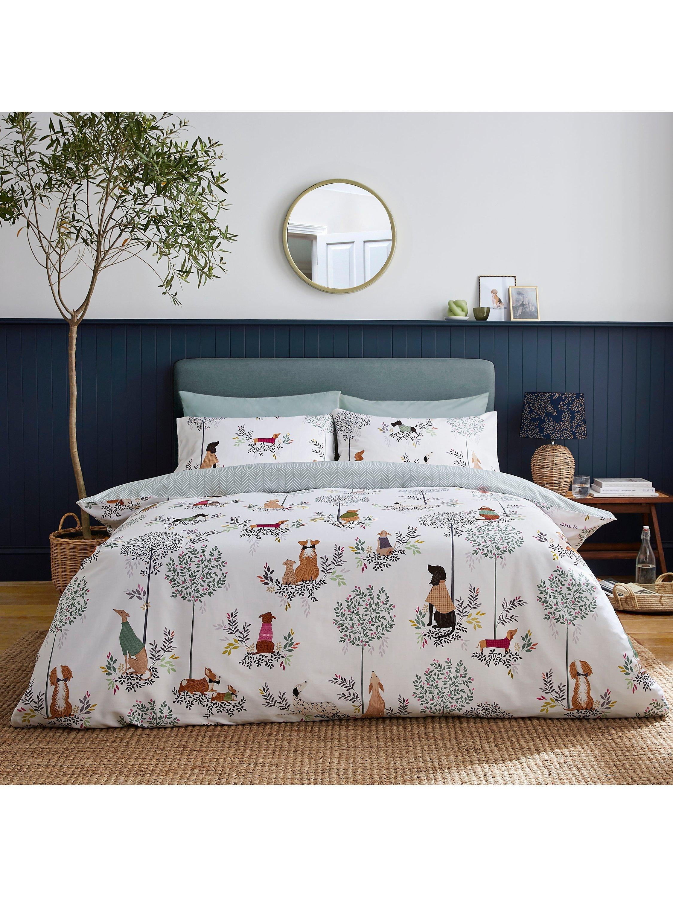 This charming Dapper Dogs duvet cover set from Sara Miller London features array of well-dressed dogs amid amongst beautiful woodland. Printed on plush 220 thread count 100% cotton sateen on crisp white with coordinating soft green herringbone print underside, this playful print will add character to any room.