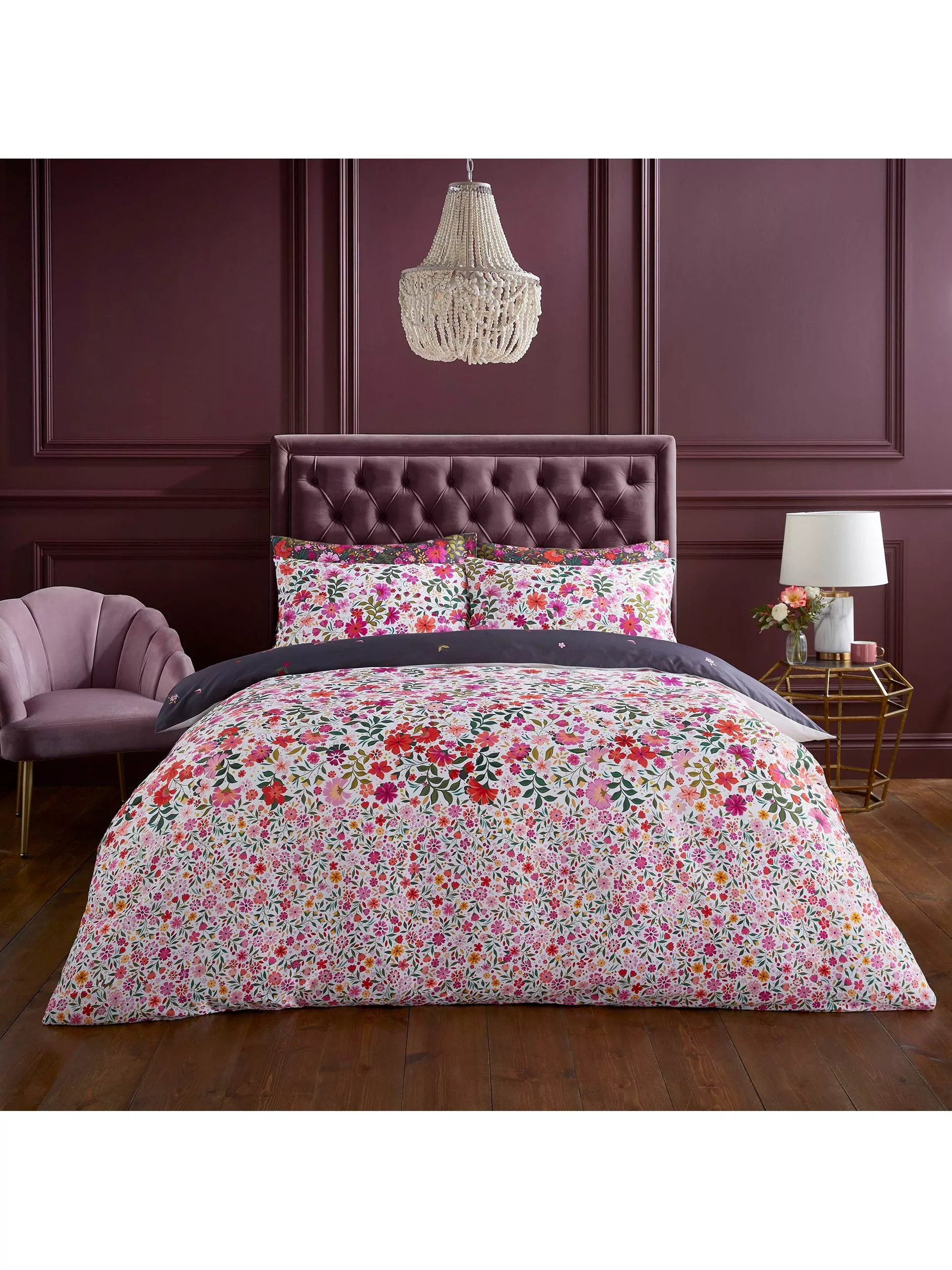 Sleep beneath an abundance of blossoms and butterflies in this reversible Ditsy Floral Bed Linen set from Sara Miller London. Bees, ladybirds and butterflies nestle amongst the pink and purple petals in full bloom on a crisp white and against a deep mulberry on the reverse.