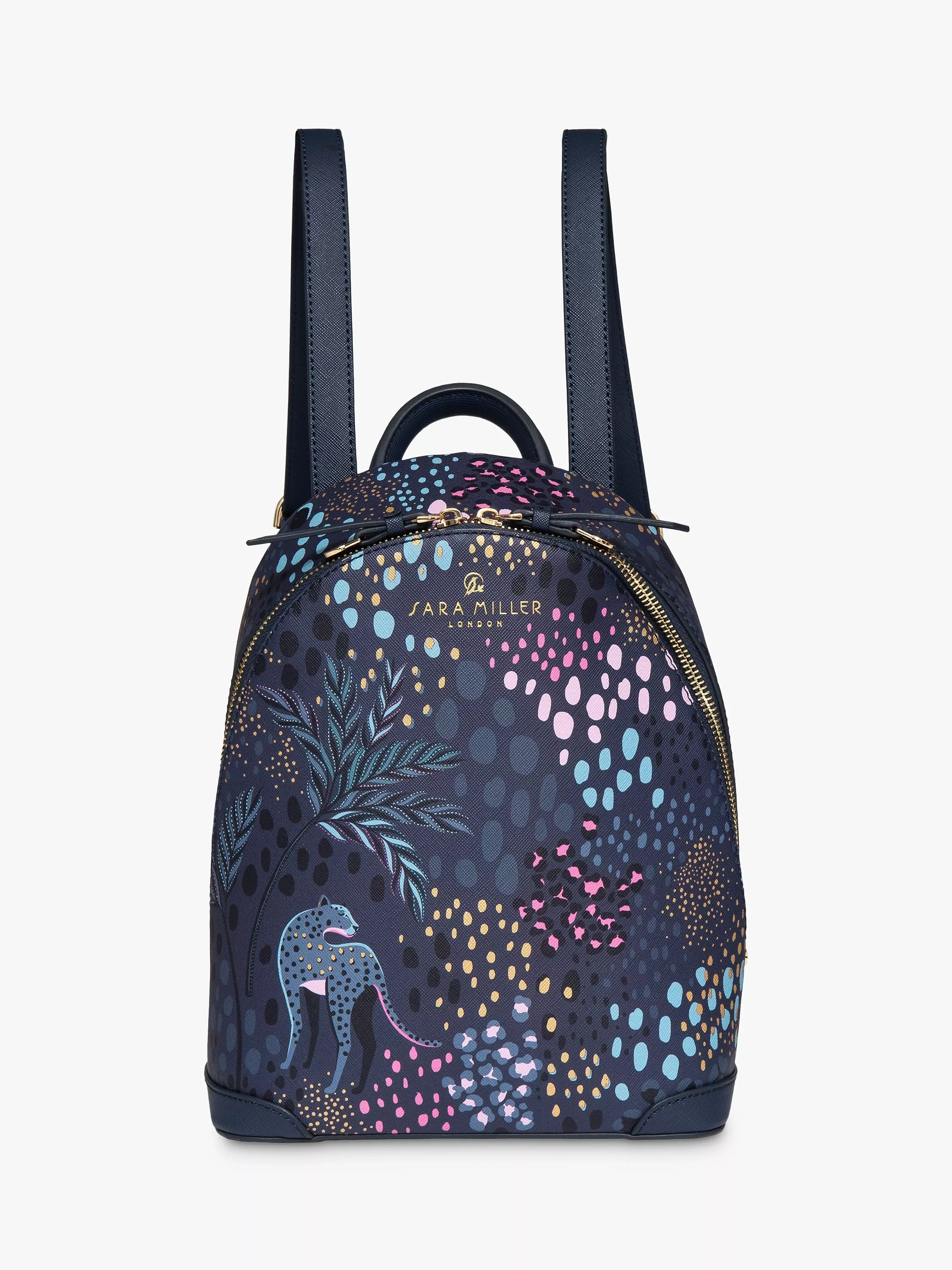 A practical yet stylish mini backpack perfectly designed for your everyday essentials and ideal for a day out exploring. The exotic Midnight Leopard print makes it easy to wear with the added luxury of the decorative gold foil print. Featuring one main compartment with a 2-way-zip opening, buckle adjustable shoulder straps and a handy grab handle. Embellished with a delicate gold logo, etched Sara Miller London zip pulls and gold studs, the intricate gold detailing is beautifully set against the durable yet luxurious saffiano embossed fabric.