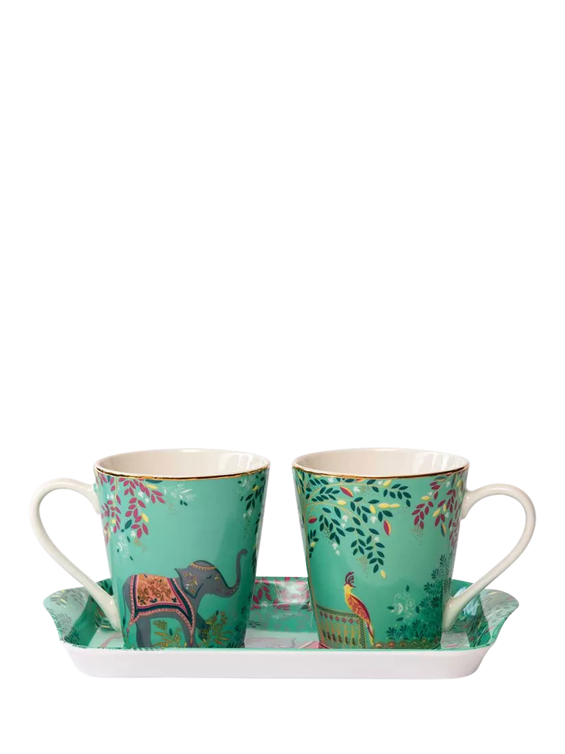 Sara MillerIndia Elephant Oasis 22ct Gold Porcelain Mugs & Melamine Tray Set, 180ml, Green