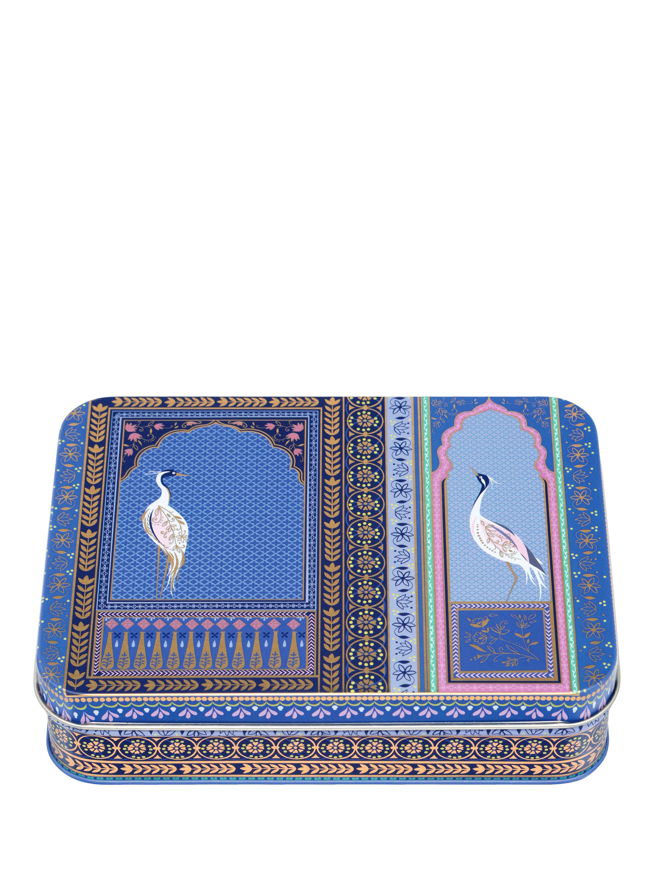 This eye-catching small storage tin features graceful storks perched among the frescoed archways and elegant latticework windows of a Haveli courtyard house. From the India Collection designed by Sara Miller London.