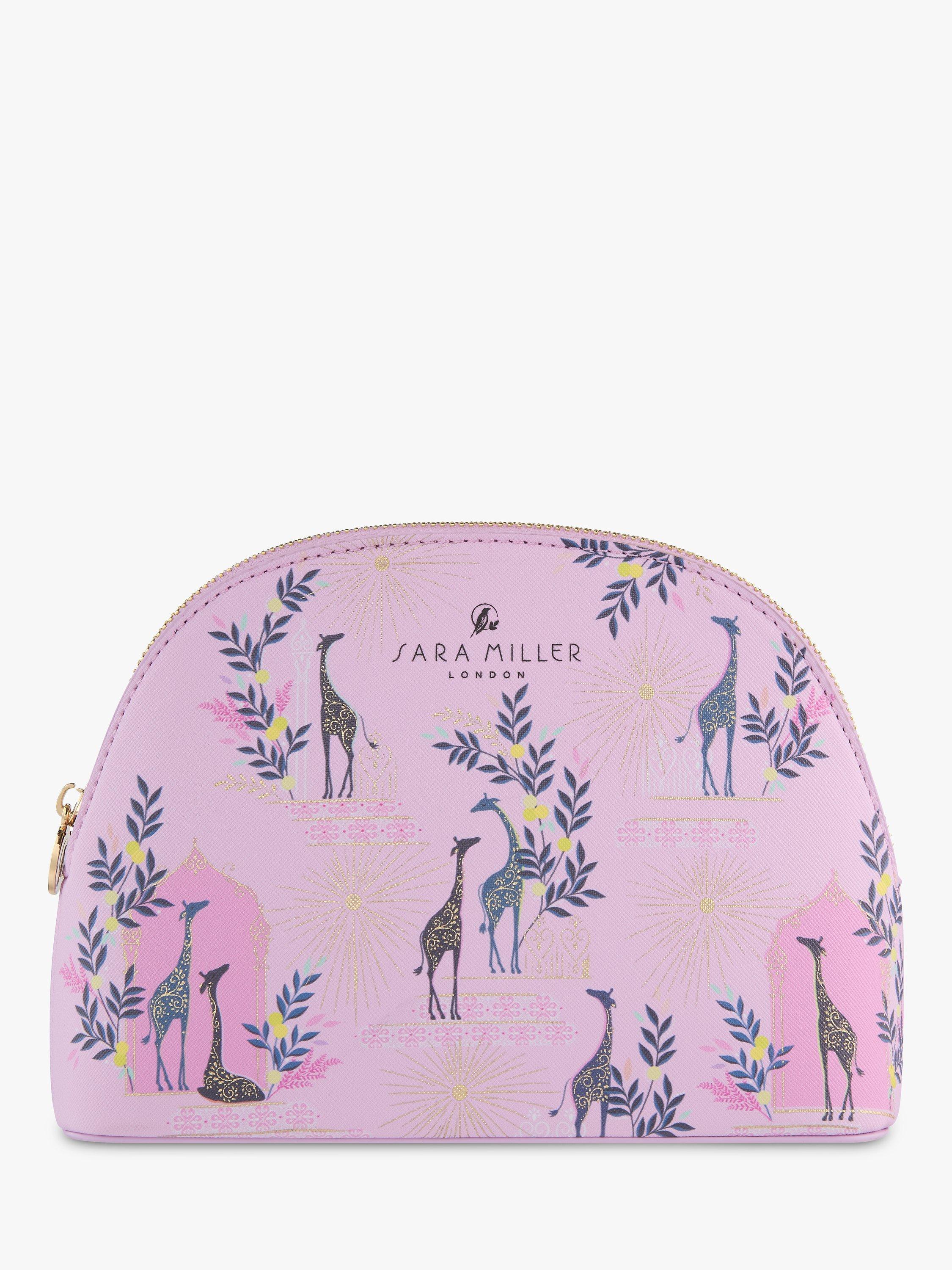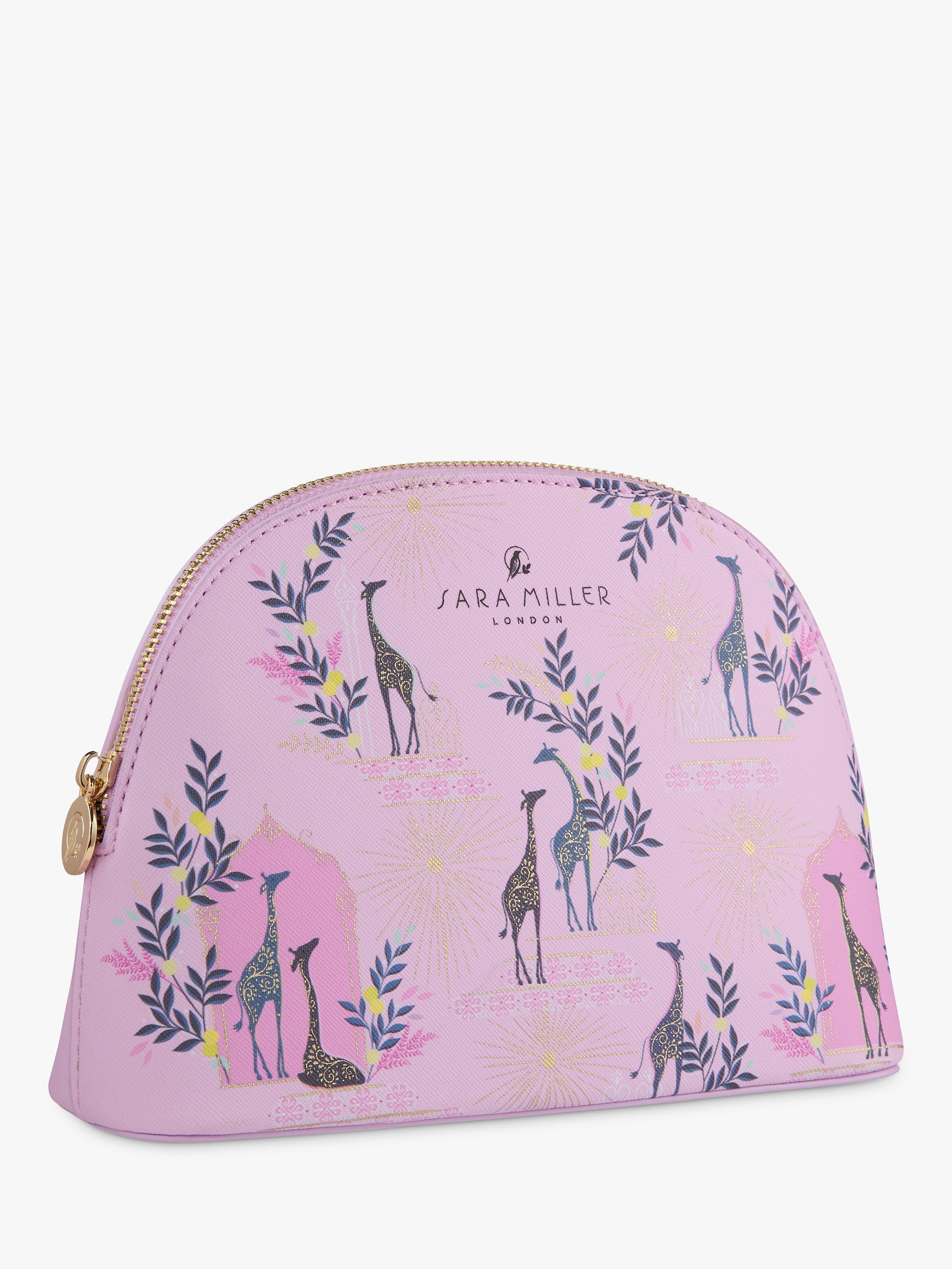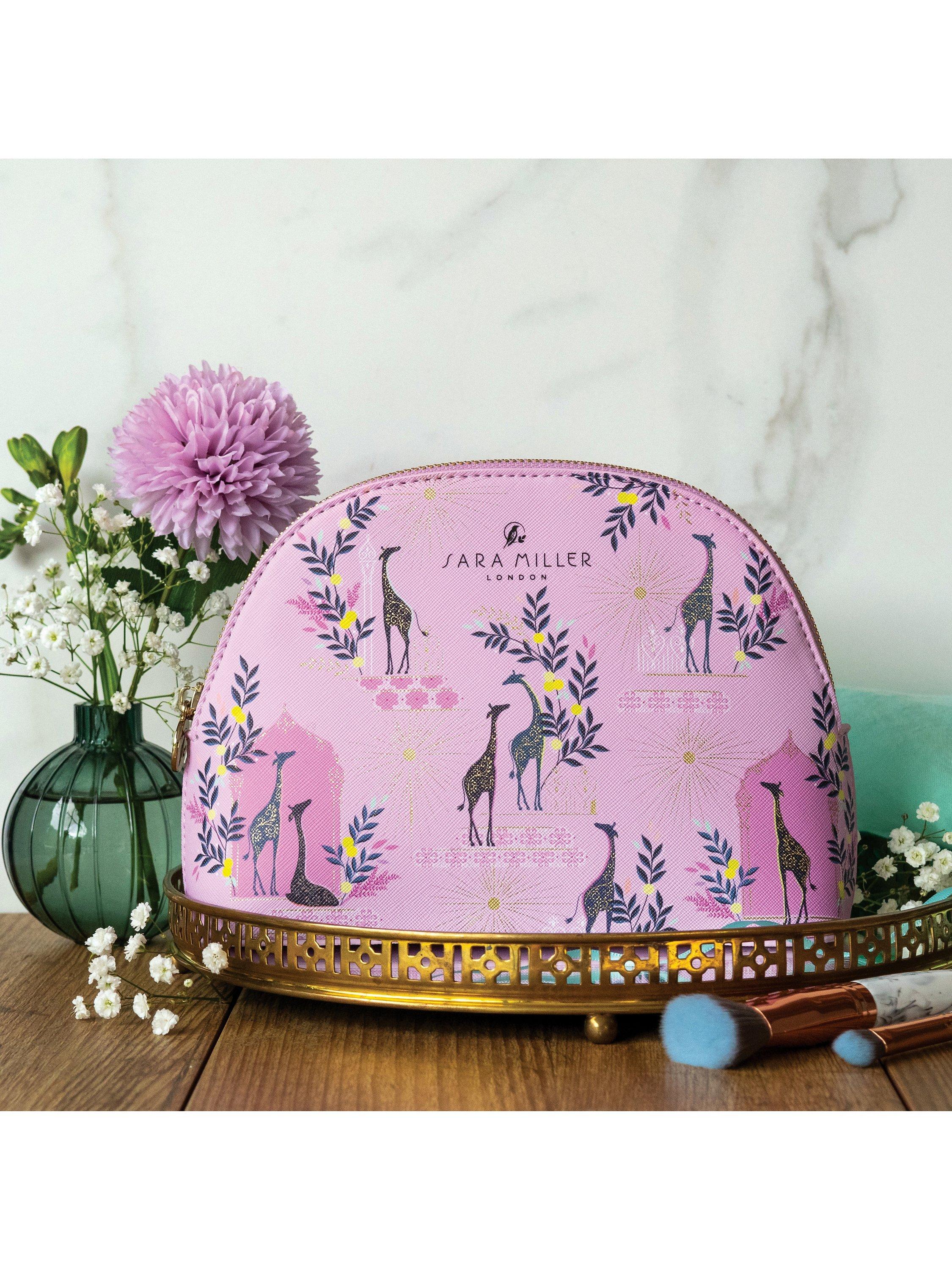 Perfect for a beauty bag upgrade, this elegant, medium sized cosmetic bag features the playful Savannah print. Crafted from soft pink vegan leather decorated with basking giraffes amongst tropical foliage, it is the ideal size for your weekend-away beauty essentials.