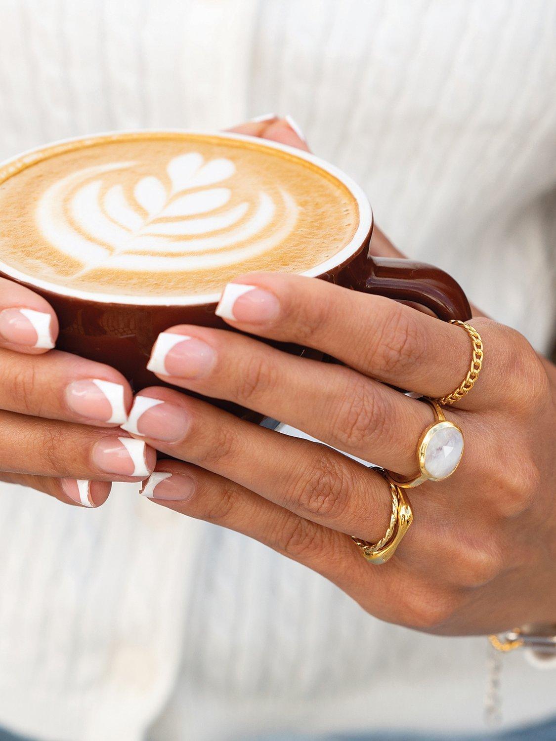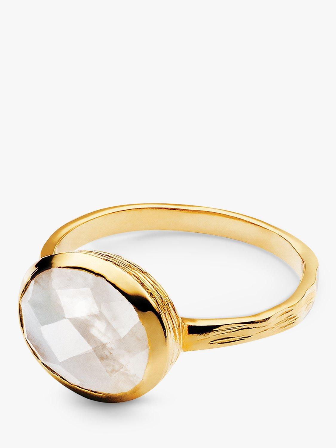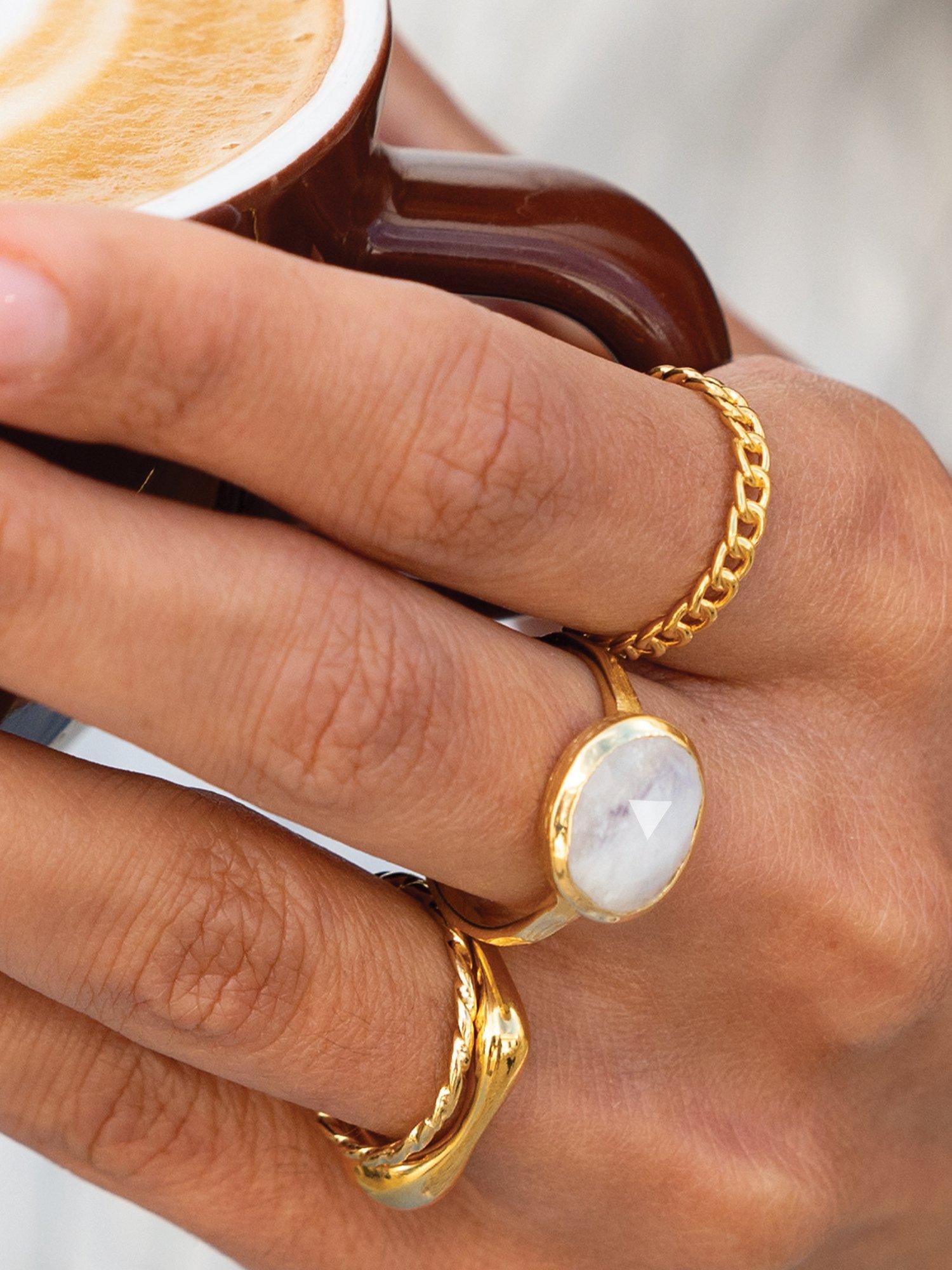 This stunning facet-cut Rainbow Moonstone oval ring from Sarah Alexander is set in an elegant, balanced design of 18ct gold plate on Jewellers Brass.