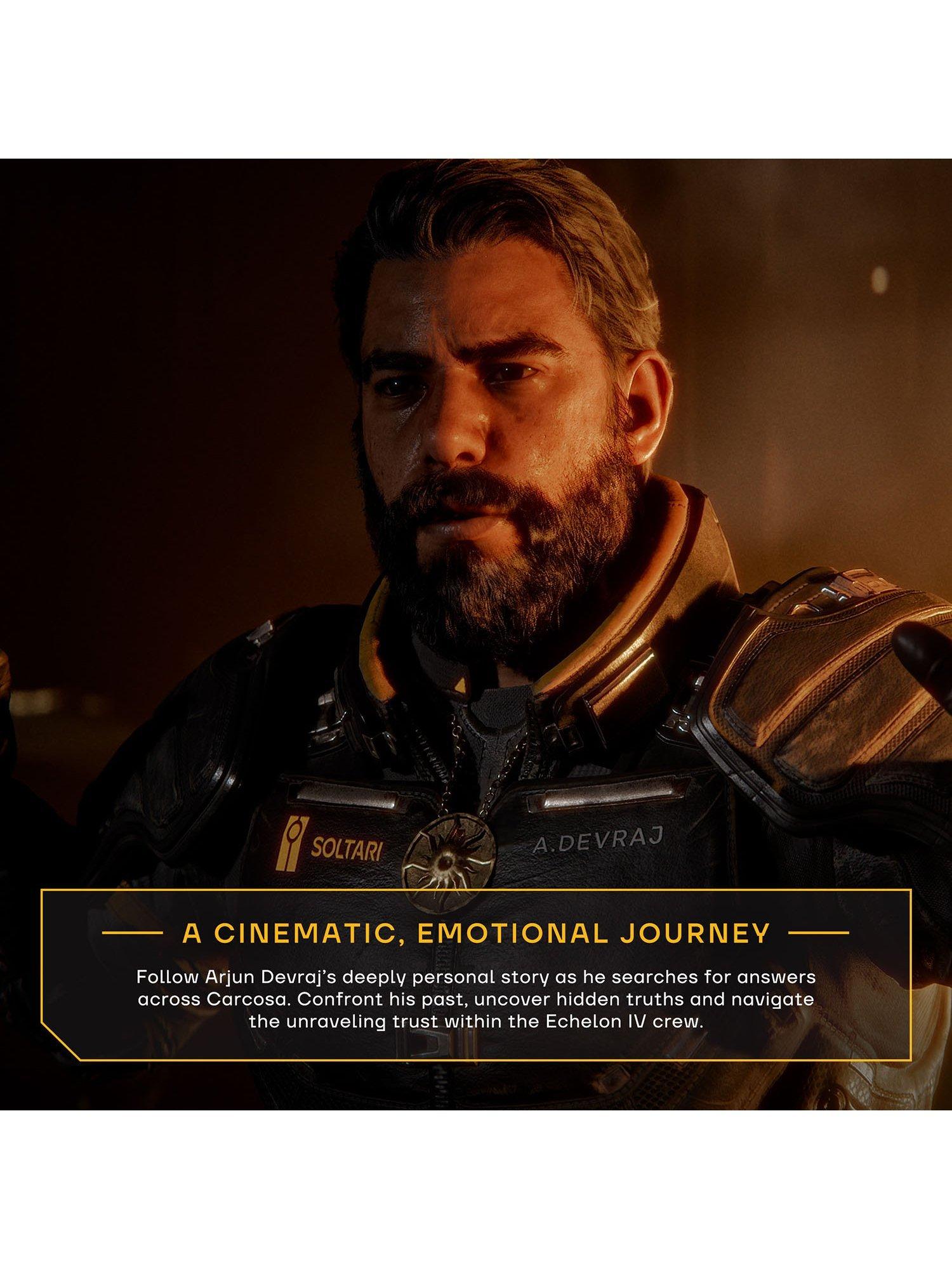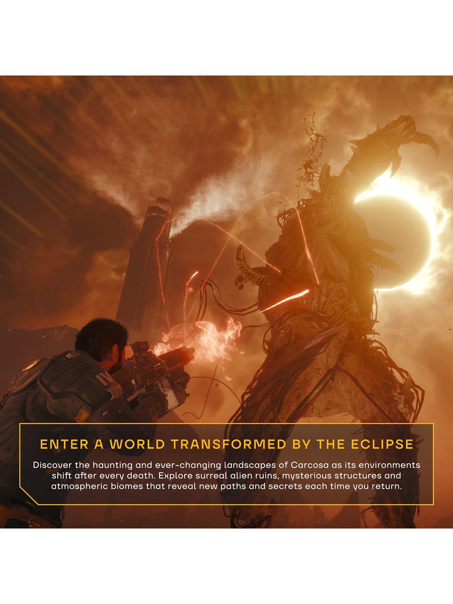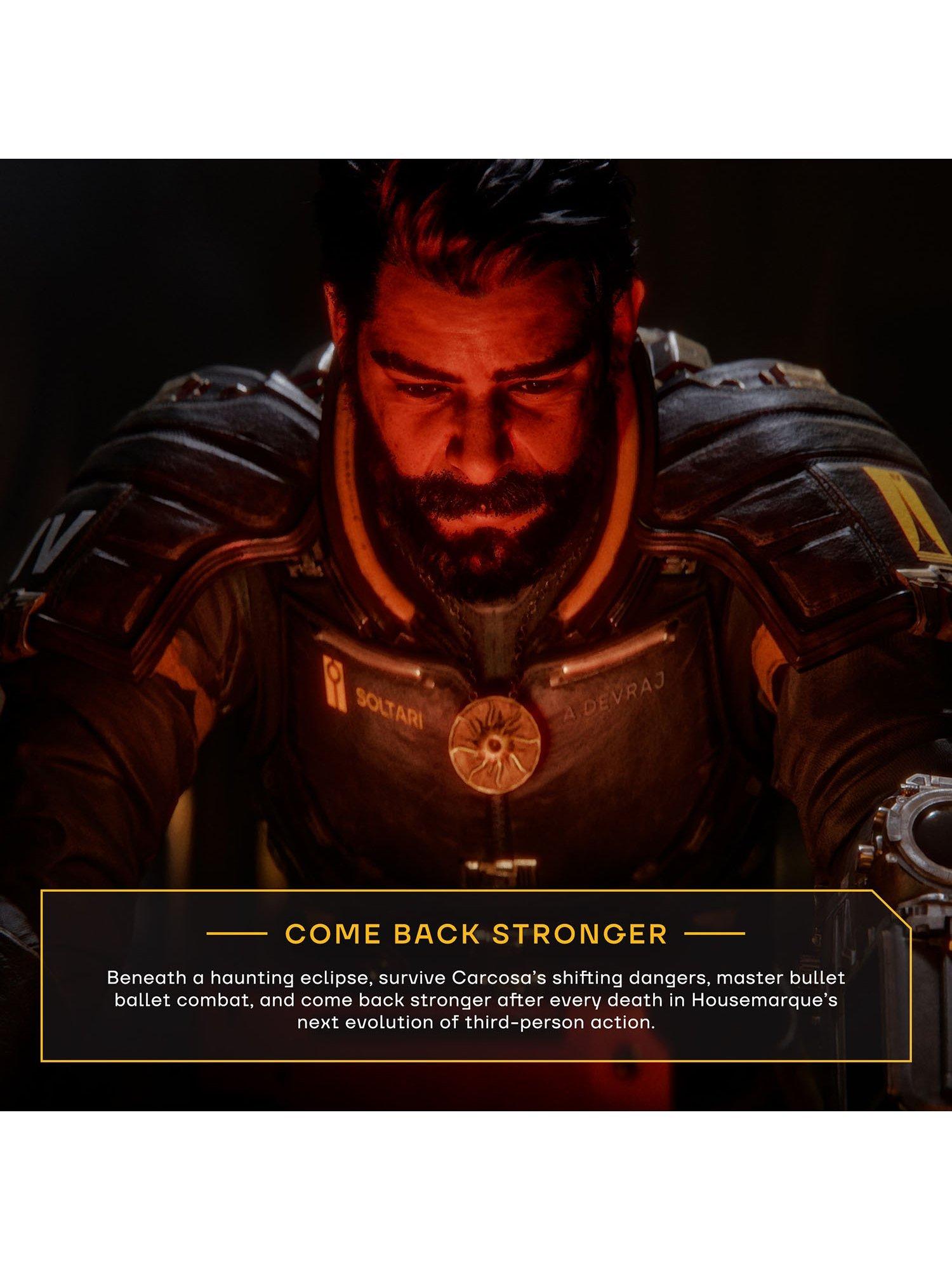 Discover a dark, personal story of a man bound to a world that corrupts everything it touches. Set on the shape-shifting planet Carcosa, SAROS is a standalone cinematic action experience from Housemarque. The story follows Arjun Devraj, a haunted Soltari enforcer driven by loss, regret and an unrelenting need for answers. Drawn into Carcosa’s violent beauty and cosmic horrors, Arjun searches for the truth behind the Eclipse: a sinister force that distorts the world, and everyone within it.