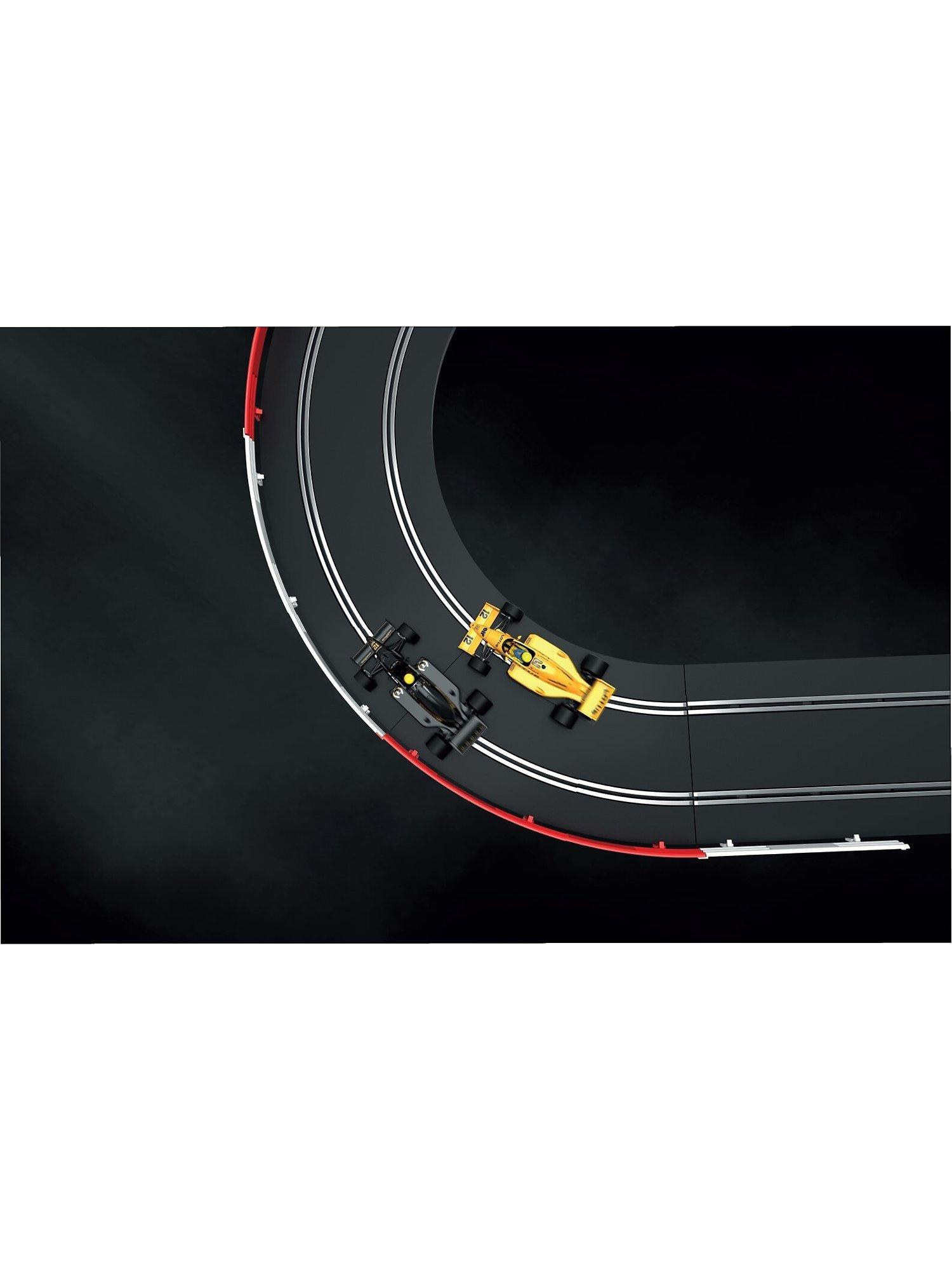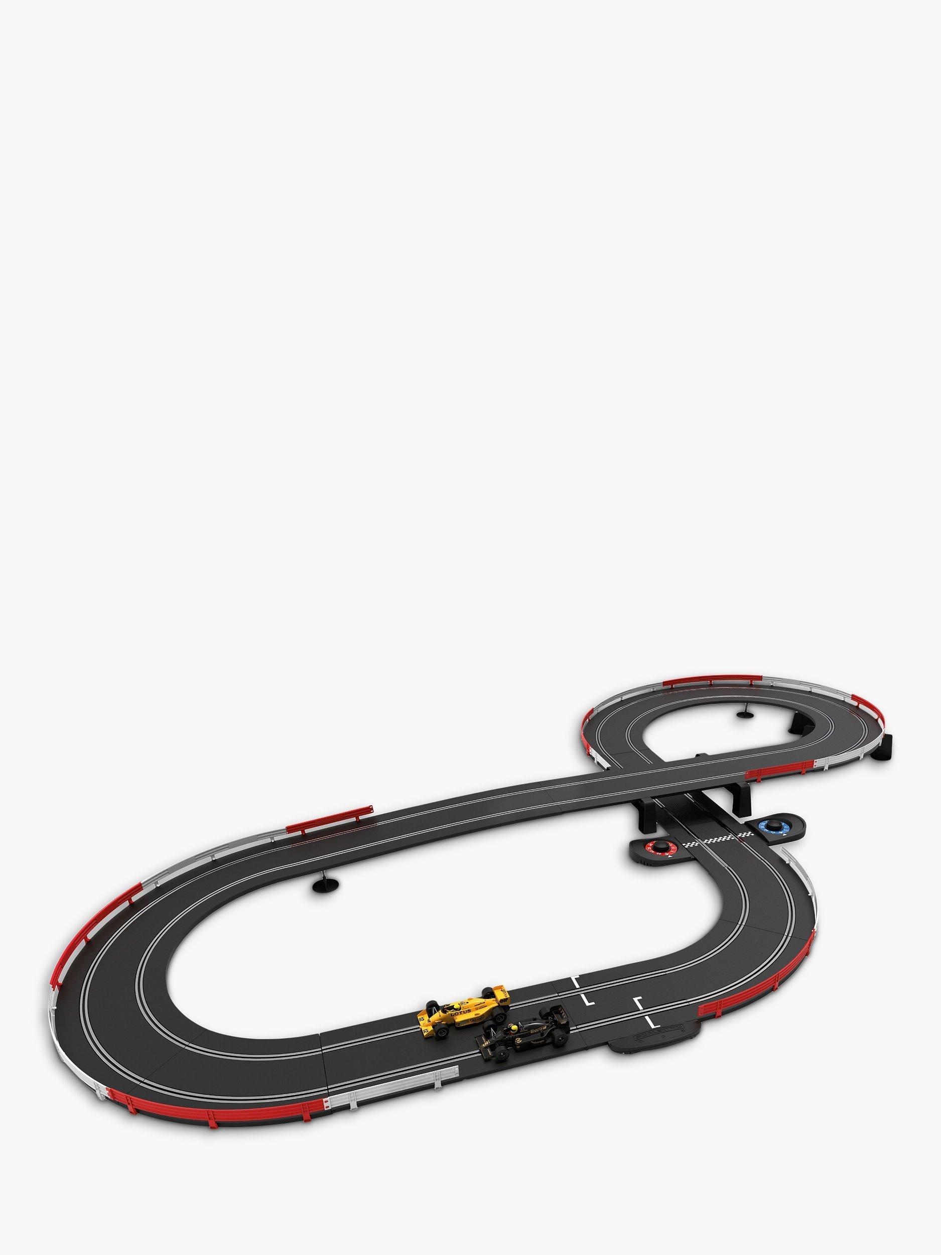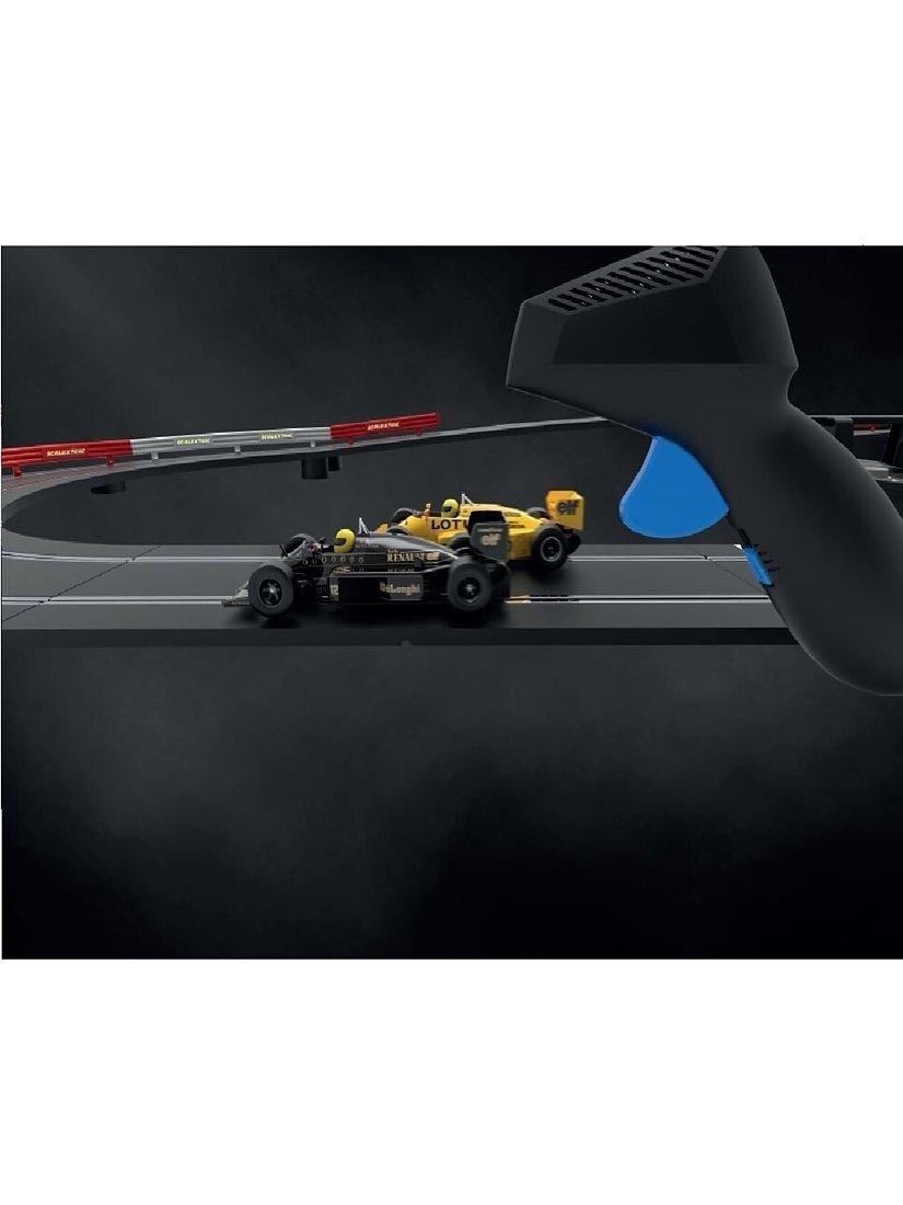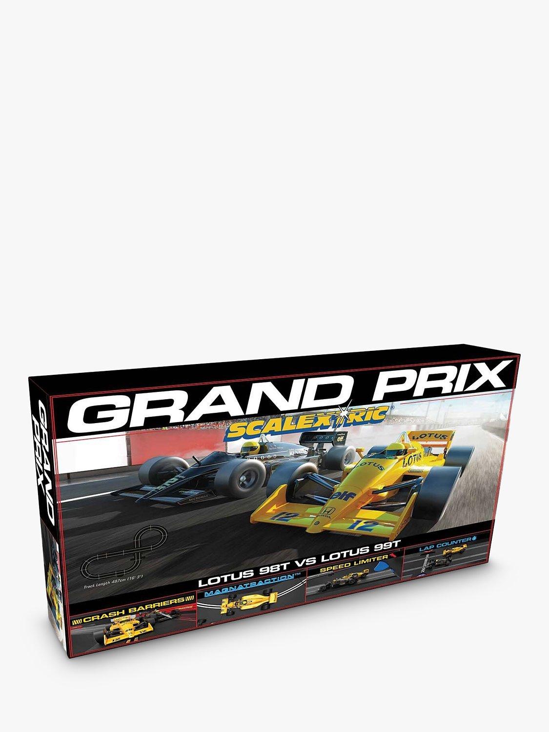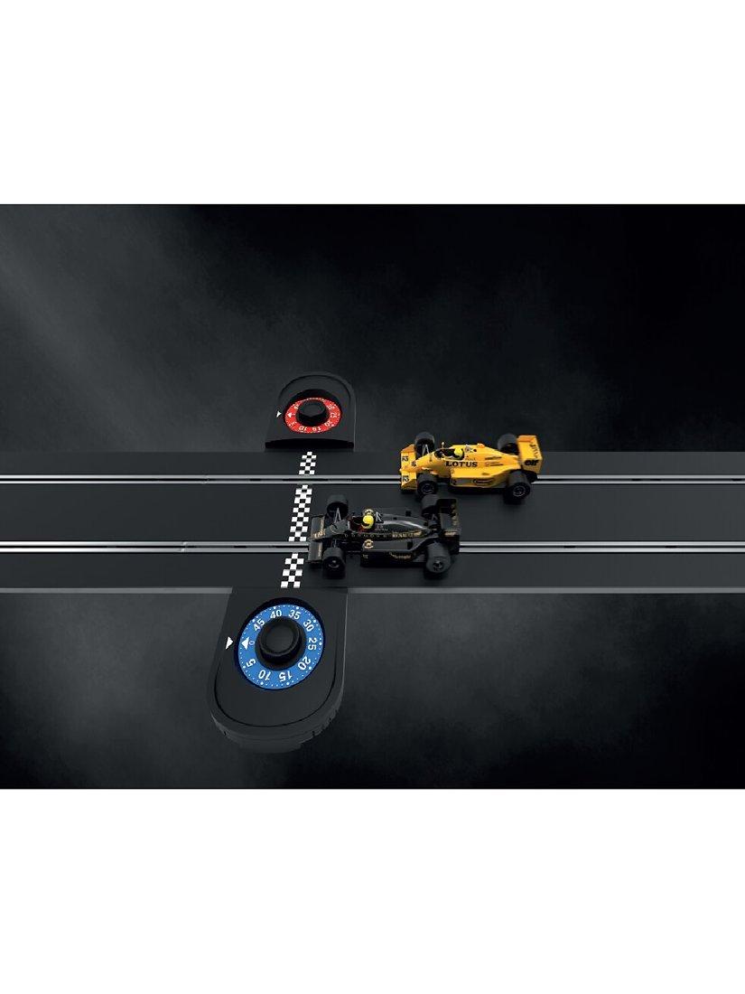 Two iconic Lotus Formula One cars of the 1980s go head-to-head in this fantastic new retro set from Scalextric! The sleek black Lotus 98T of the world-famous Ayrton Senna goes head-to-head with his amazing yellow 99T as they fight for position around the circuit, with Turbos chattering and wastegates fluttering these famous Grand Prix racers are sure to light up your circuit! This set contains everything you need to race Scalextric, including two cars, power, over 5.3 metres of track including a lap counter, 2 easy speed limiting hand controllers and crash barriers.