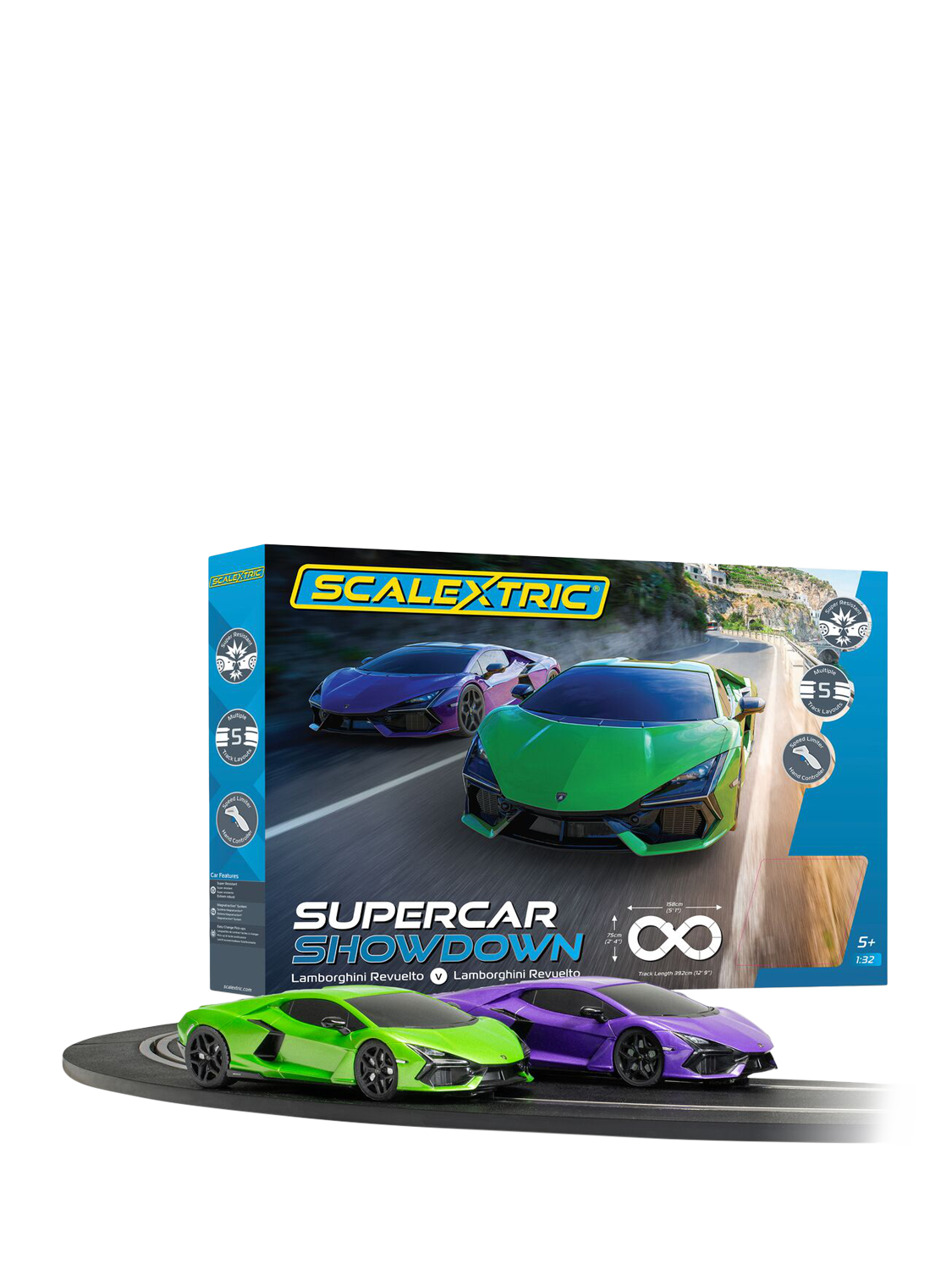 The set also includes speed-limiter hand controllers, allowing racers to fine-tune their pace for maximum control and precision. Whether you're taking on friends or perfecting your lap times solo, the Supercar Showdown brings the power and excitement of supercar racing to your living room.