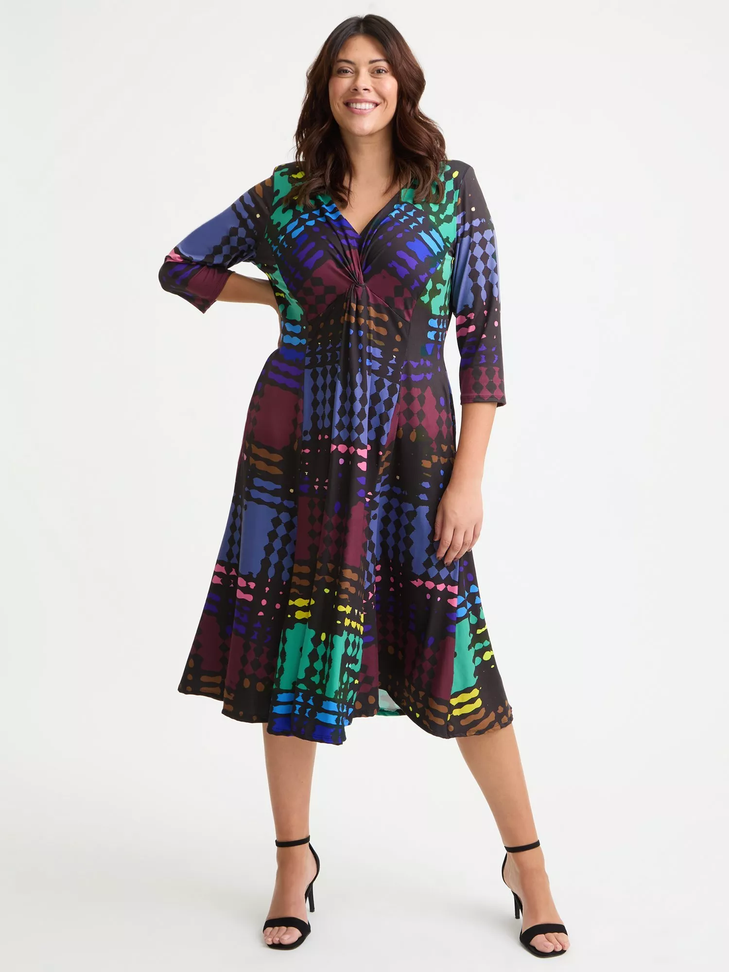 Elevate your seasonal wardrobe in this form-flattering fit and flare dress. Designed in a super soft 'peach touch' polyester elastane stretch fabric. This piece boasts a beautiful knot front detail and a swishy skirt for added movement. Falls to a mid-length with ¾ sleeves, v neck and princess seams for shape.