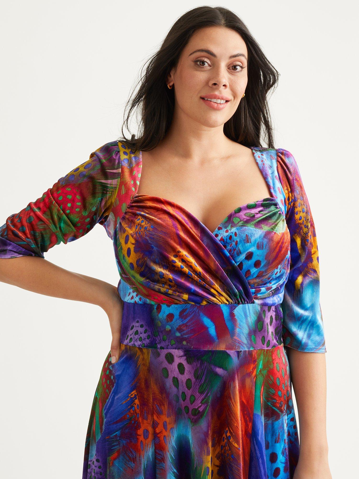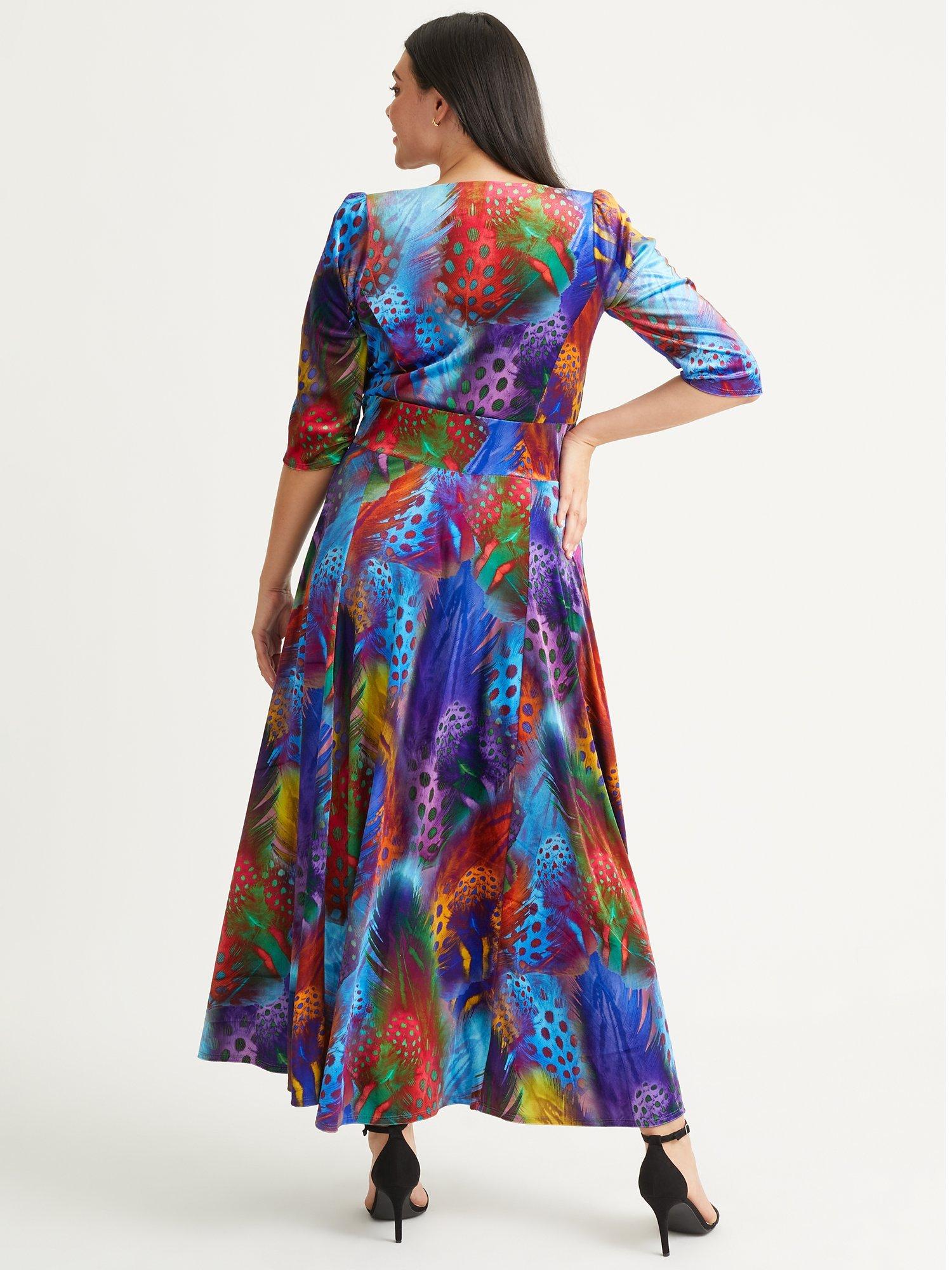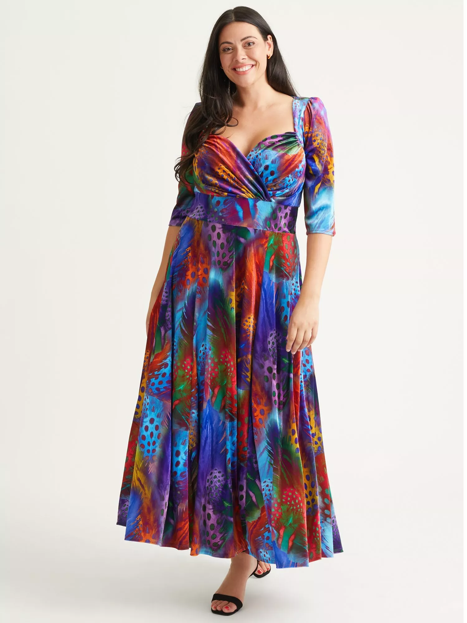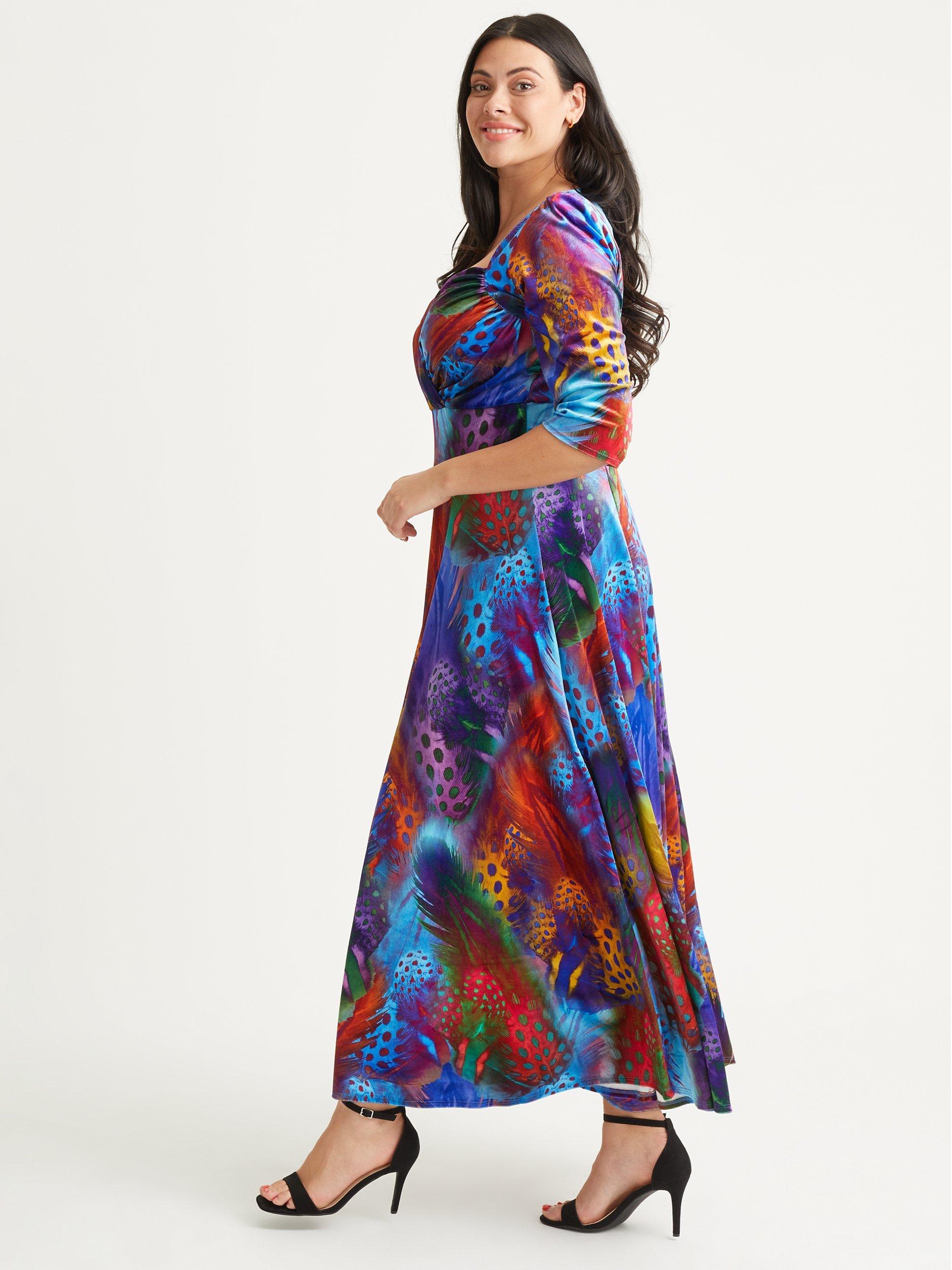 Constructed with a nipped in waist and flared hem, this floor-length dress from Scarlett & Jo is crafted from a blend of fabrics. With a charming, sweetheart neckline and three quarter length sleeves, it is splashed with an abstract print.