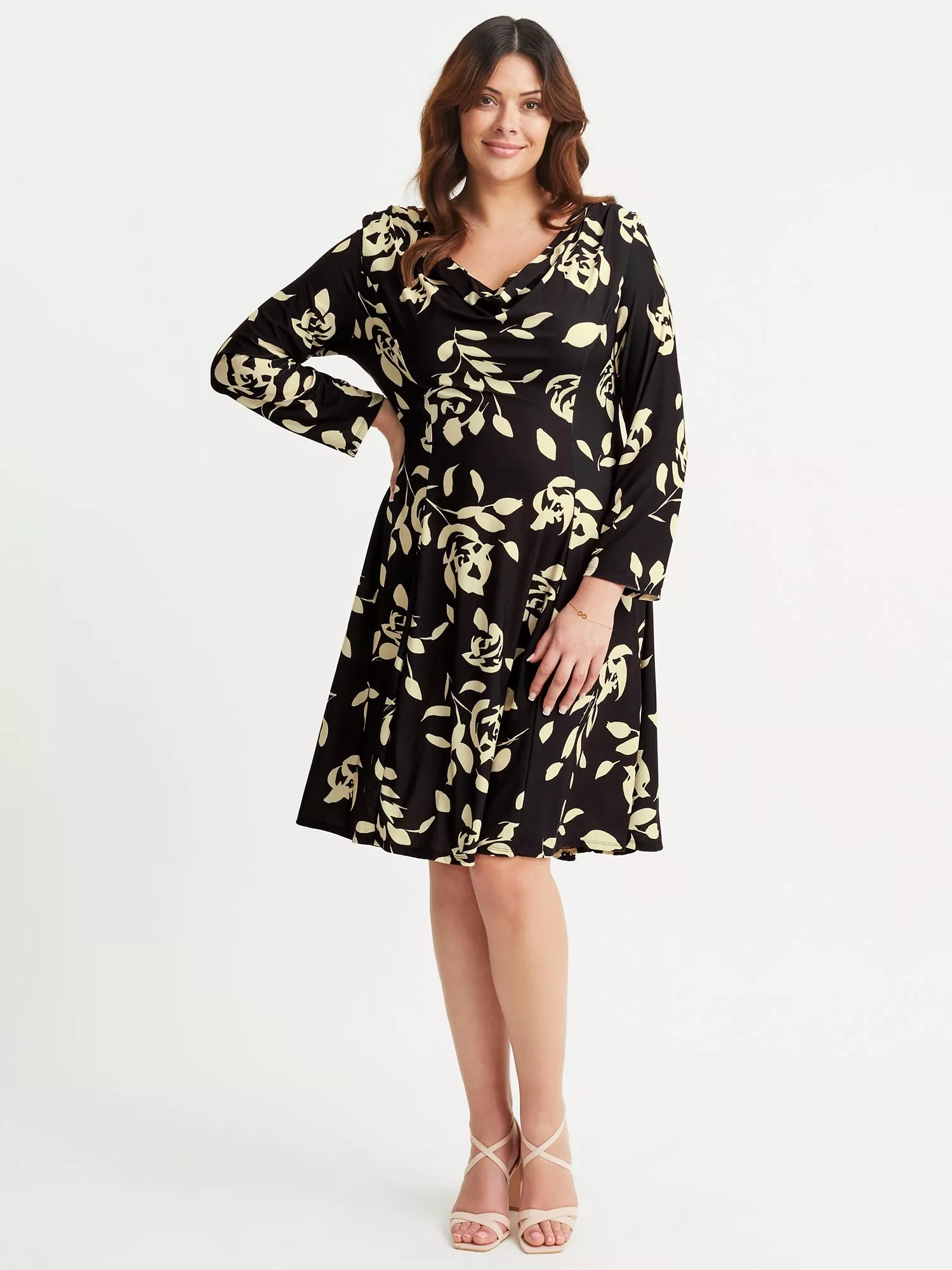 A beautiful princess line cowl neck dress that features long sleeves and is softly tailored in silk touch crepe jersey by Scarlett & Jo®. This princess line falls below the knee gently flared from the hips. There are detachable small shoulder pads. Great for office wear to early evening functions.