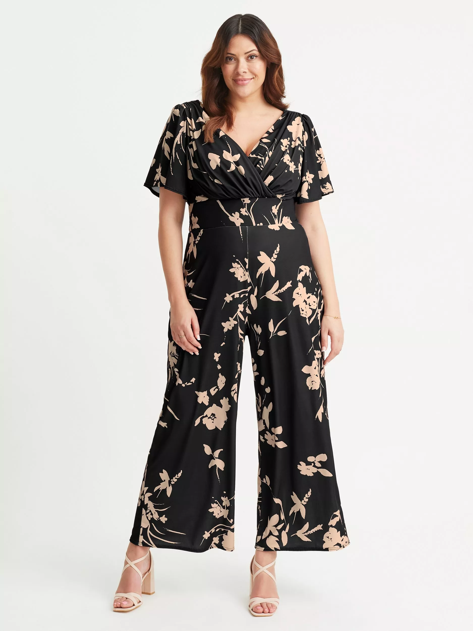 Designed to flatter all body shapes, our jumpsuit has self-tie fastening, angel wing sleeves, a v shaped neckline, soft shoulder pads and wide leg trouser. Dress it up or down for a fabulous look!
