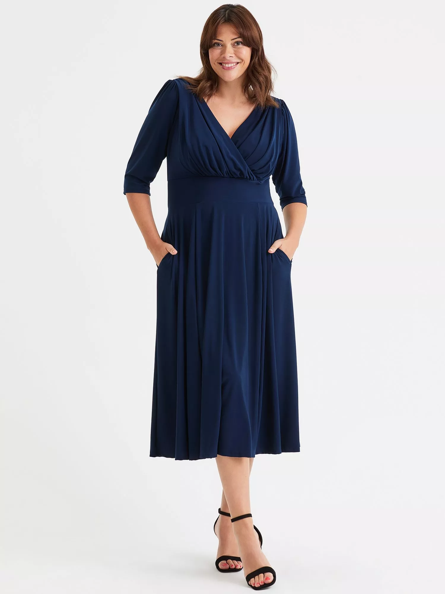 This truly beautiful dress is very comfortable to wear. It features a flattering wrap v neck bodice supported by Scarlett & Jo's signature MagicBand® inbuilt waist corset that enhances shape. This gown also features a fully flowing skirt that tapers to swish and swirl. The dress has 3/4 sleeves set into a pretty shoulder line with small detachable shoulder pads.