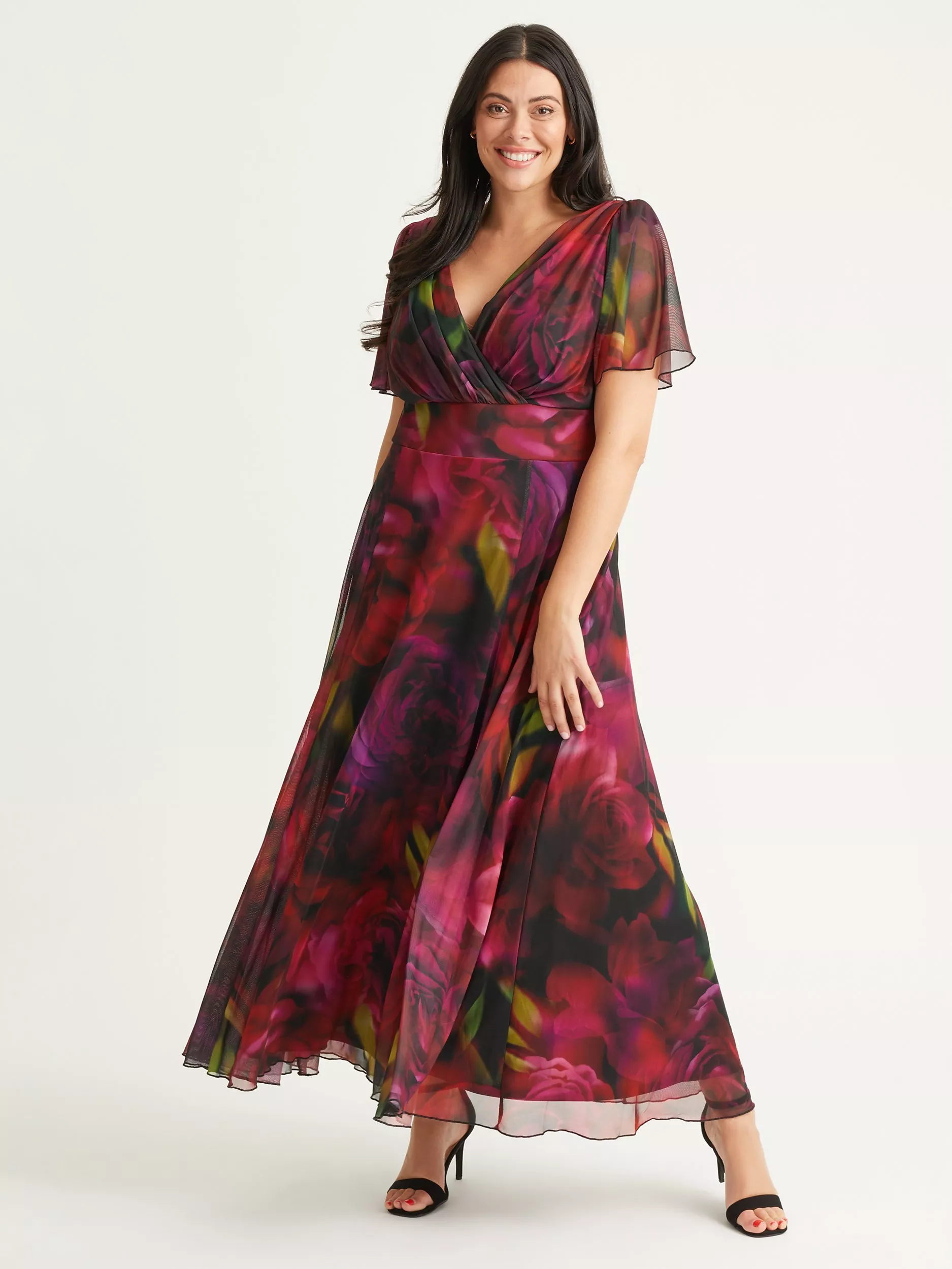 In an easy to wear A-line shape, this floor-length dress from Scarlett & Jo is crafted from a blend of fabrics. Effortlessly flattering thanks to a fuss-free v-neckline and short sleeves, this style proves that florals aren't just for spring.