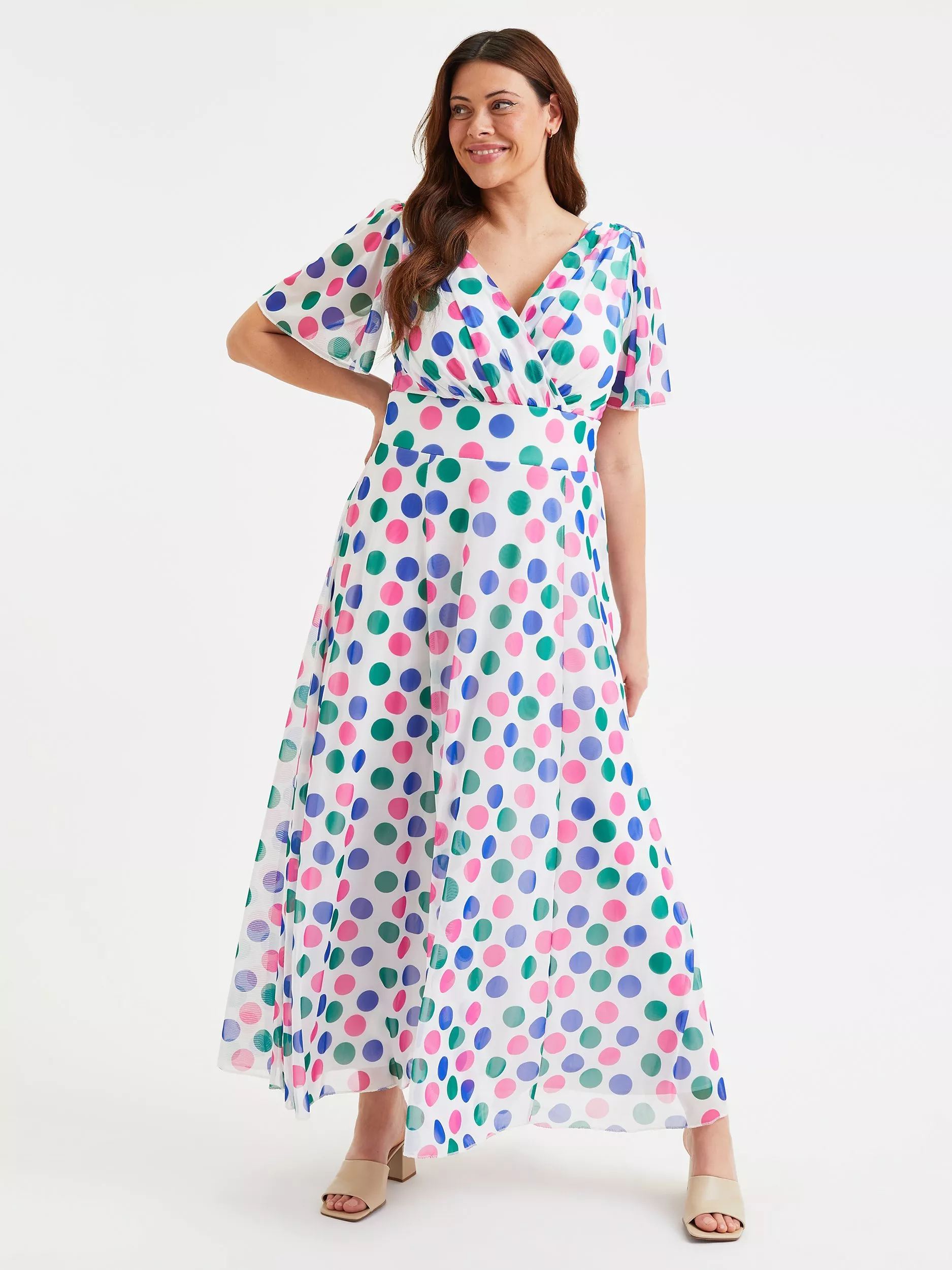 In a flattering fit that accentuates the waist, this floor-length dress from Scarlett & Jo is crafted from a blend of fabrics. Effortlessly flattering thanks to a fuss-free v-neckline and cap sleeves, it is swathed in multi-coloured polka dots for retro appeal.