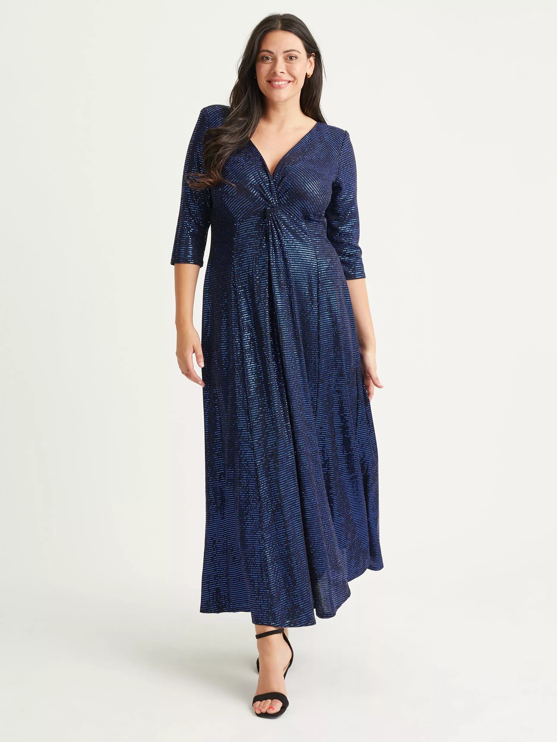 A tried-and-true favourite, this maxi dress from Scarlett & Jo is made using a blend of fabrics. With a fuss-free but smart v-neckline and elbow length sleeves, it is coated in shimmering metallics.