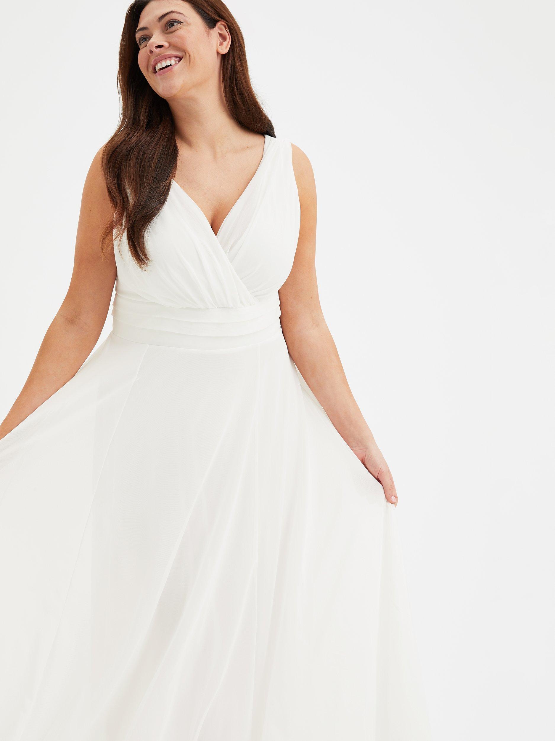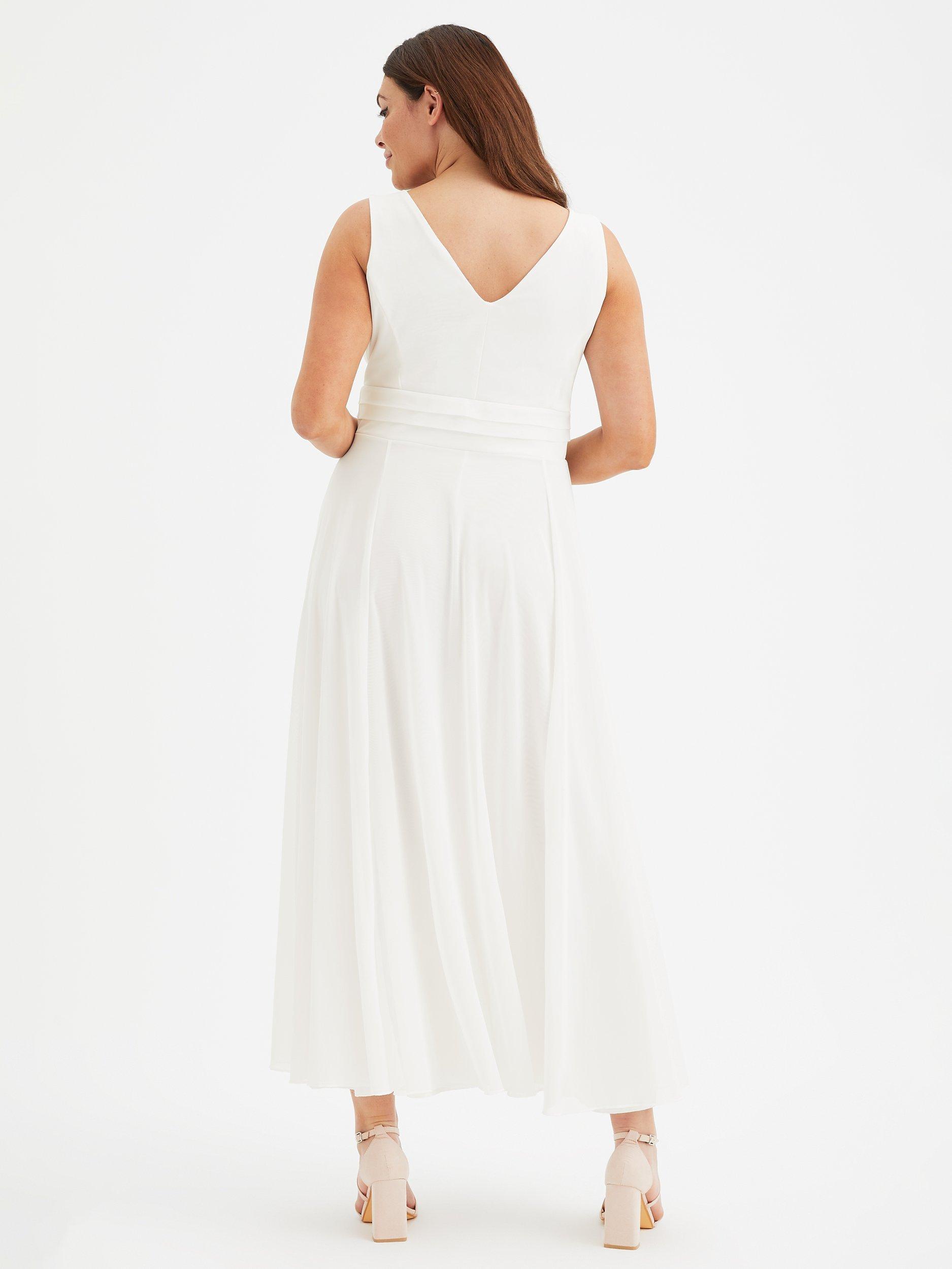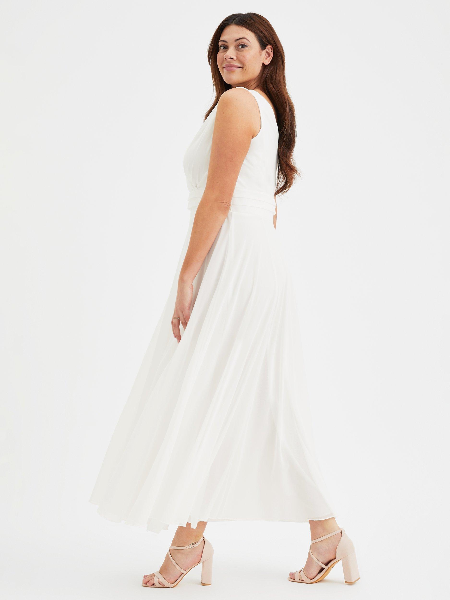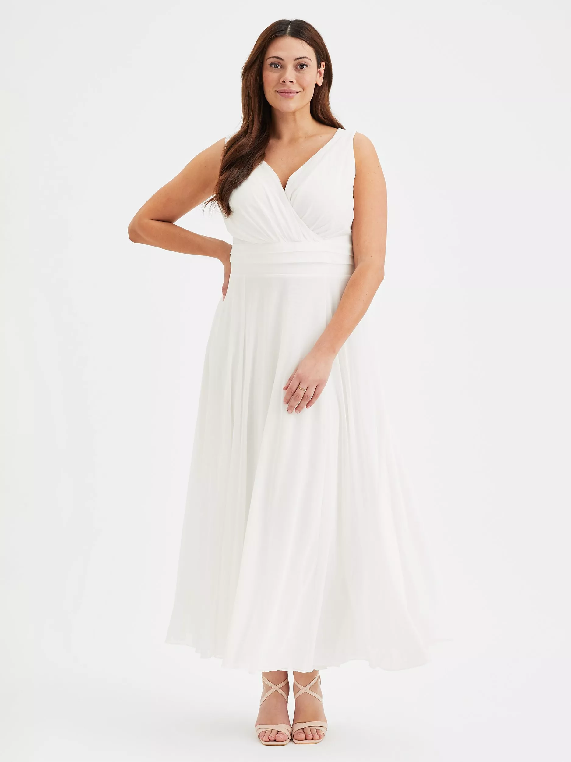 In a flattering fit that accentuates the waist, this floor-length dress from Scarlett & Jo is crafted from a blend of fabrics. A classic option thanks to the wrap over neckline, this sleeveless style is minimally detailed for endless wearability.