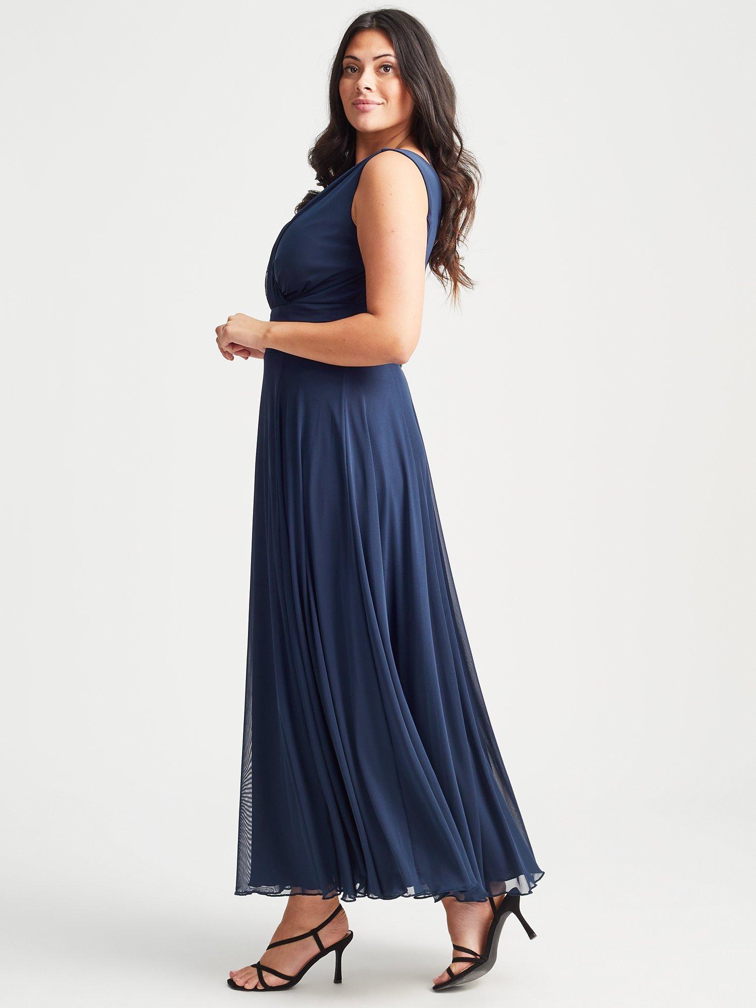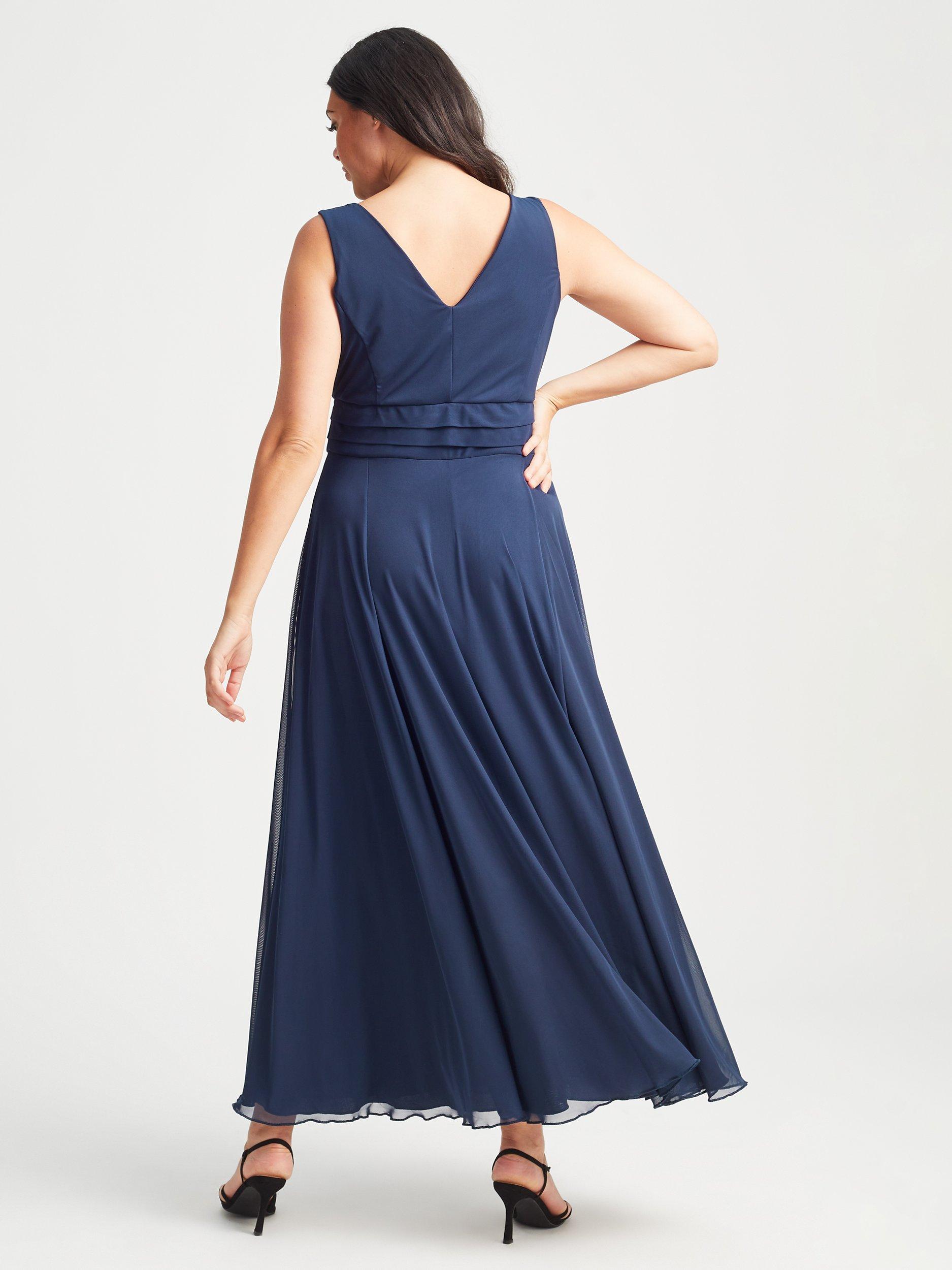 In a flattering fit that accentuates the waist, this floor-length dress from Scarlett & Jo is crafted from a blend of fabrics. A classic option thanks to the wrap over neckline, this sleeveless style is minimally detailed for endless wearability.