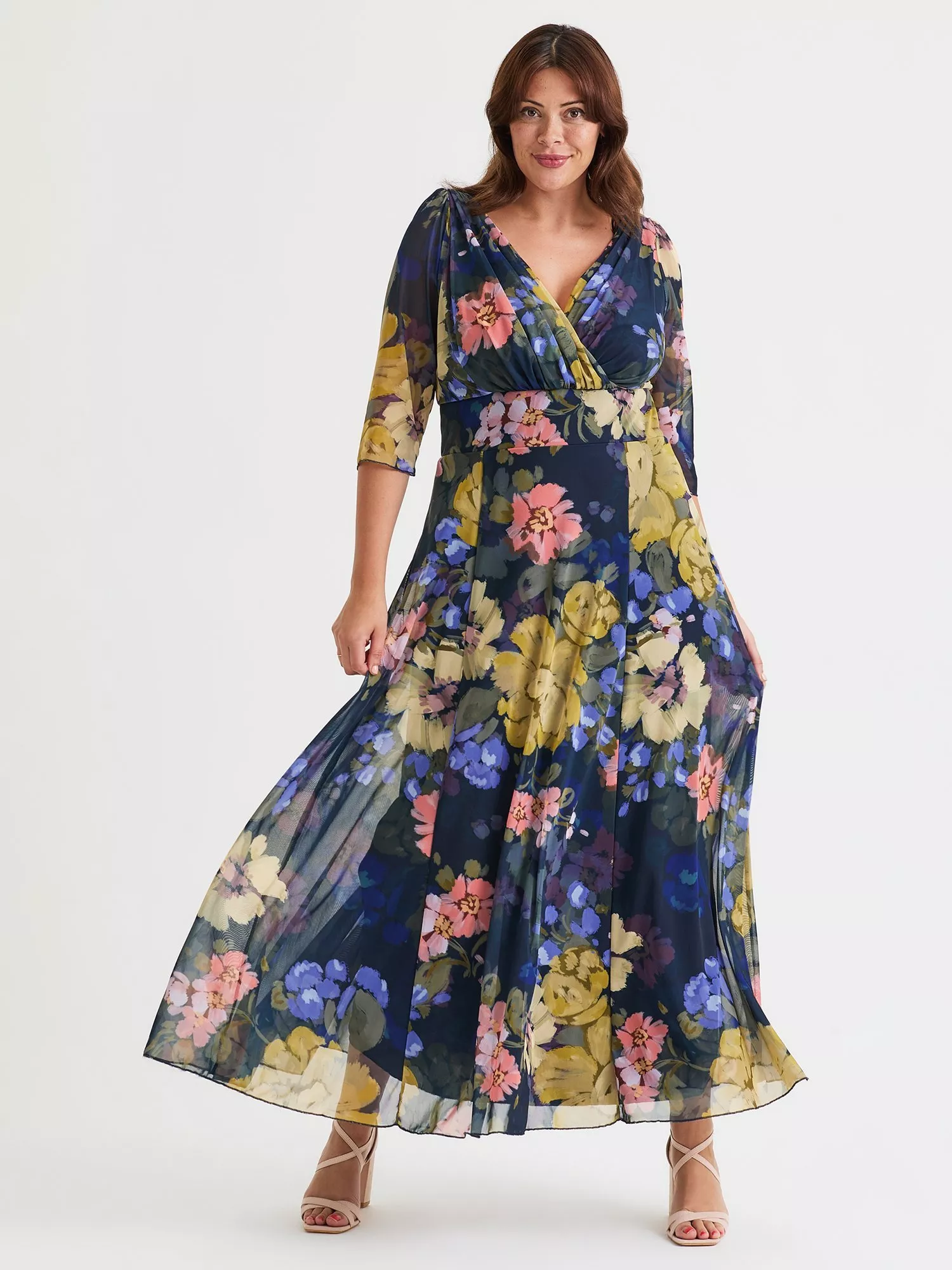 A stunning maxi gown. This truly beautiful print gown features a flattering wrap bodice supported by Scarlett & Jo's signature The MagicBand® that enhances shape. This gown made in a fabric that breathes, also features fully flowing skirt that tapers to swish and swirl. The dress has 3/4 sleeves set into a pretty shoulder line with small detachable shoulder pads.