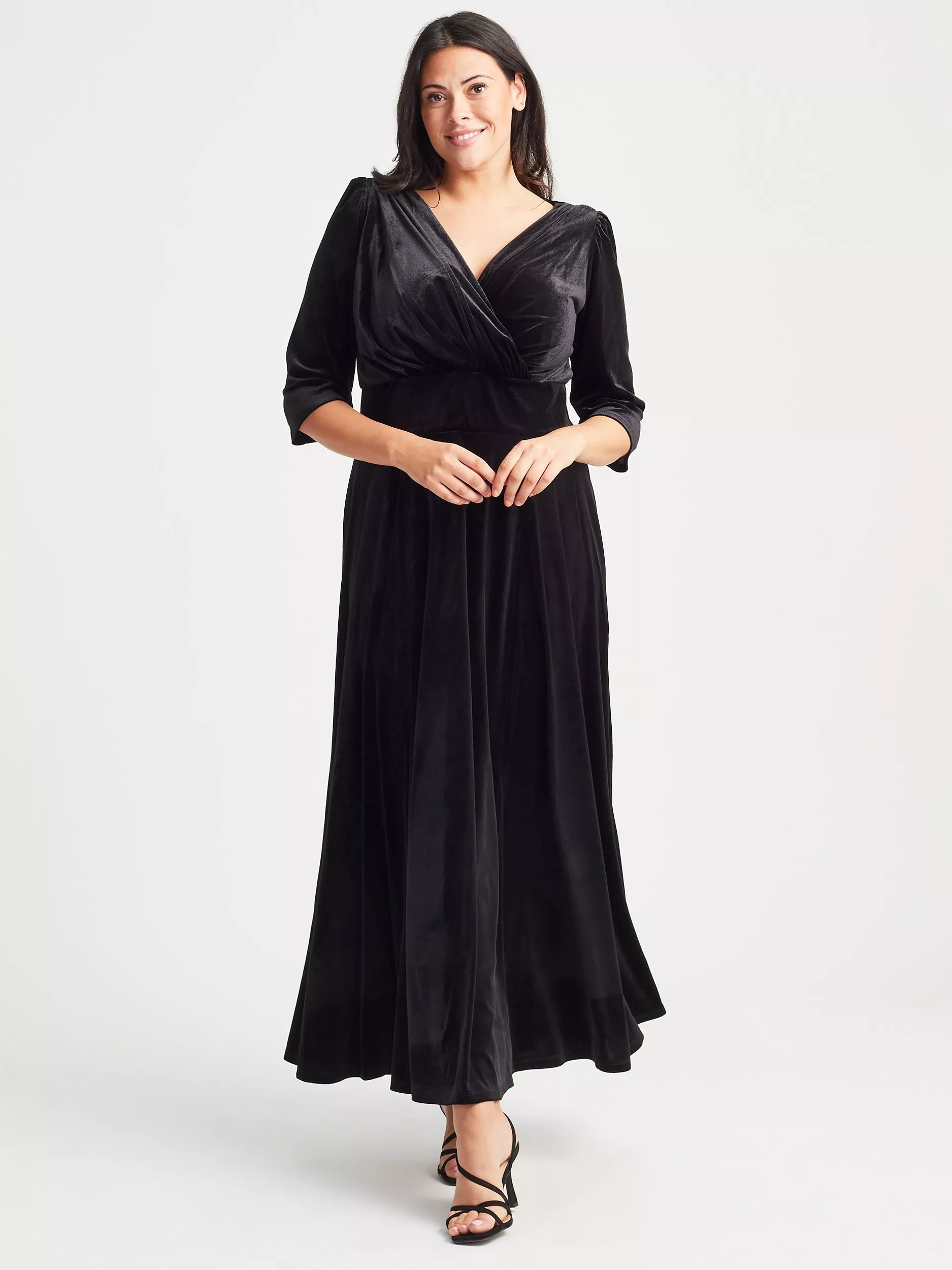 Flattering in all the right places, this floor-length dress from Scarlett & Jo is crafted from a blend of fabrics. With a universally flattering v-neckline and elbow length sleeves, this style allows you to showcase its versatility.