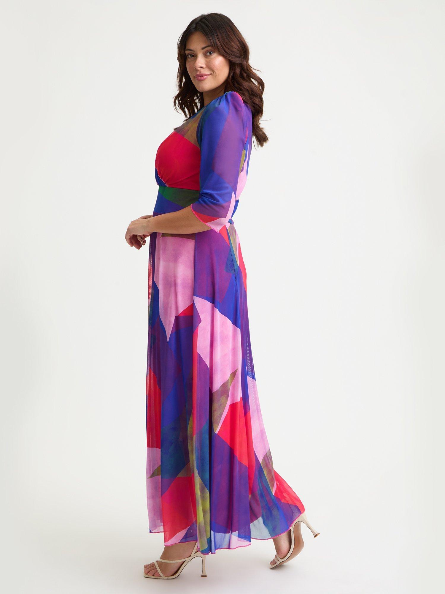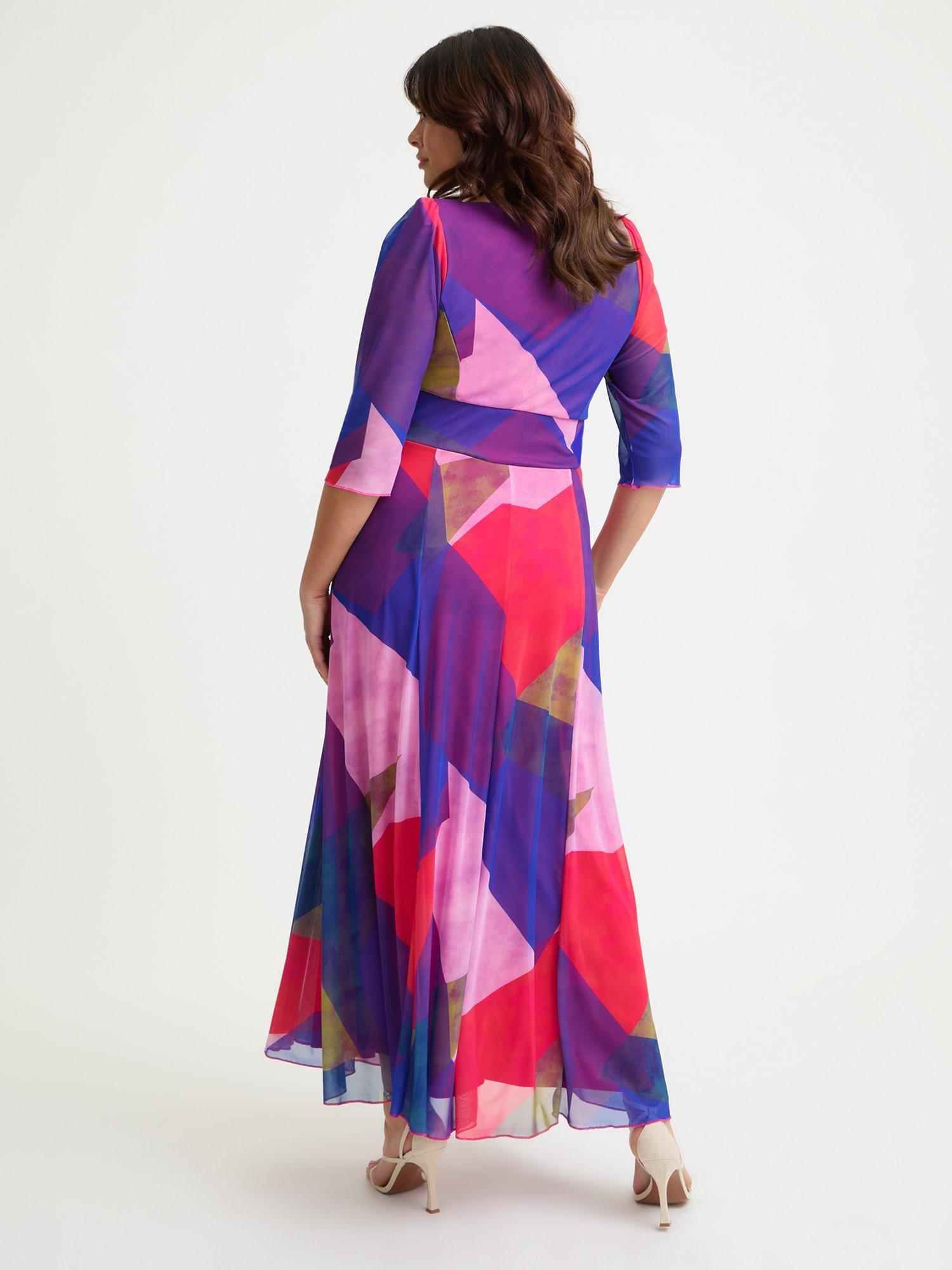 A stunning maxi gown. This truly beautiful print gown features a flattering wrap bodice supported by Scarlett & Jo's signature MagicBand® that enhances shape. This gown is made in our POWERFIT® soft and flowy stretch mesh, also featuring a fully flowing skirt that tapers to swish and swirl. The dress has 3/4 sleeves set into a pretty shoulder line with small detachable shoulder pads.
