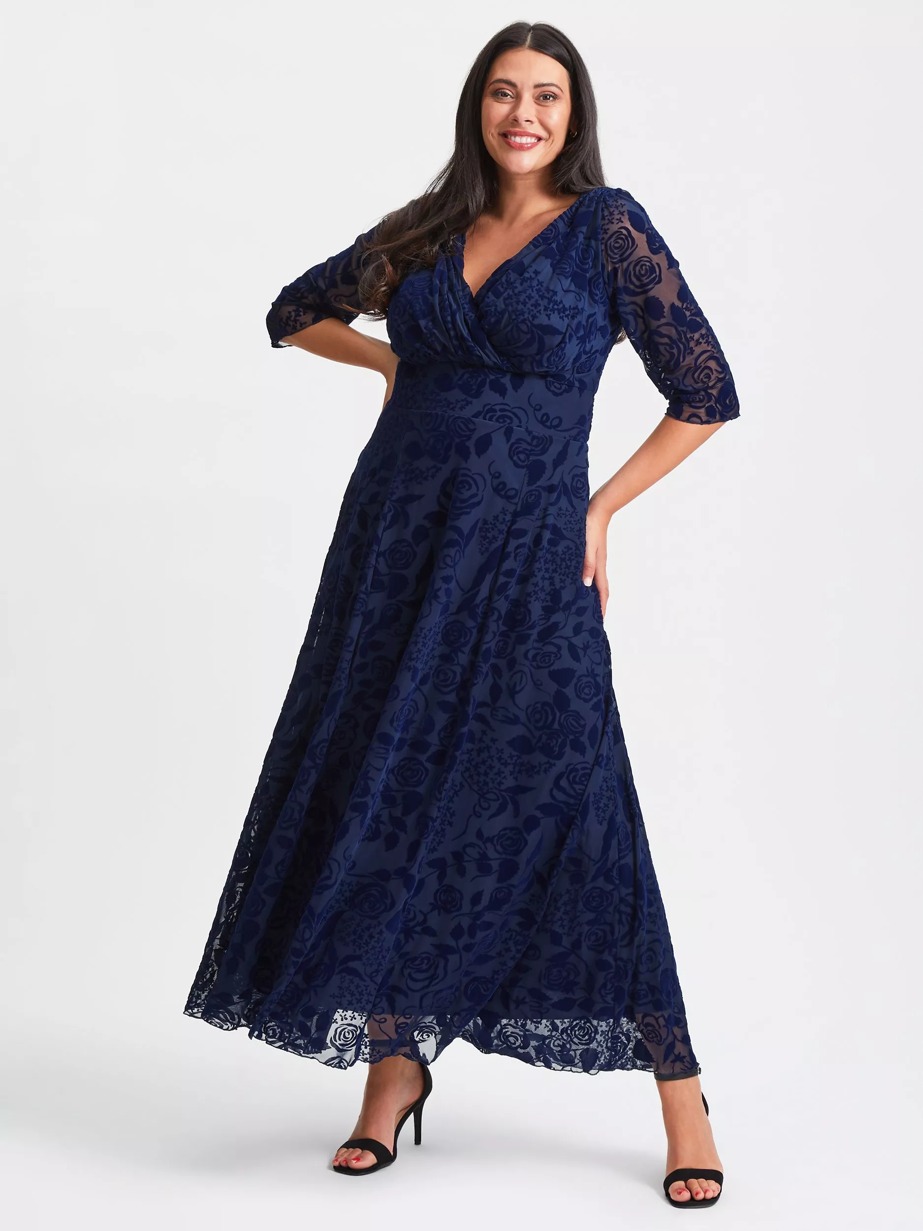 Flattering in all the right places, this floor-length dress from Scarlett & Jo is crafted from a blend of fabrics. With a universally flattering v-neckline and three quarter length sleeves, it blooms with joy through a refreshing floral print.