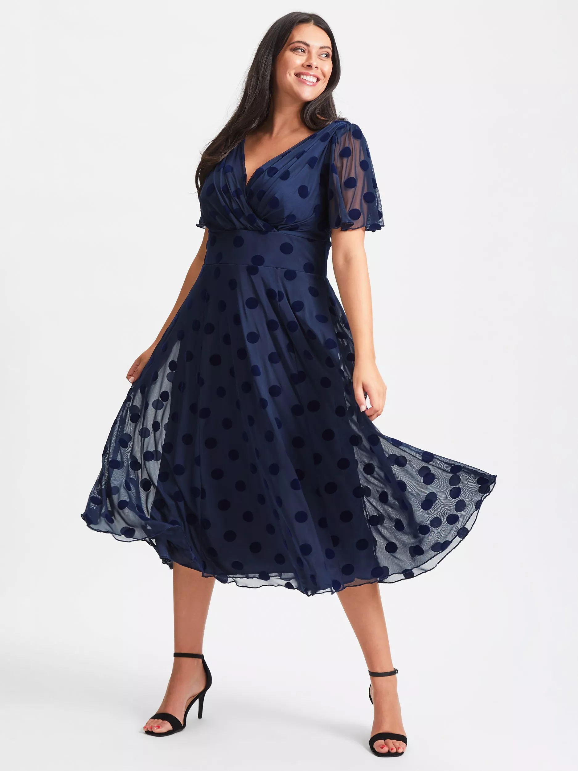 A tried-and-true favourite, this midi dress from Scarlett & Jo is made using a blend of fabrics. With a fuss-free but smart v-neckline and short sleeves, it revives this original print in a new way with polka dots gracing its canvas.