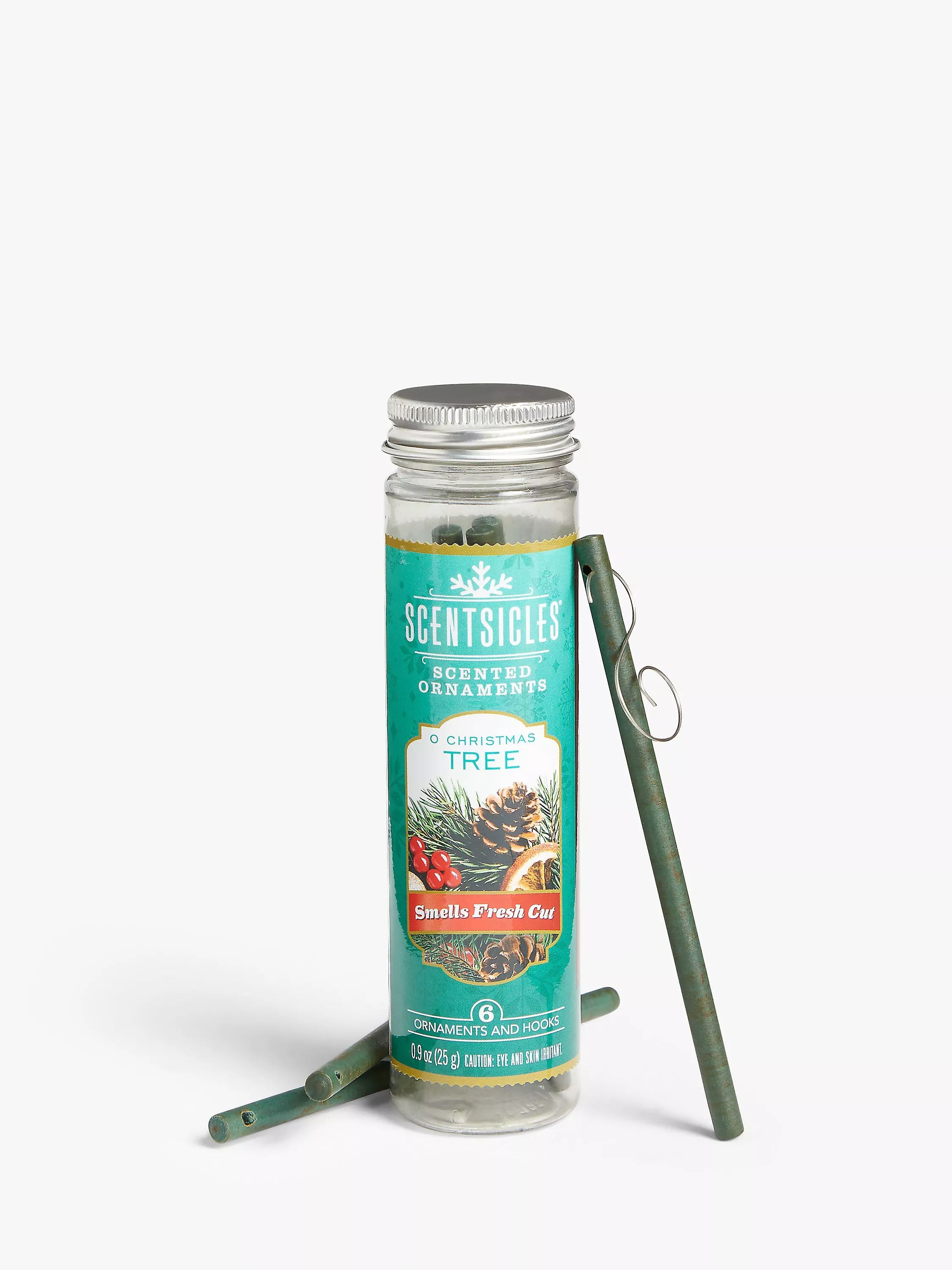 A jar of 6 scented paper tubes to hang among your tree decorations (hooks included). They will give your tree a fresh fragrance with notes of balsam fir, juniper berries, cedarwood and clementine.