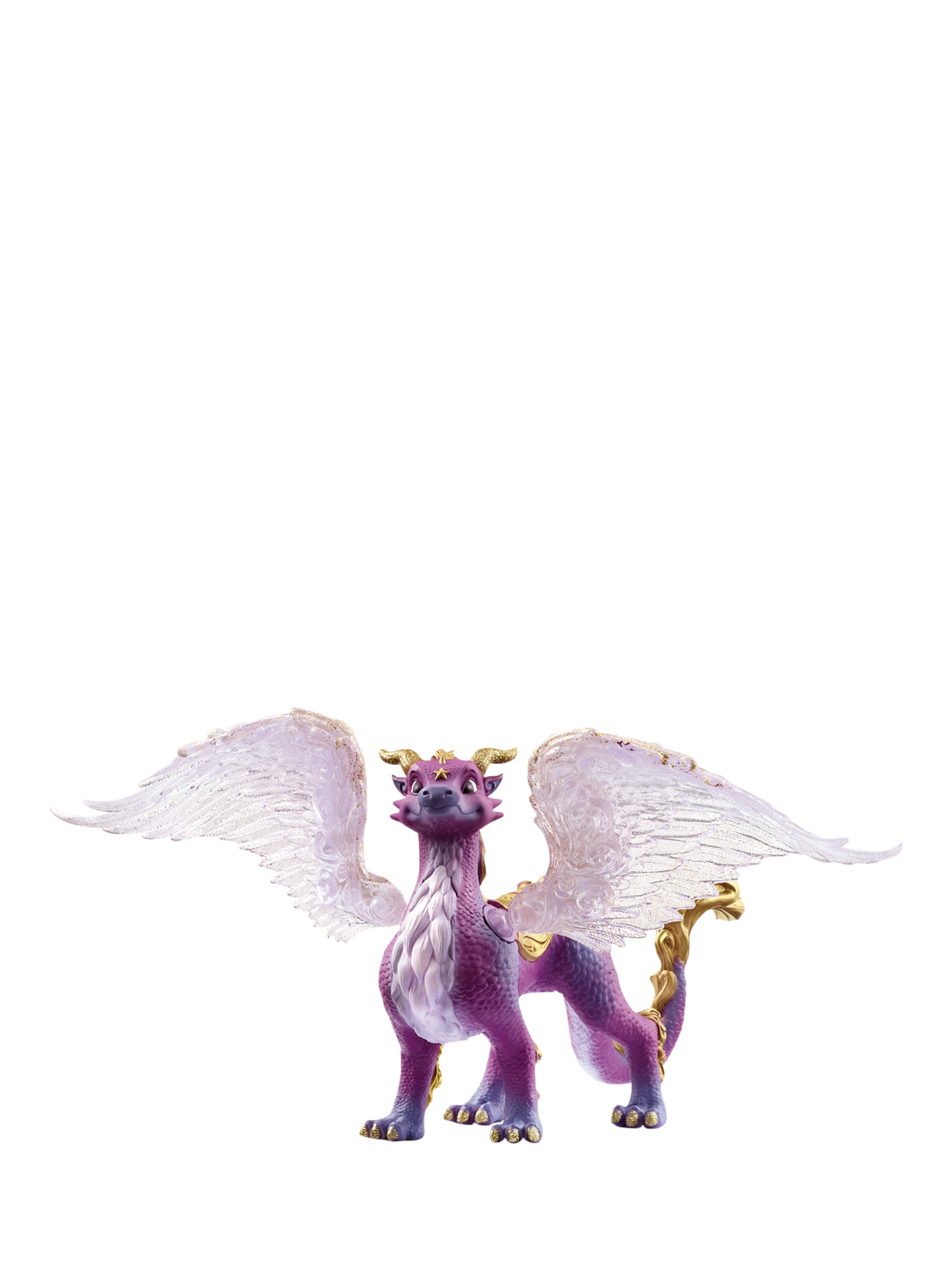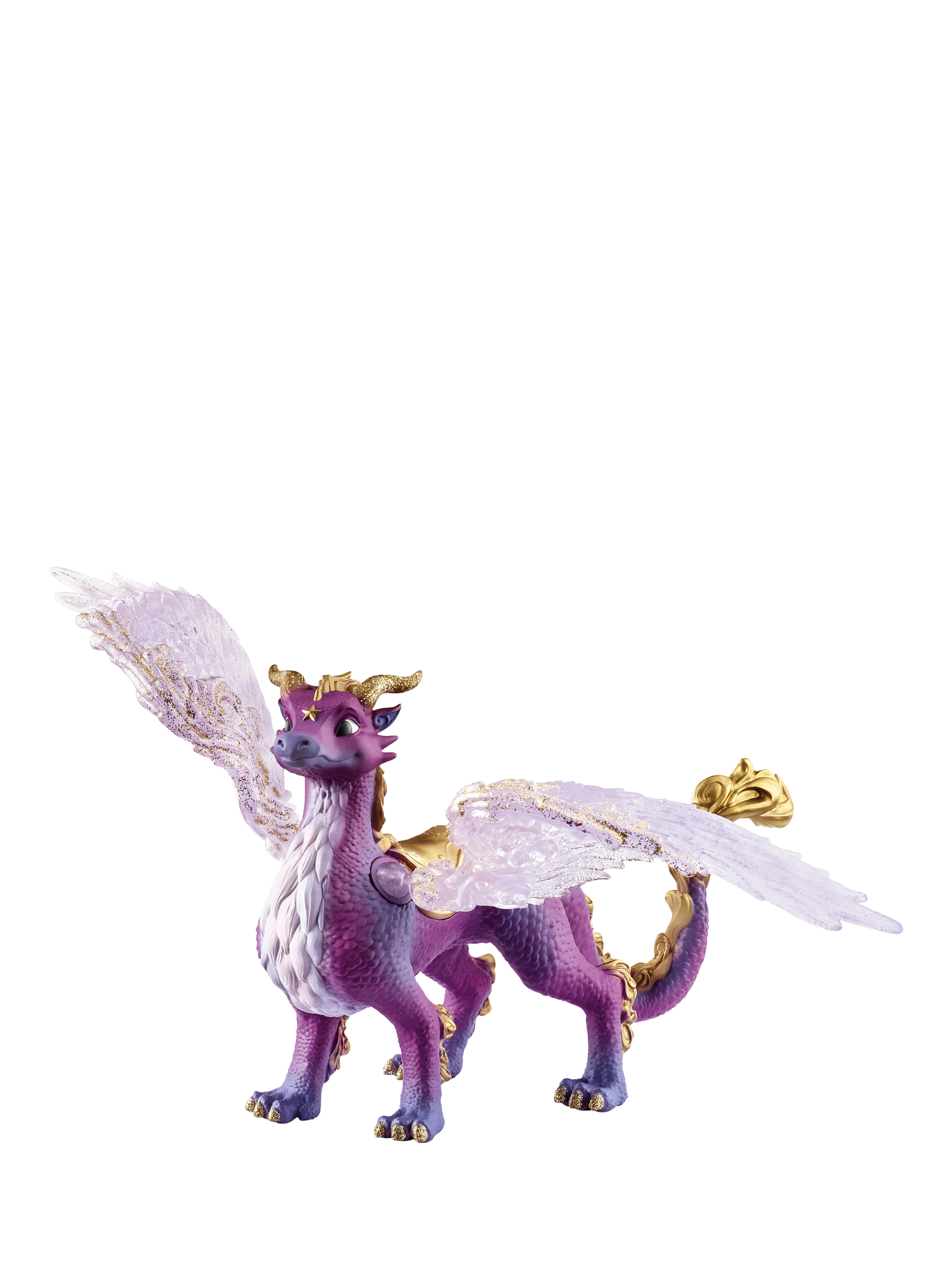 The Night Sky Dragon looks quite impressive with the golden star on his forehead, his dark purple scale armour and his bright, transparent wings. His tail is adorned with golden curls that flicker like flames. But if you look at the Night Sky Dragon's face, you want to be its friend.