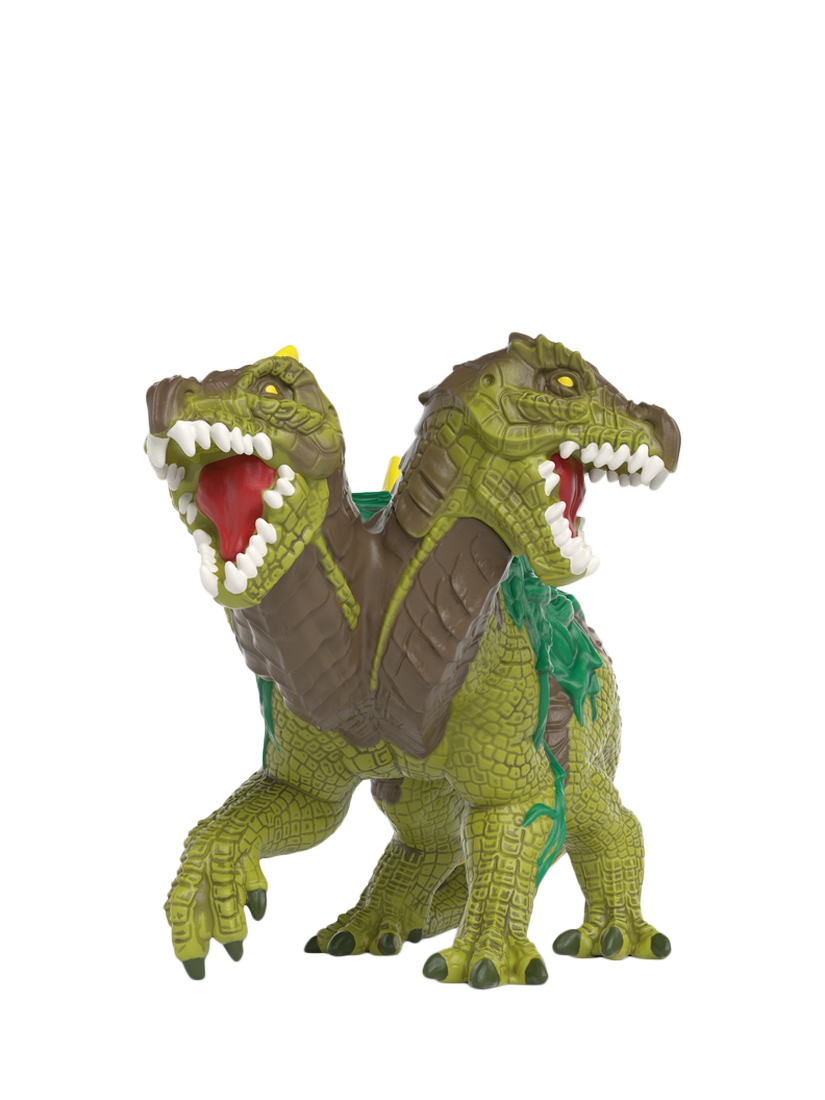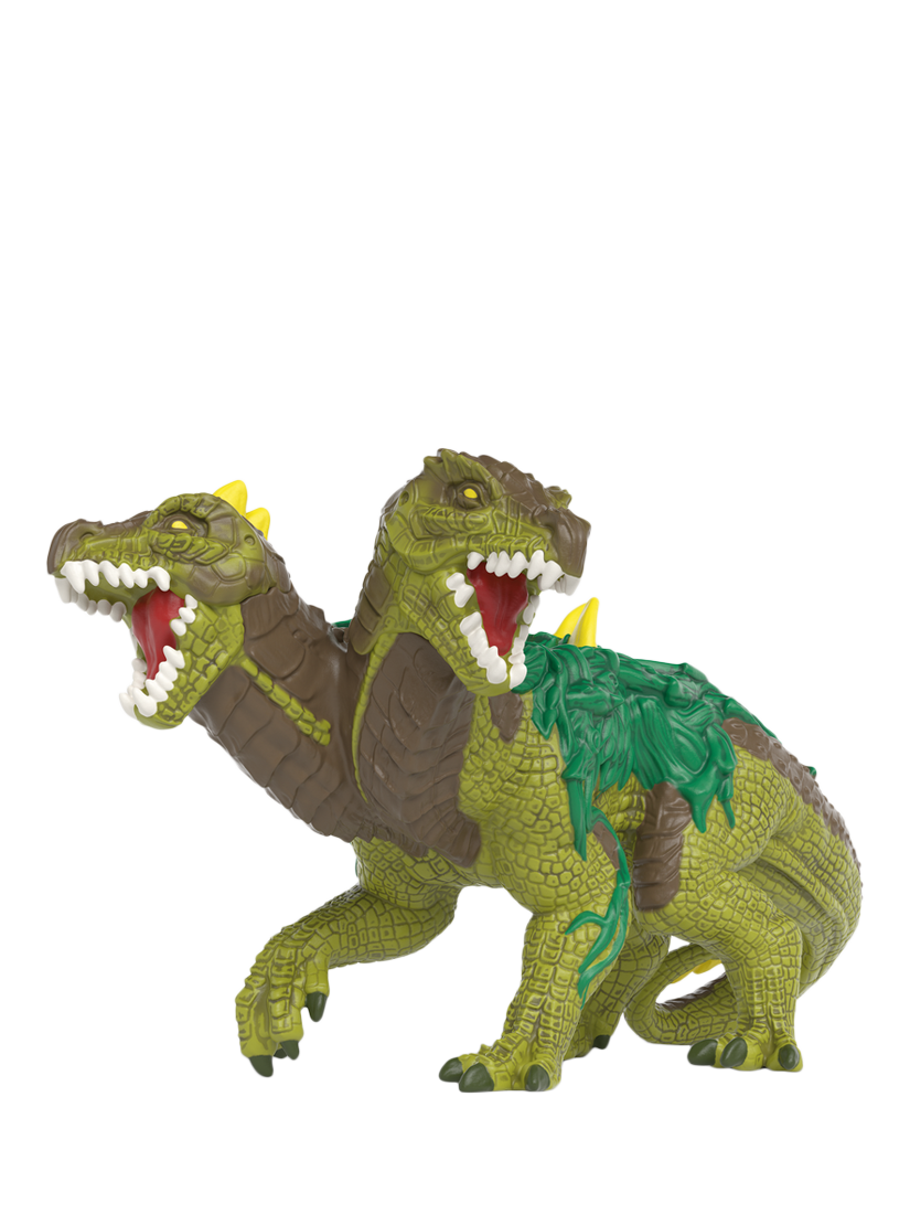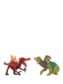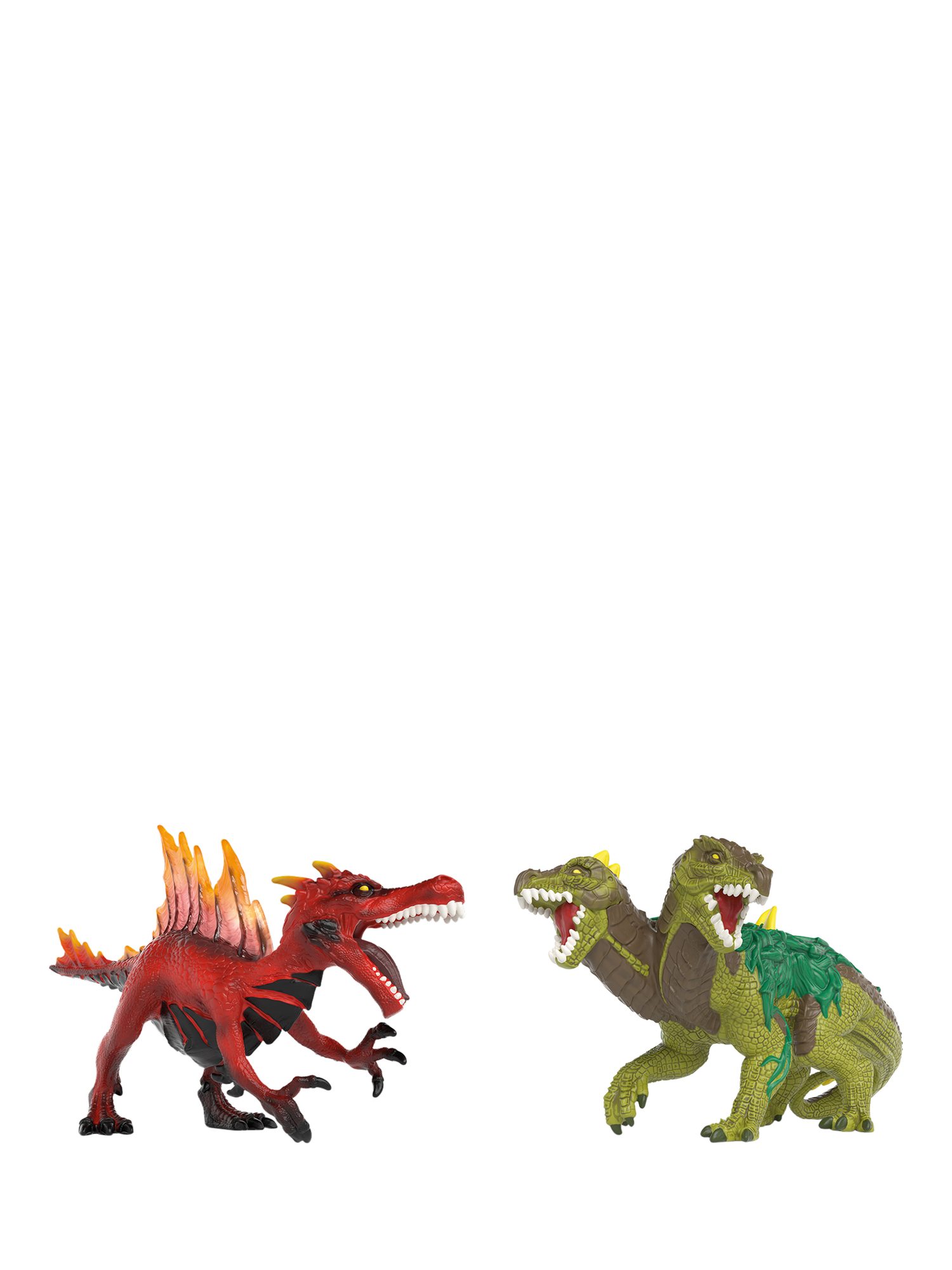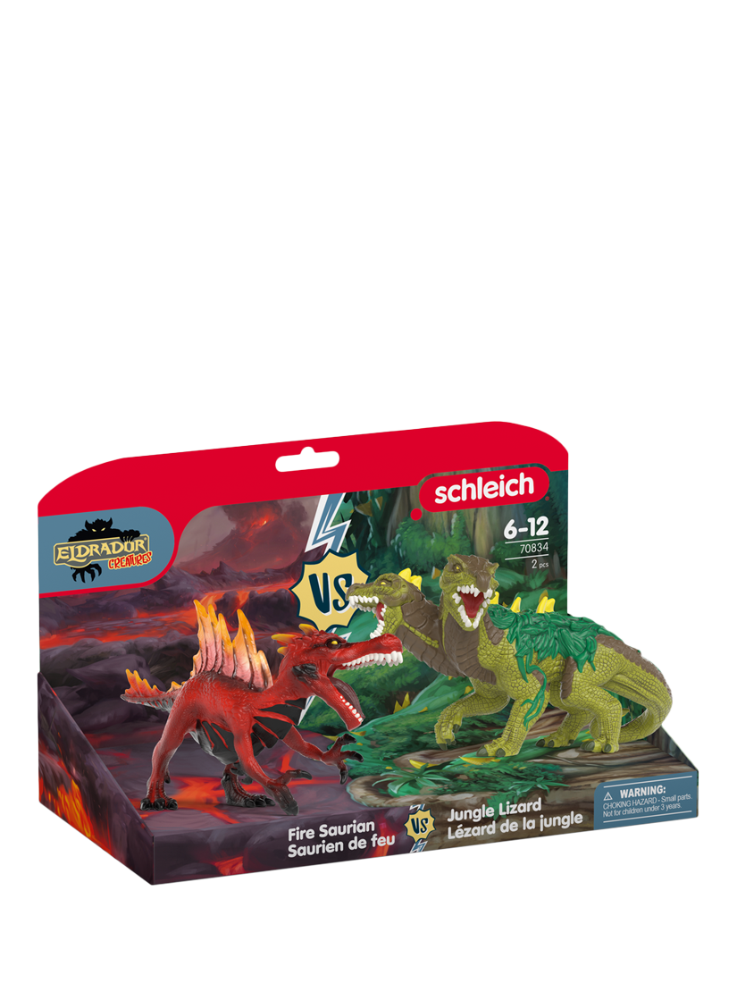 The Fire Dinosaurs and Jungle Lizards clash in a nerve-racking battle! The Fire Dinosaur lets out a mighty roar and bares its razor-sharp teeth. Oh no! The Jungle Lizard has two heads. With two powerful jaws, it's ready to crush its attacker. Who will emerge victorious in this battle set from schleich? Better keep your distance!