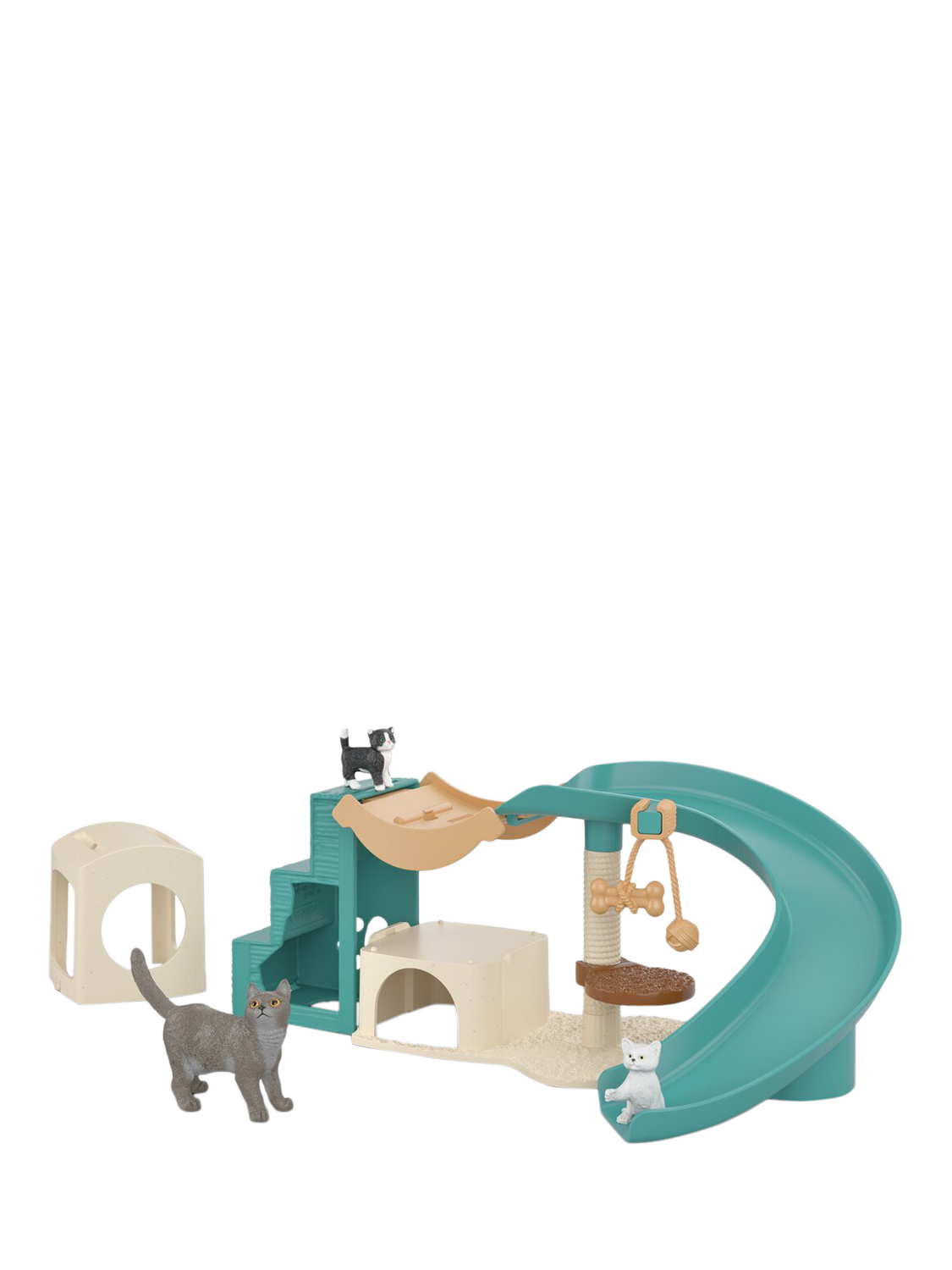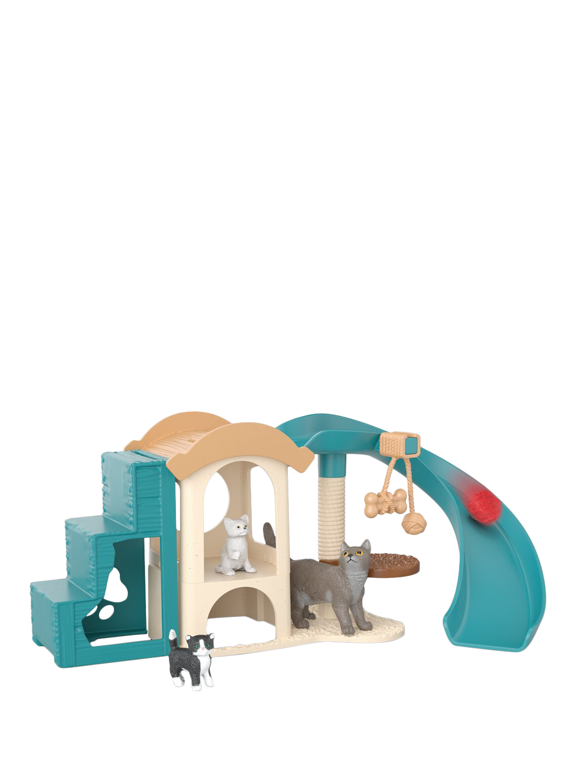 The play area for cats guarantees fun for every velvet paw! In the cute cat house, kittens will find a safe retreat to rest and relax after a romp. The stairs and slide invite little velvet paws to make their first attempts at climbing. The scratching post offers additional playtime fun for the cat with its two kittens.