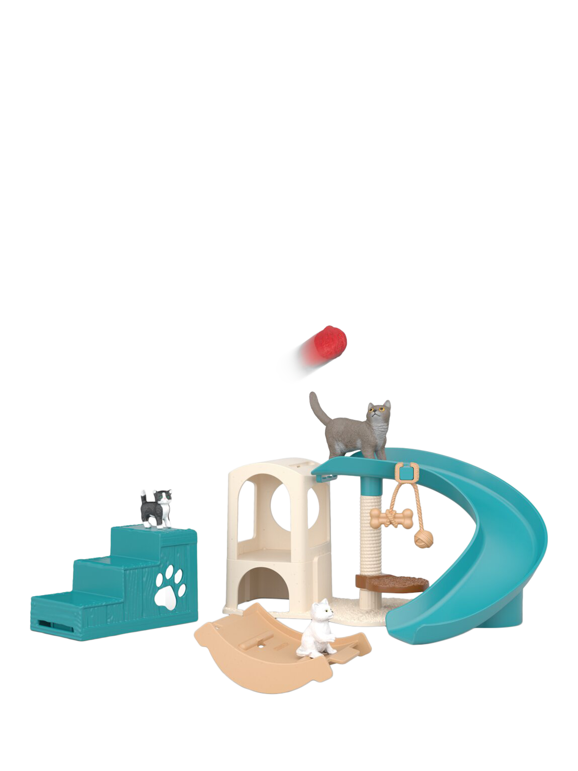 The mum cat proudly keeps an eye on everything. After a while, it's time to rest and make themselves comfortable in the cat house. Afterwards, the little ones can play again. Maybe a go on the seesaw? Meanwhile, the big cat will be having fun on the scratching post.