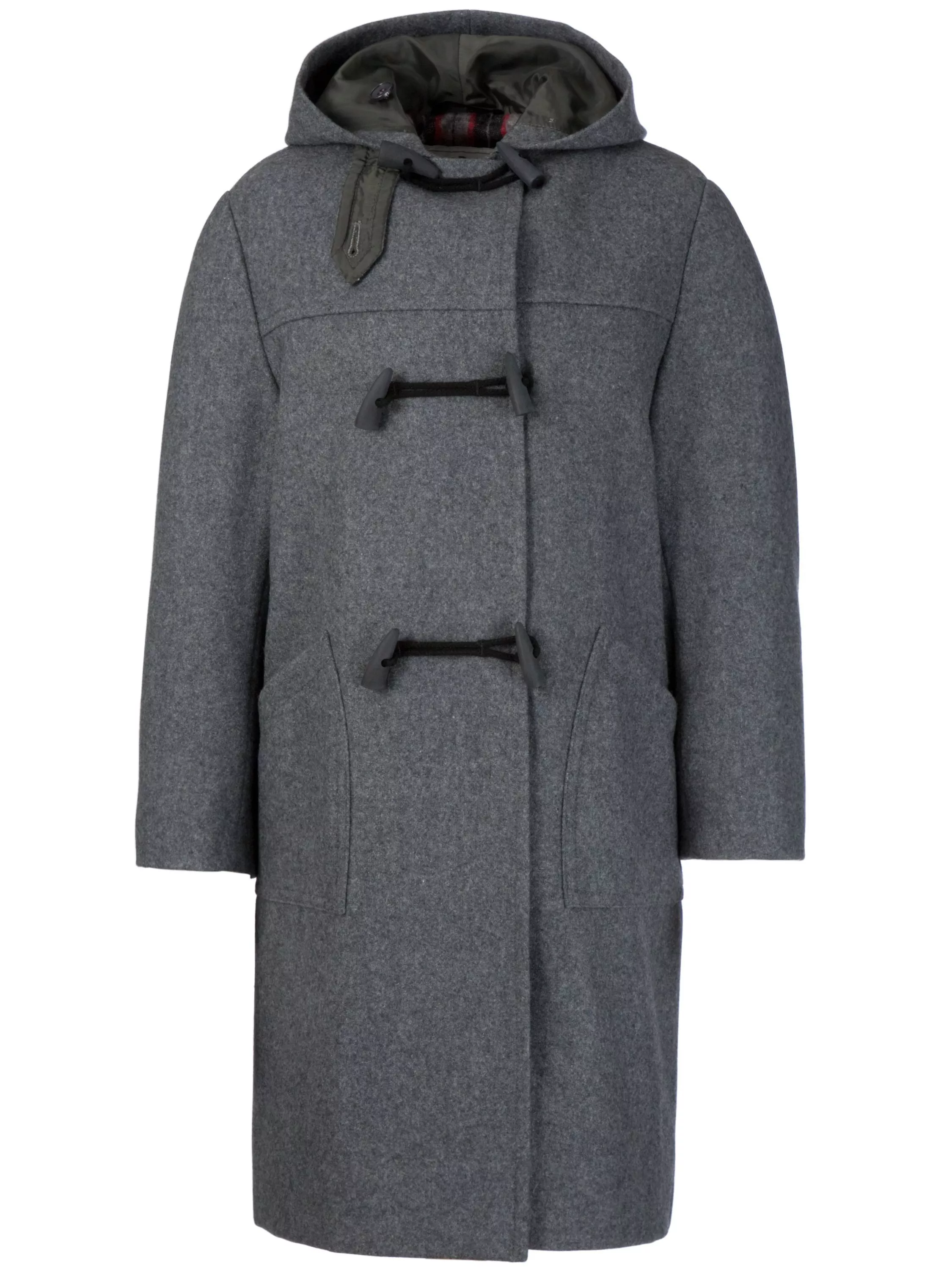 Plain grey duffle coat with classic double breasted style, hood and toggles.